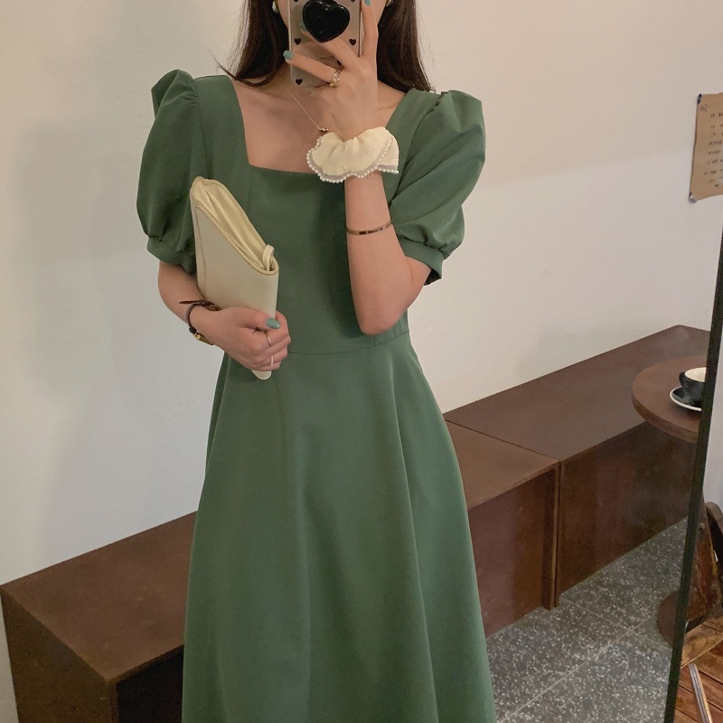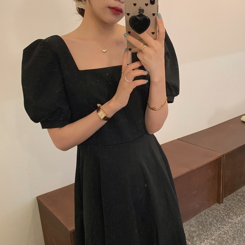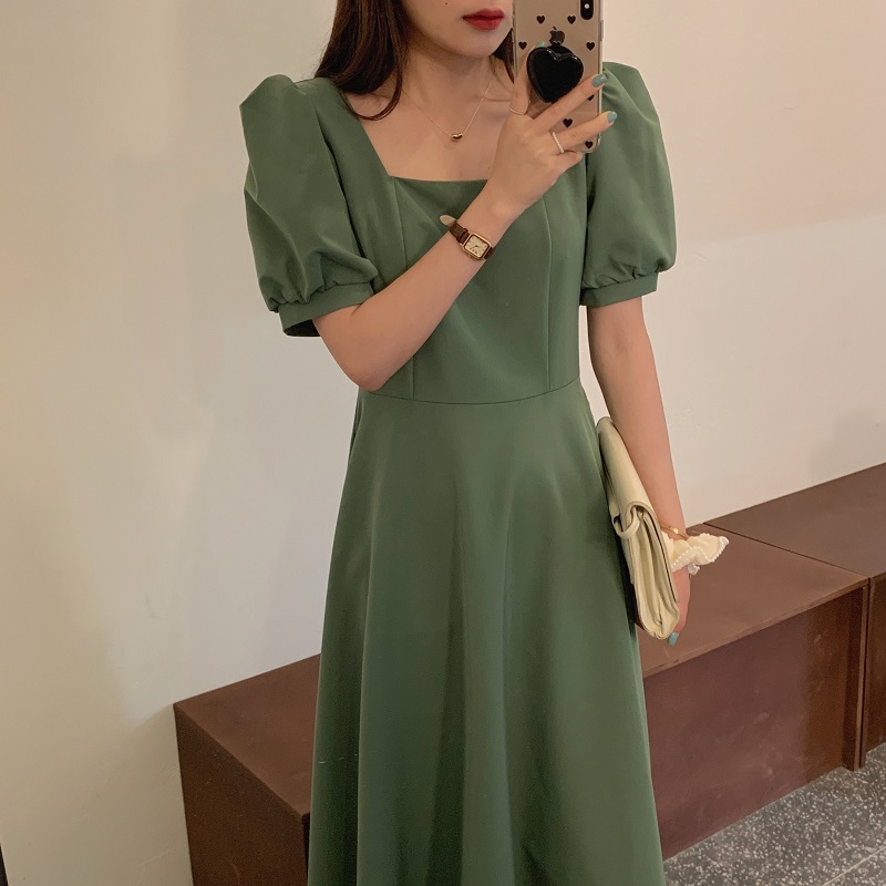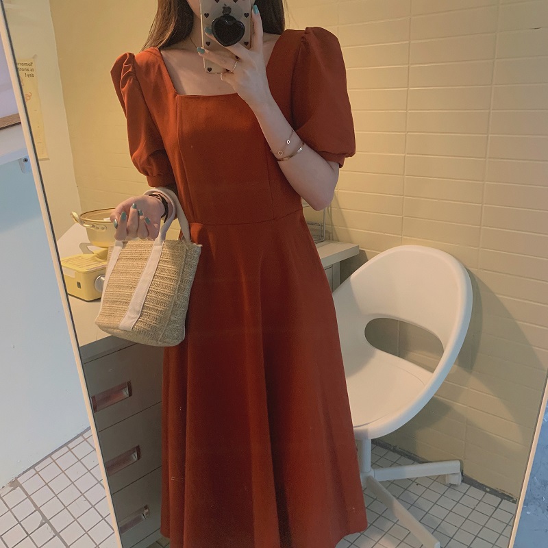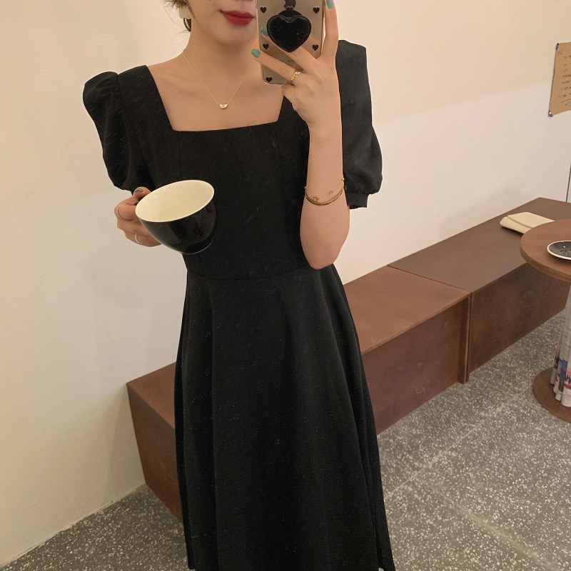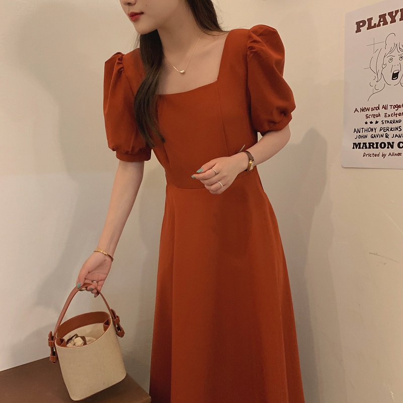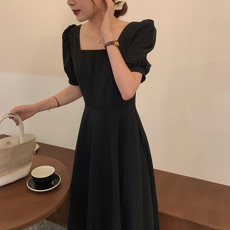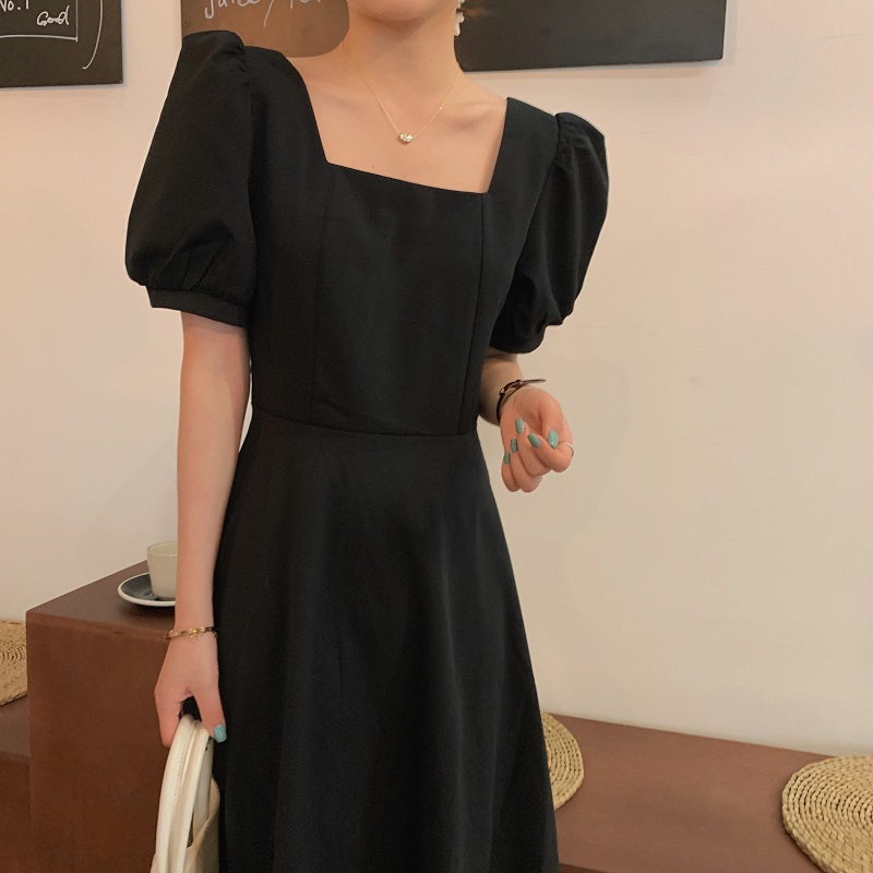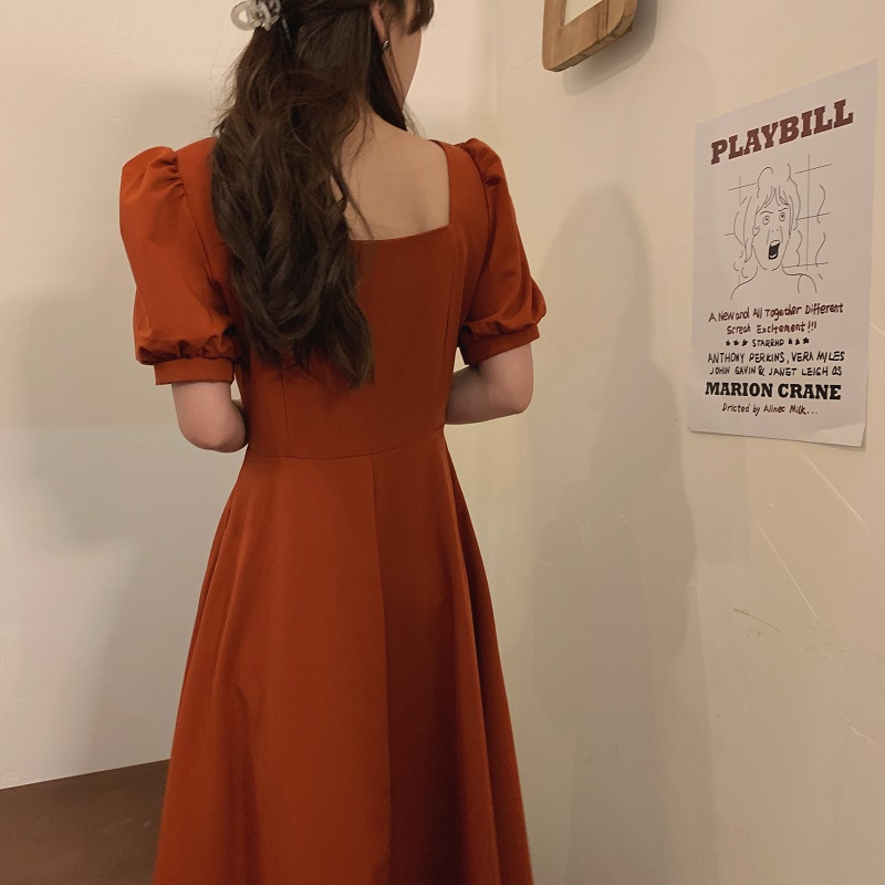 实拍 法式气质优雅赫本风方领收腰显瘦泡泡袖中长款连衣裙 现货