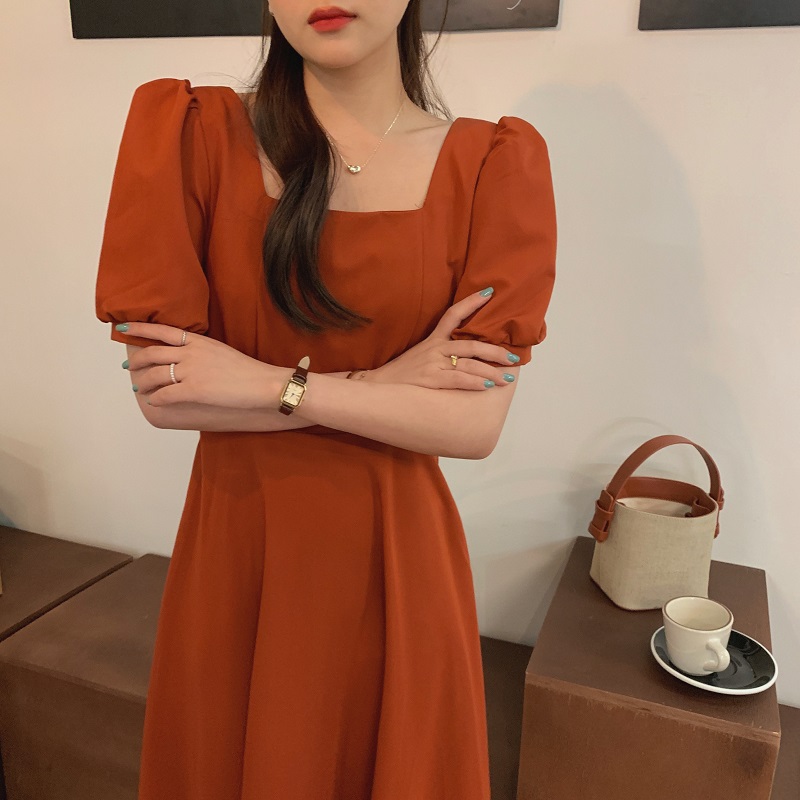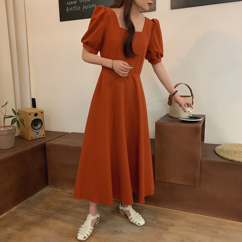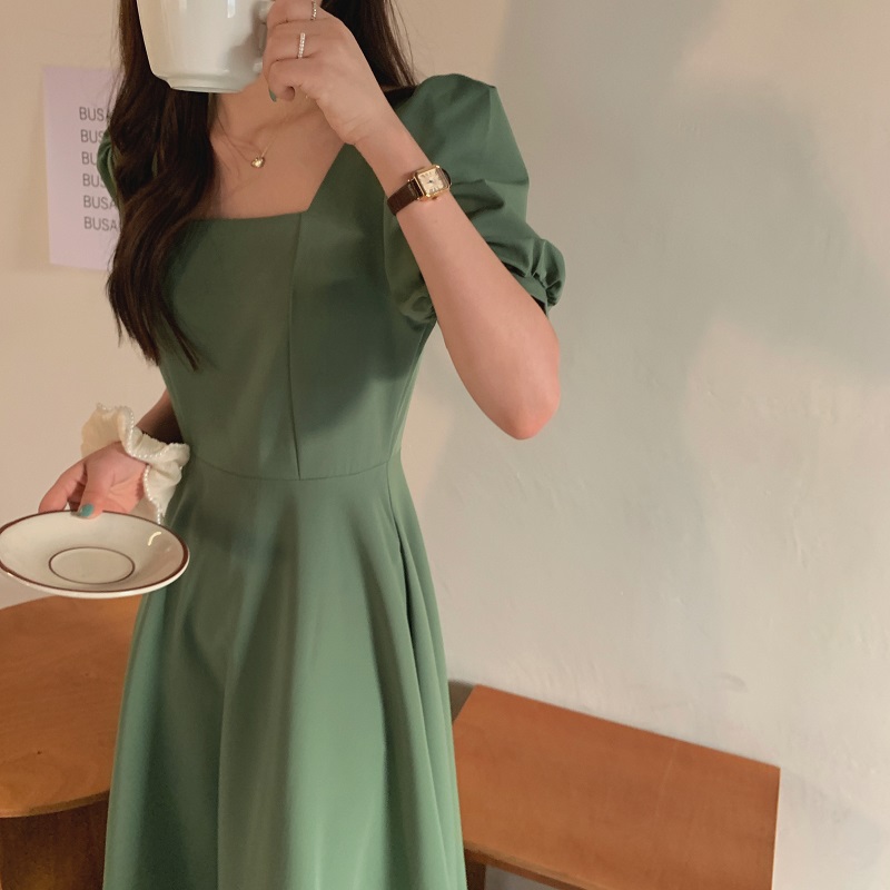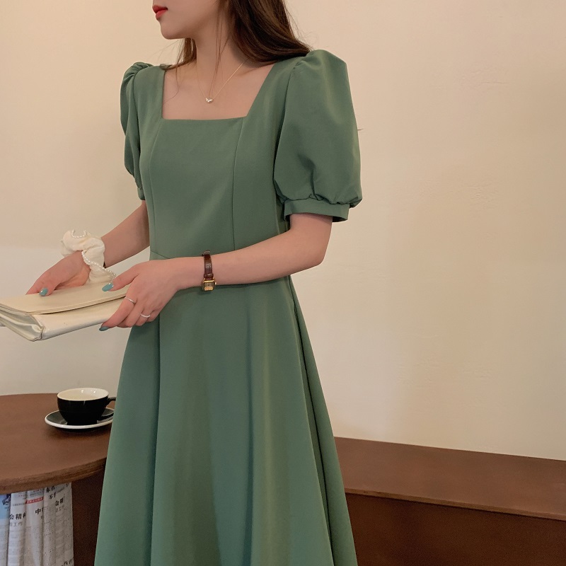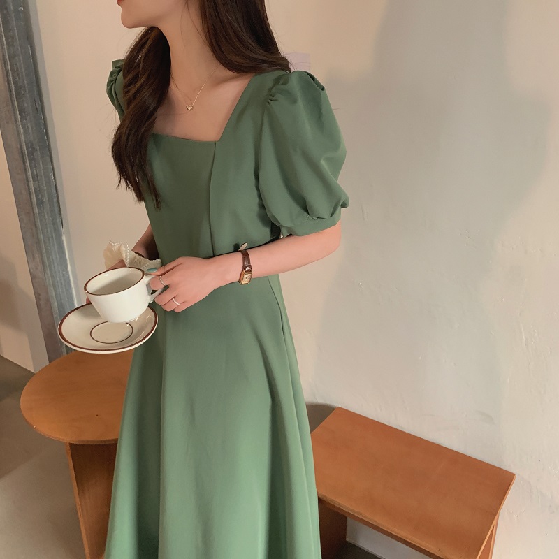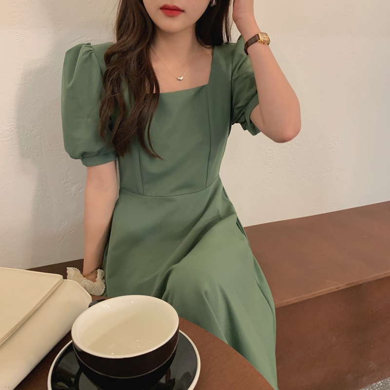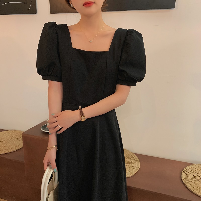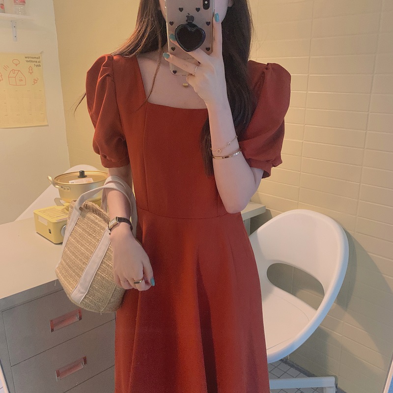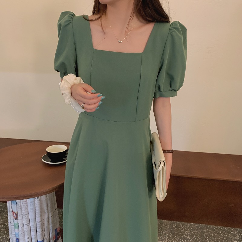 实拍 法式气质优雅赫本风方领收腰显瘦泡泡袖中长款连衣裙 现货