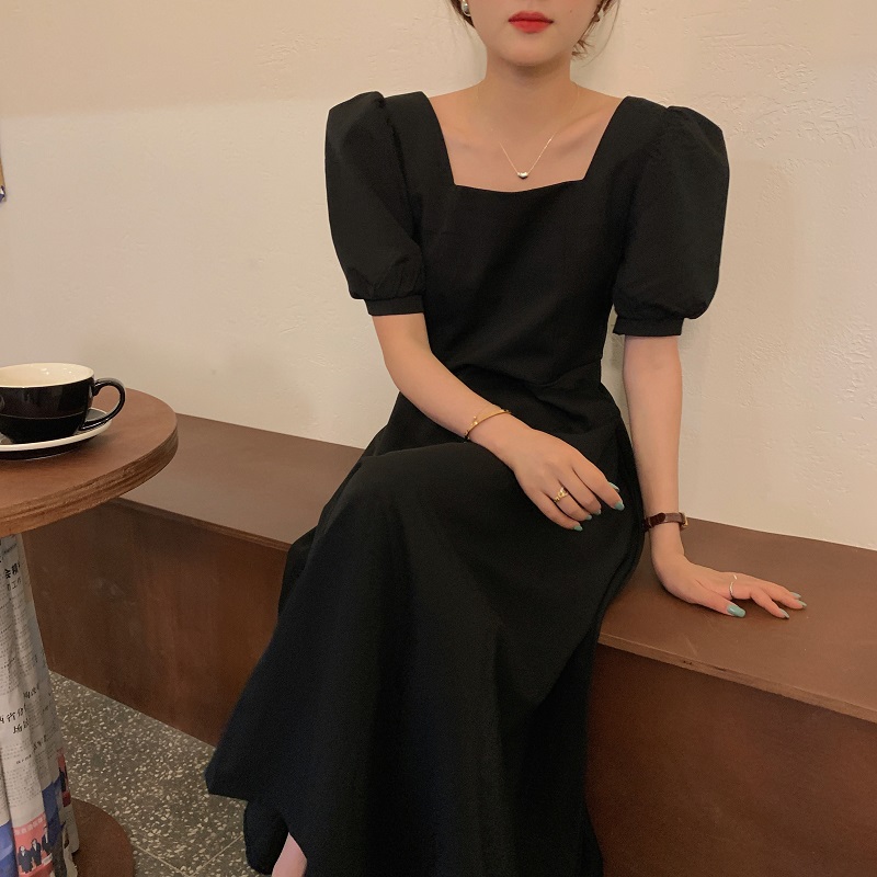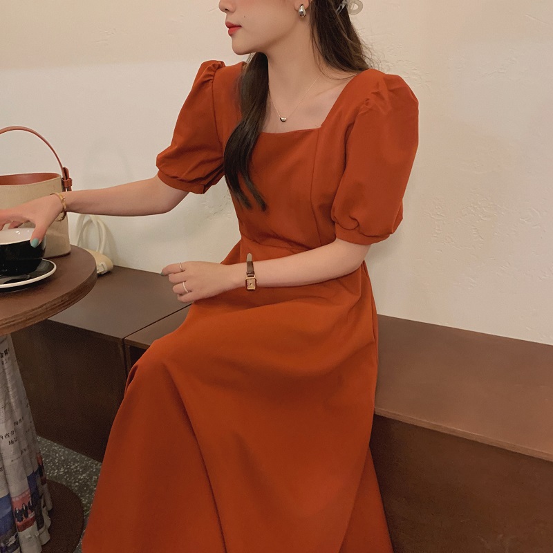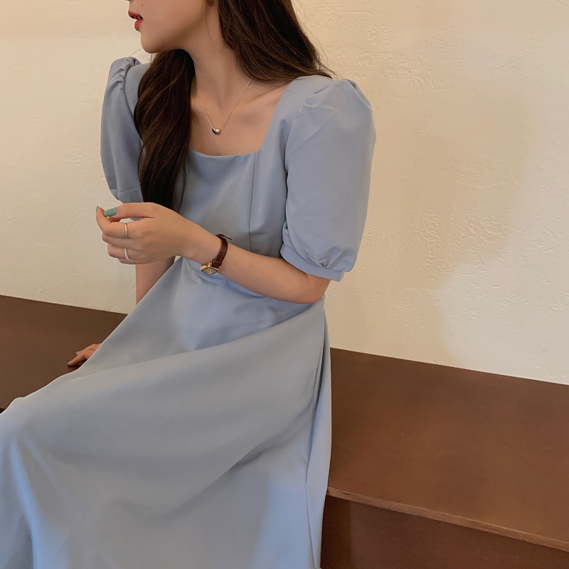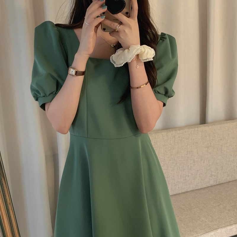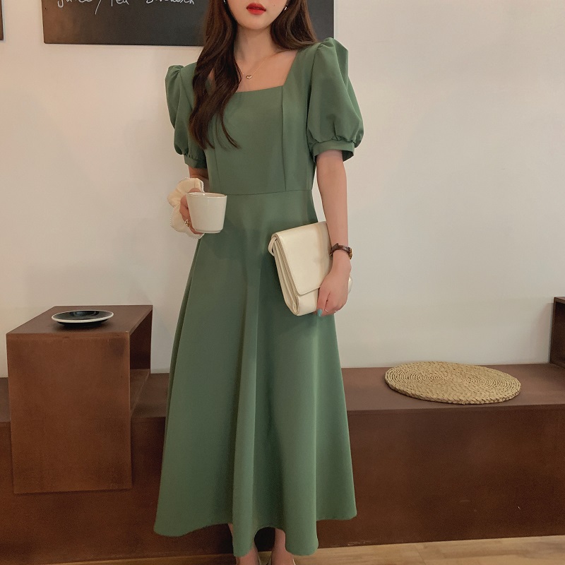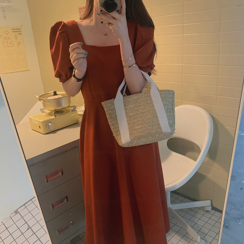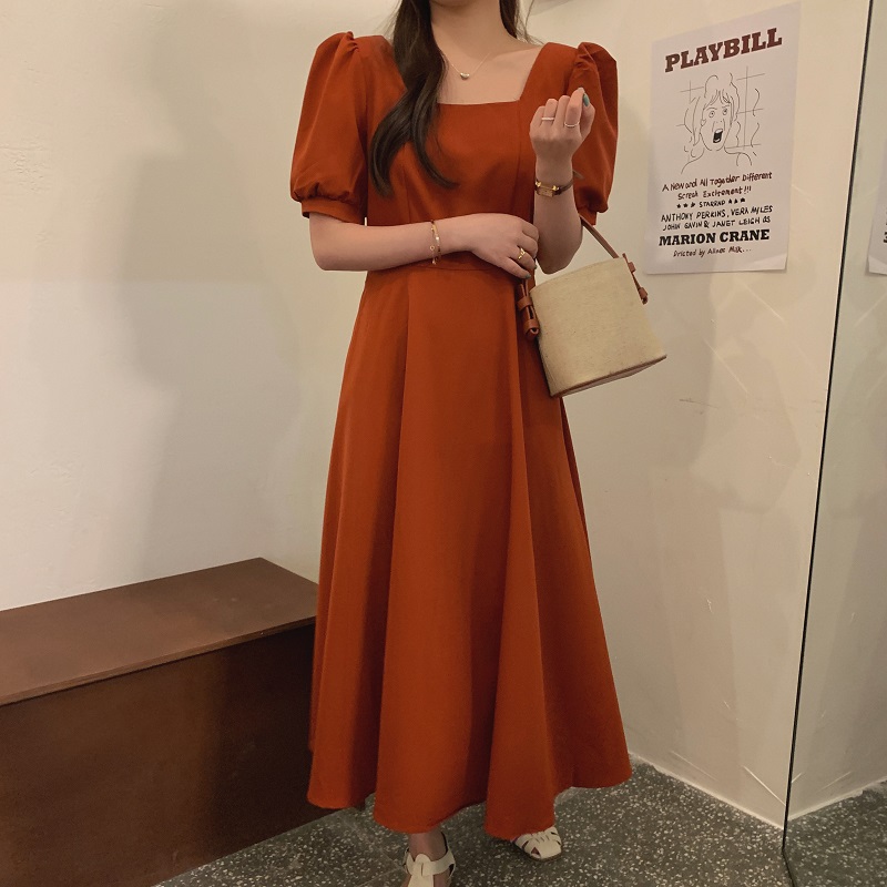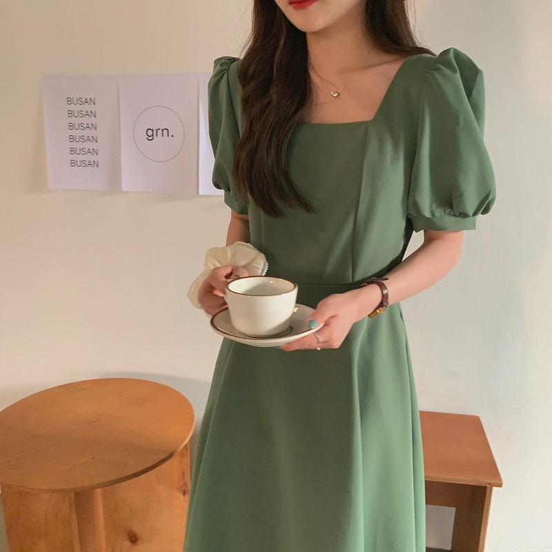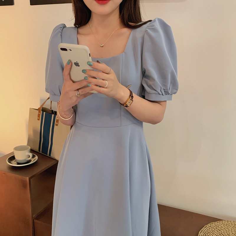 实拍 法式气质优雅赫本风方领收腰显瘦泡泡袖中长款连衣裙 现货