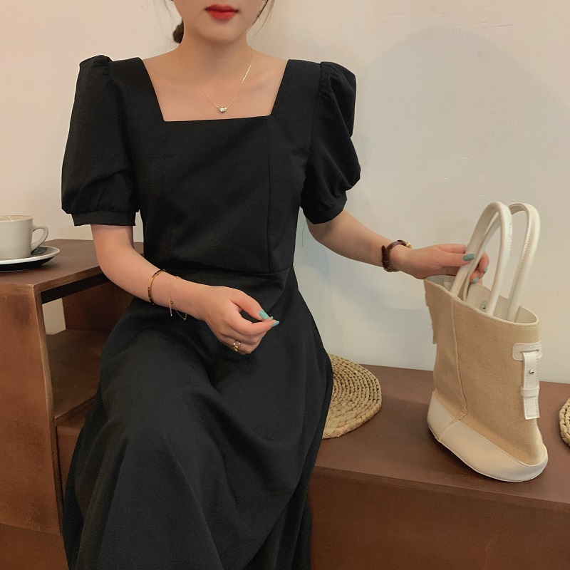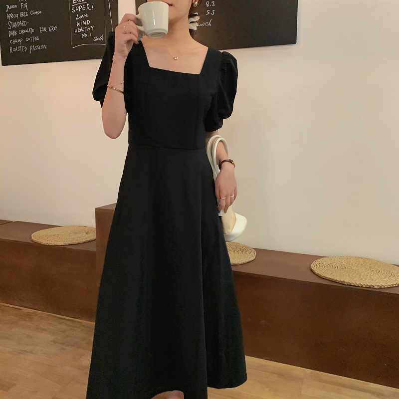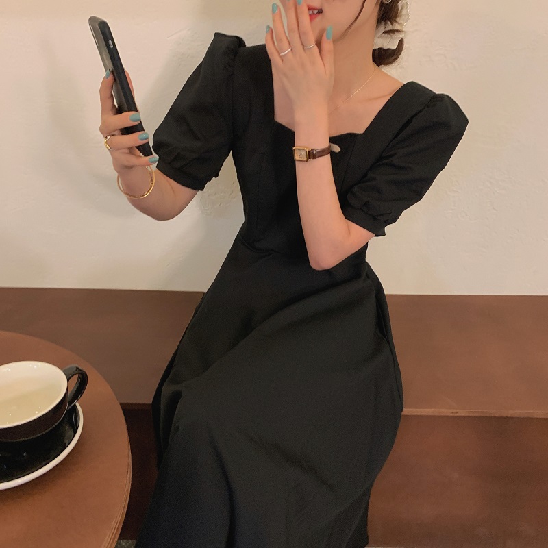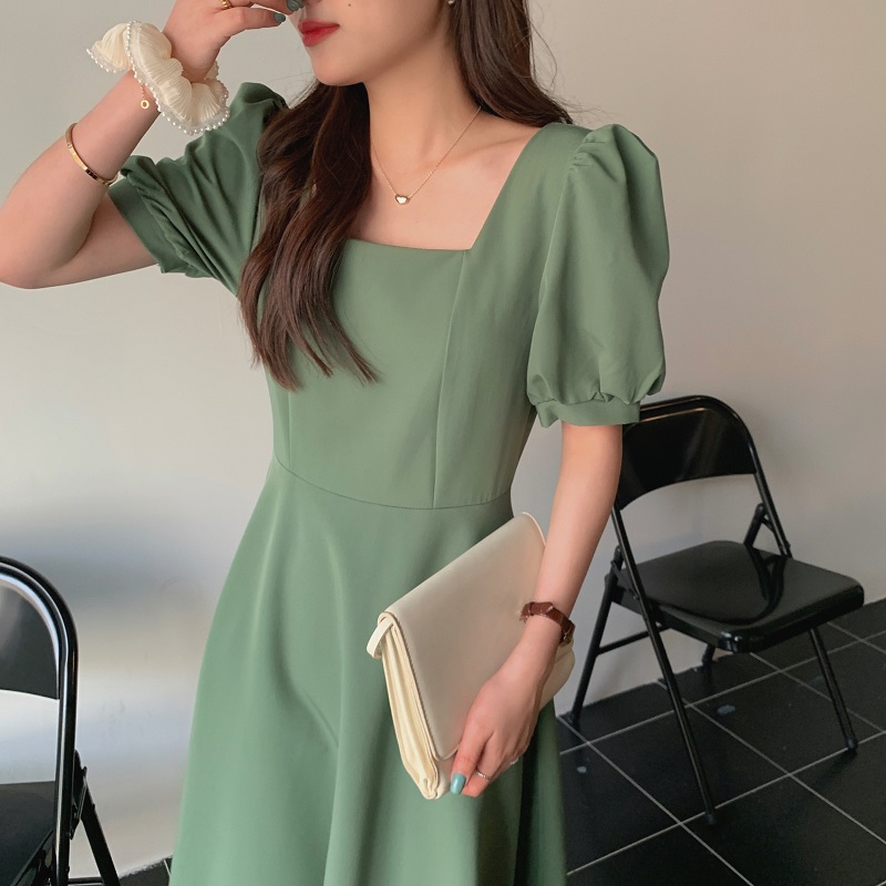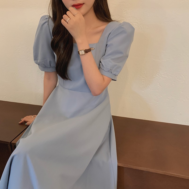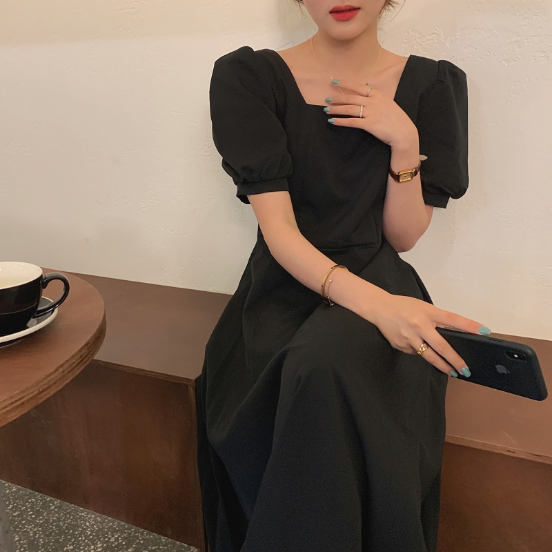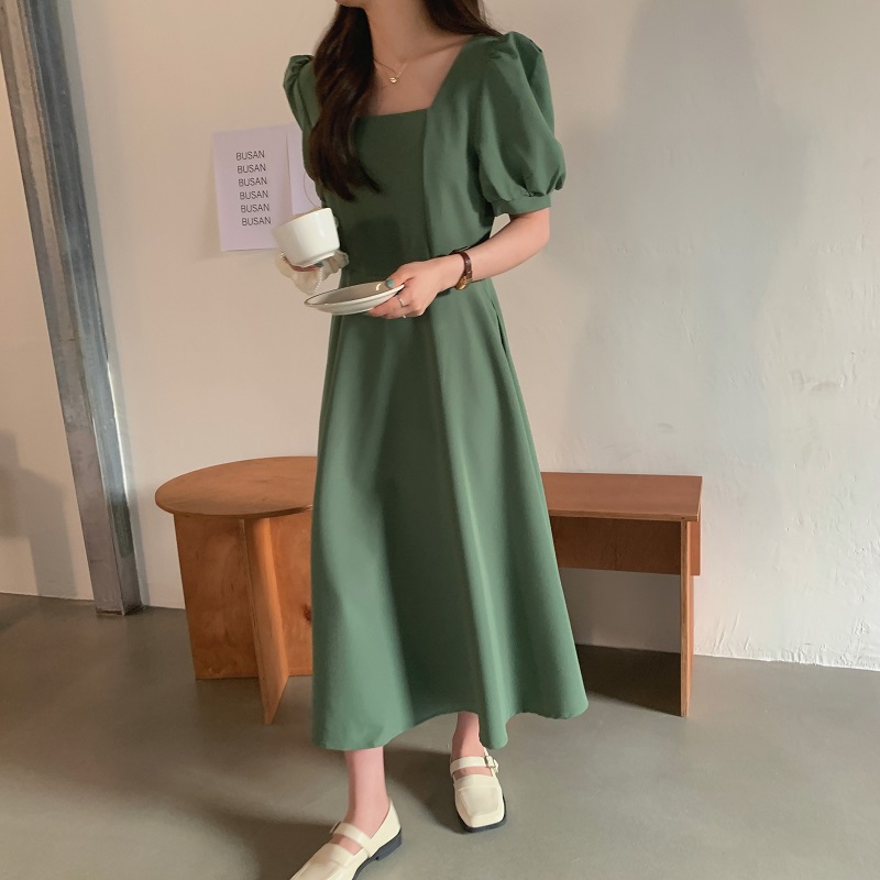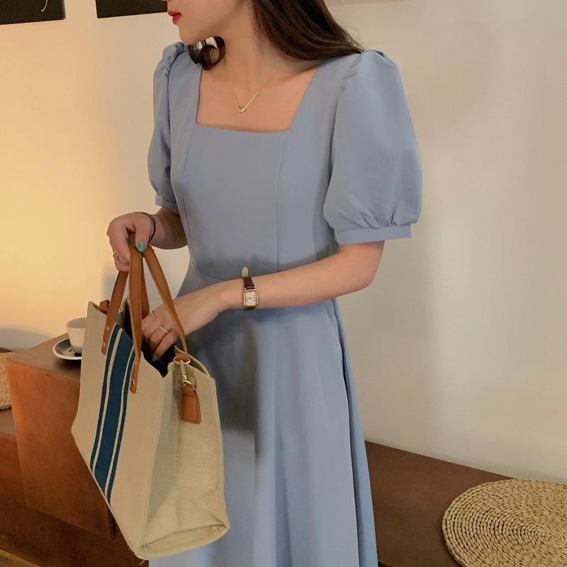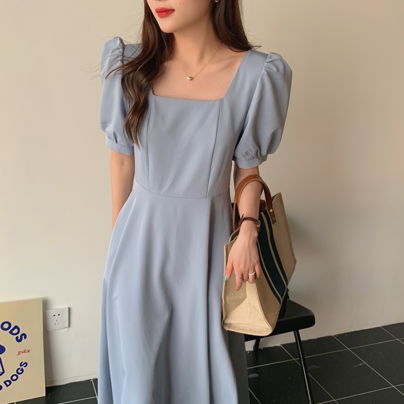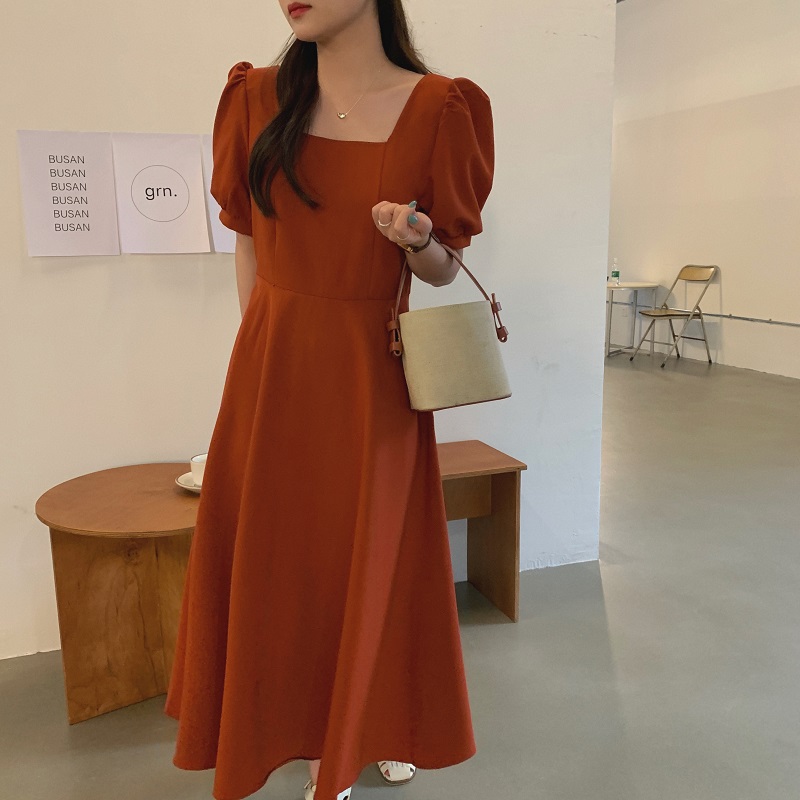 实拍 法式气质优雅赫本风方领收腰显瘦泡泡袖中长款连衣裙 现货