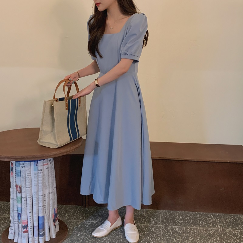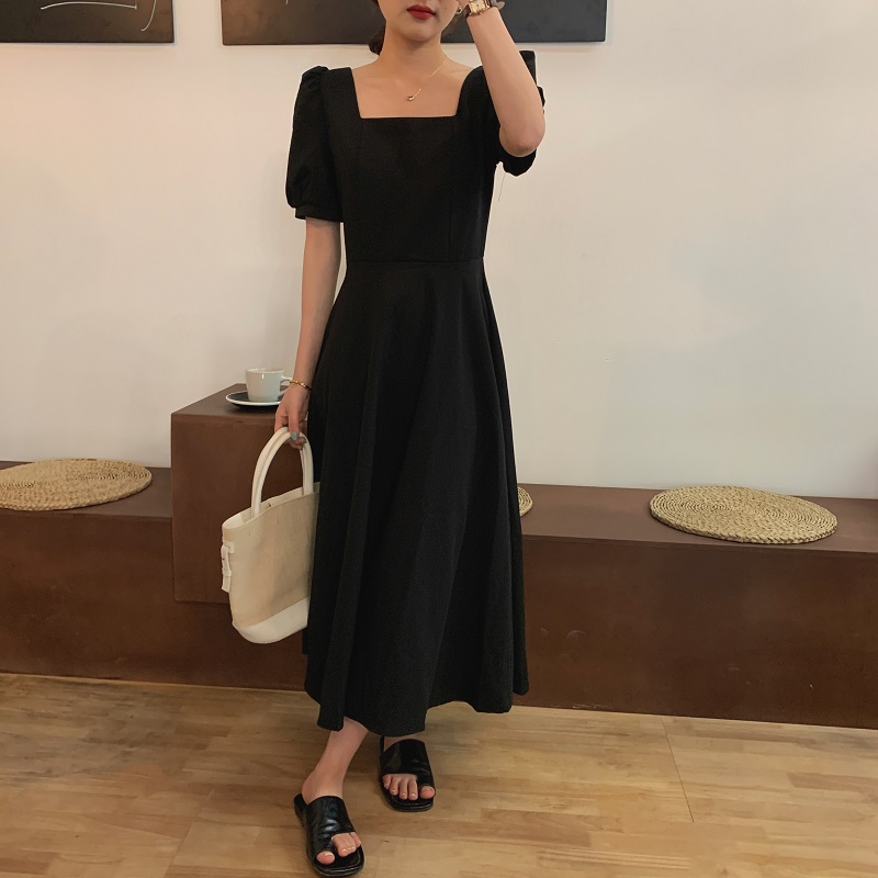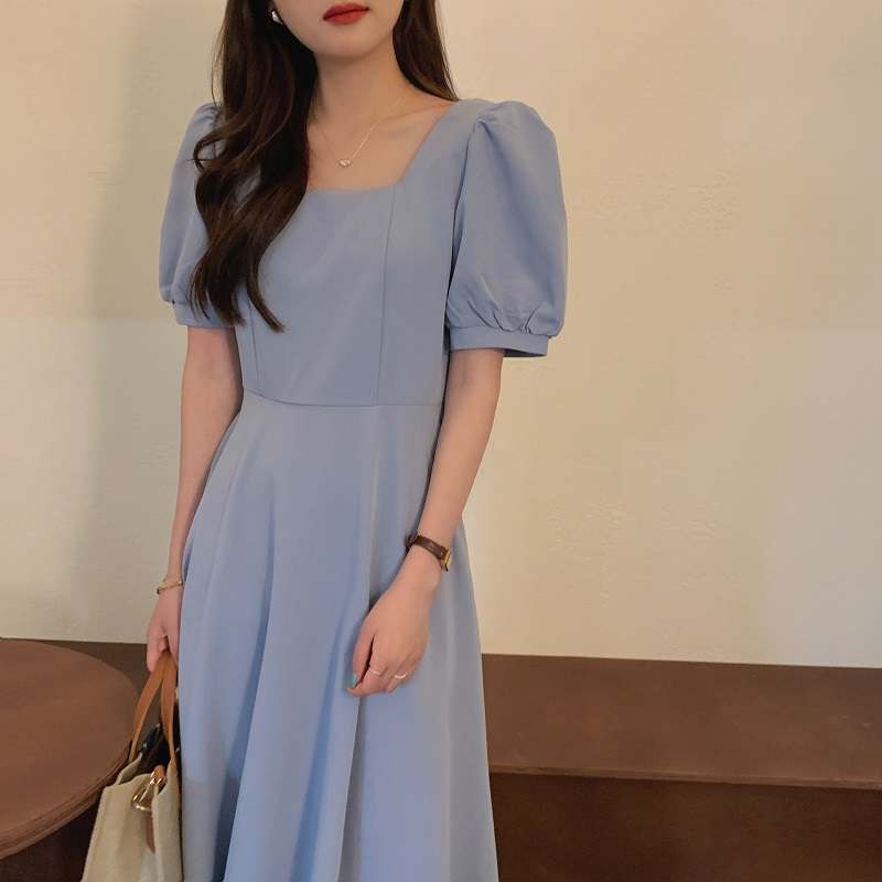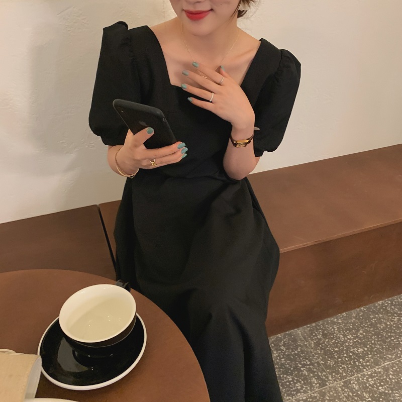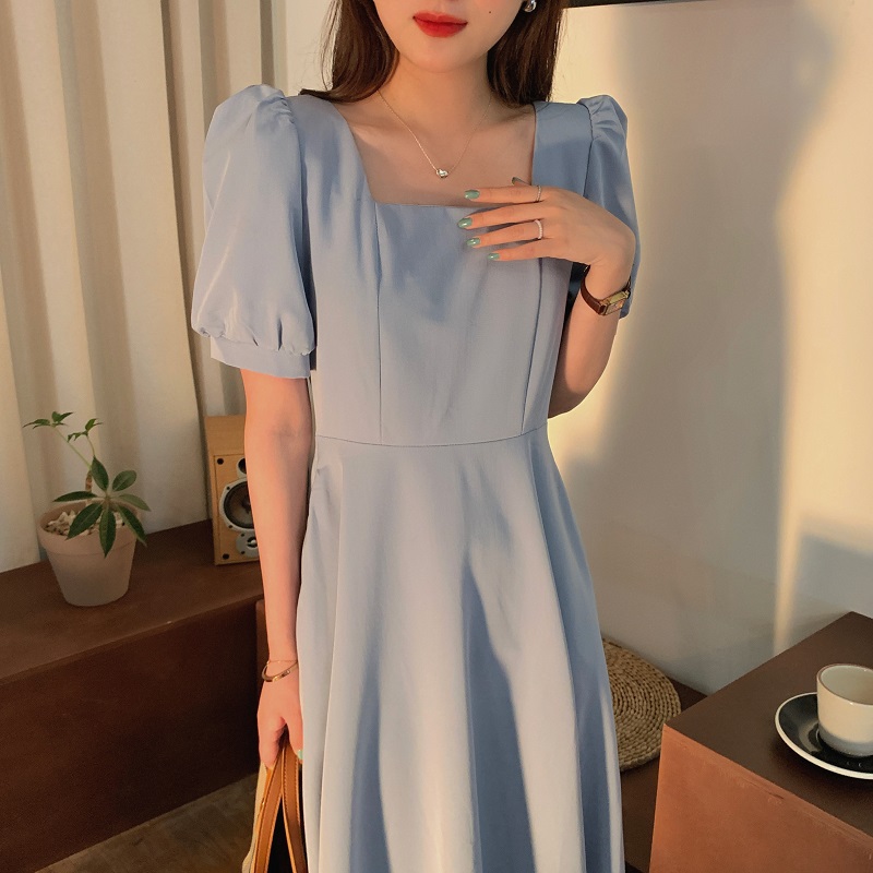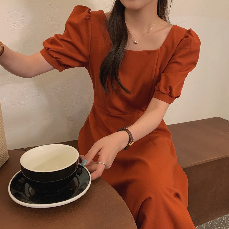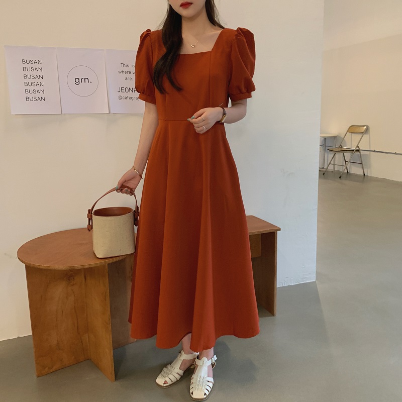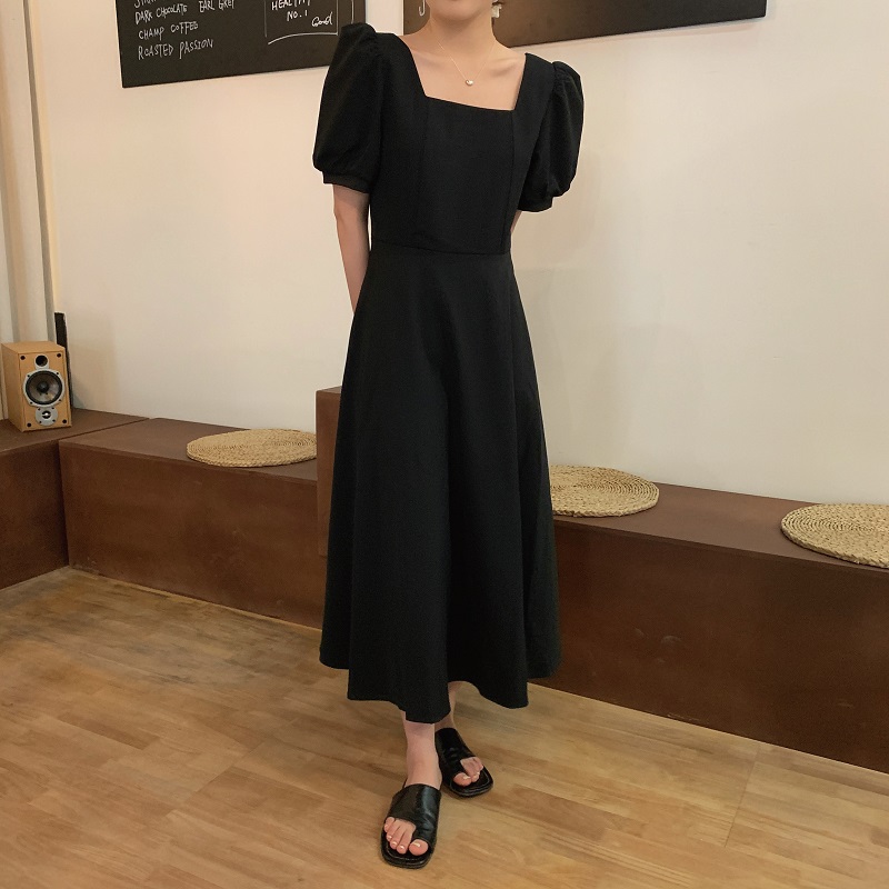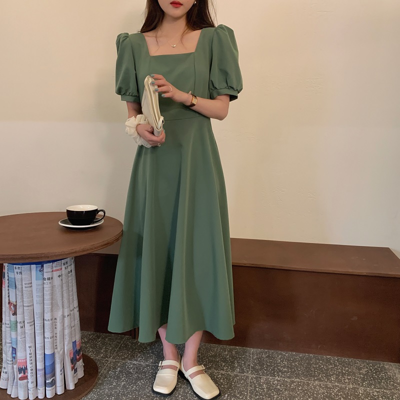 实拍 法式气质优雅赫本风方领收腰显瘦泡泡袖中长款连衣裙 现货