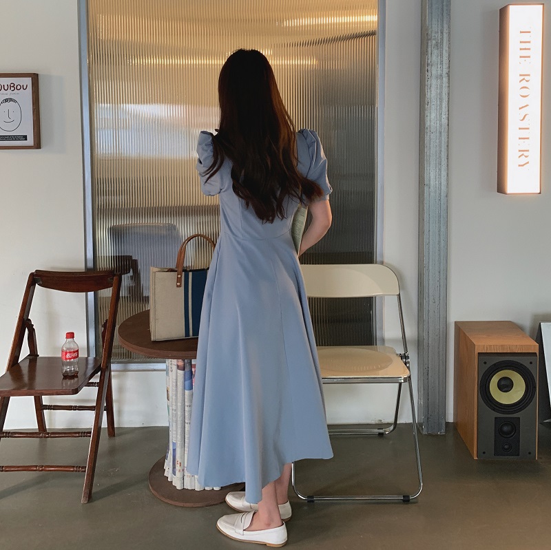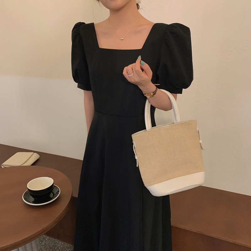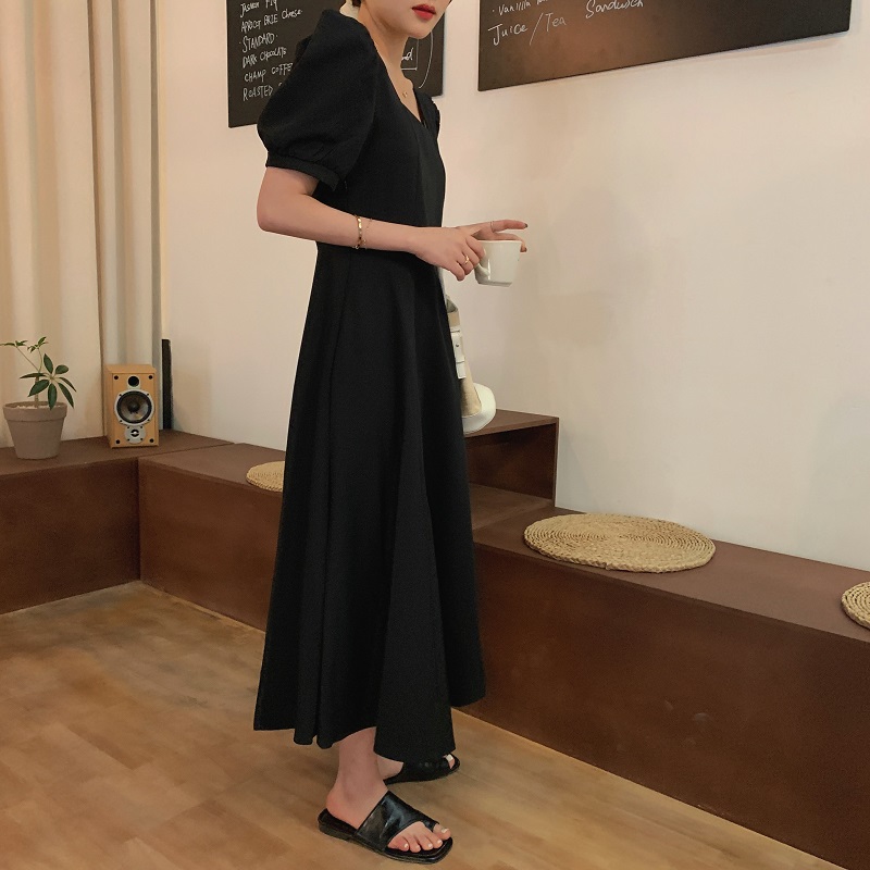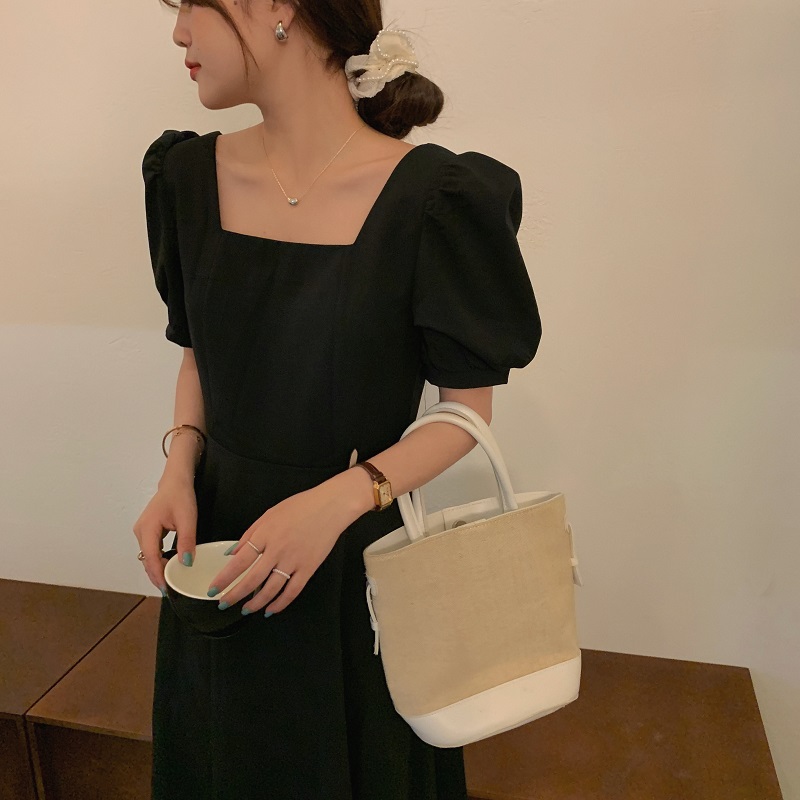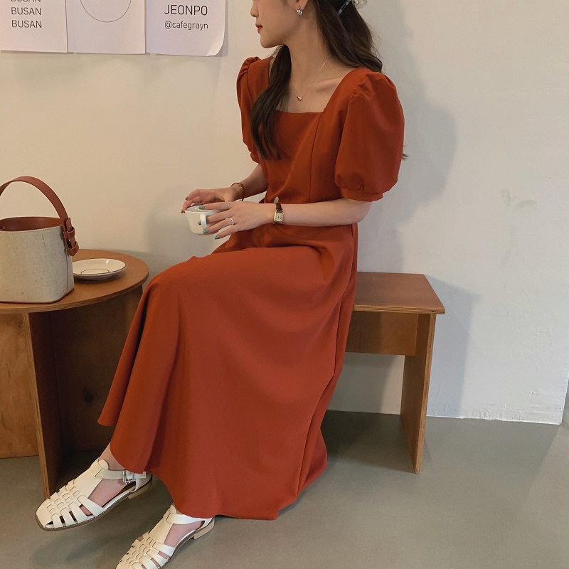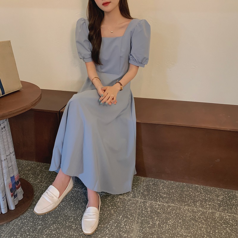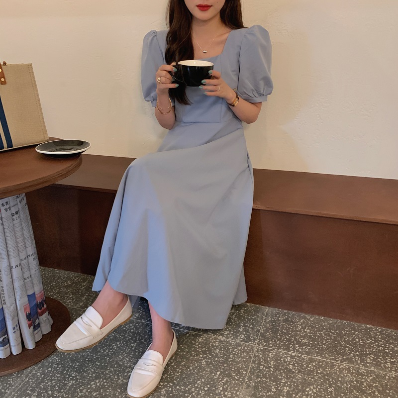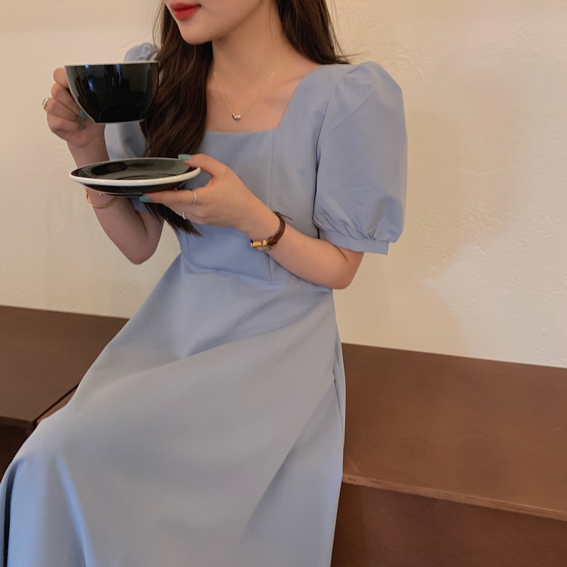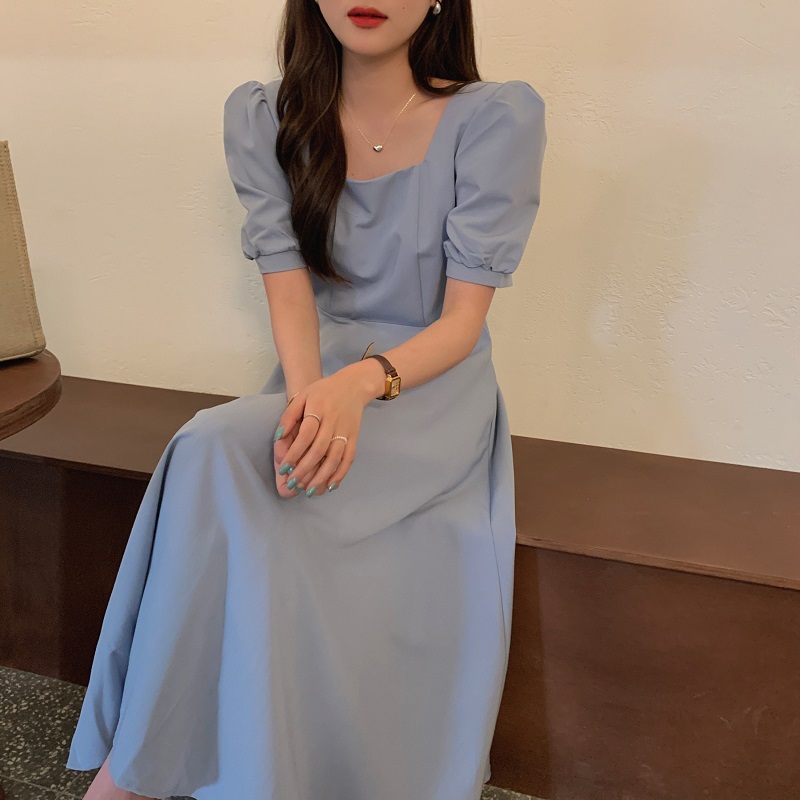 实拍 法式气质优雅赫本风方领收腰显瘦泡泡袖中长款连衣裙 现货