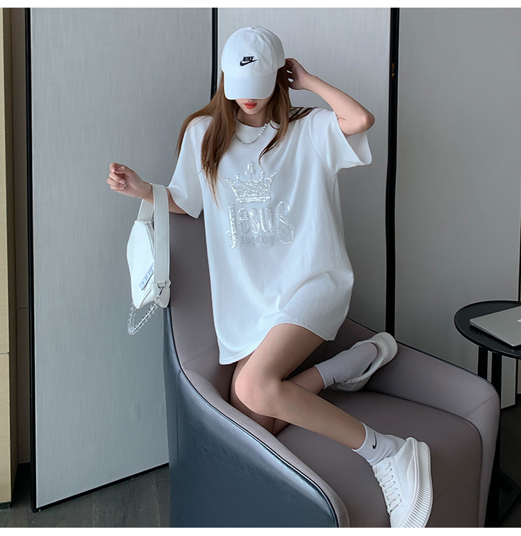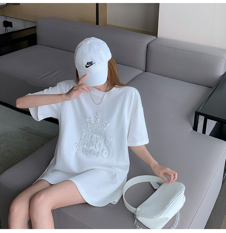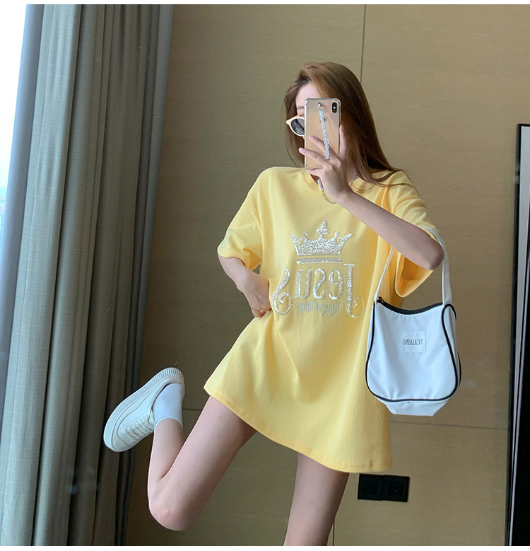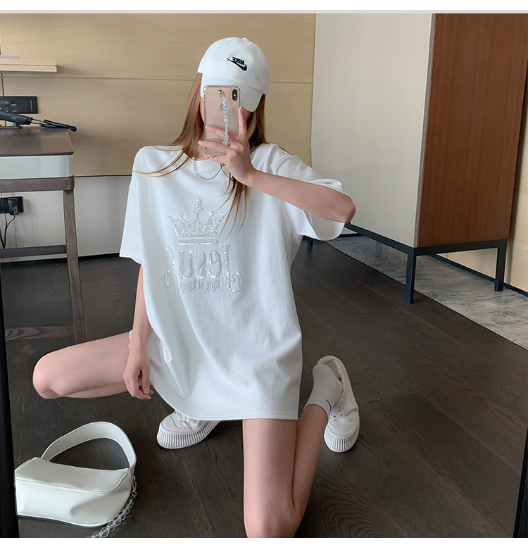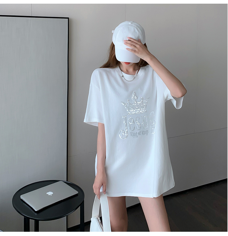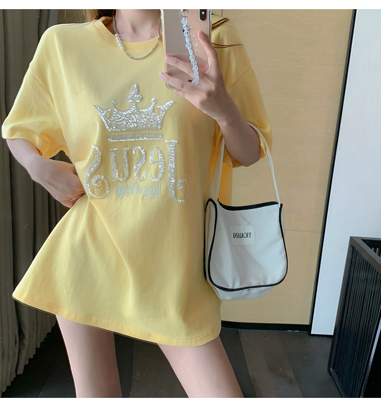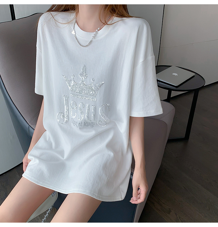 现货实拍 夏季重工刺绣亮片皇冠短袖t恤女宽松圆领中长款上衣