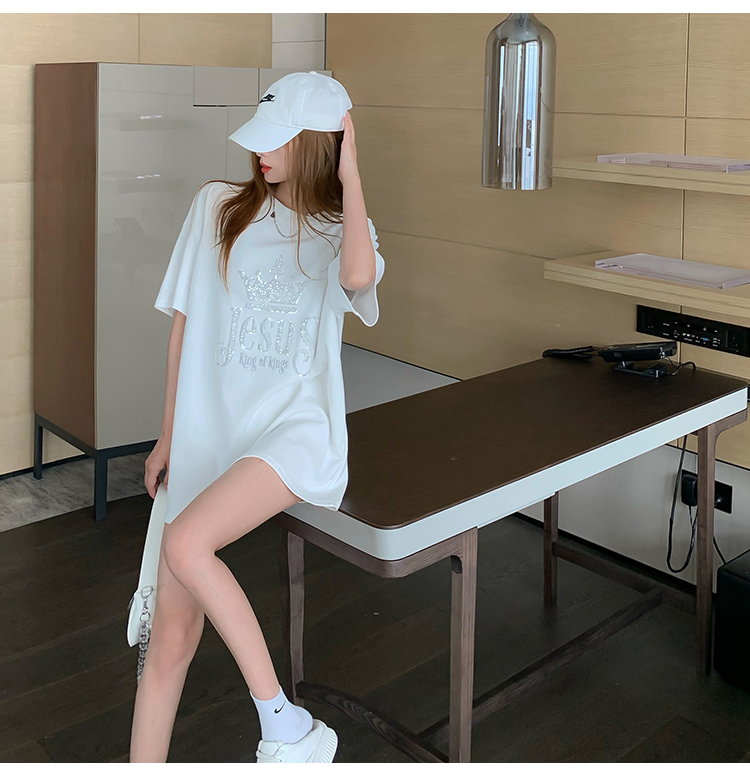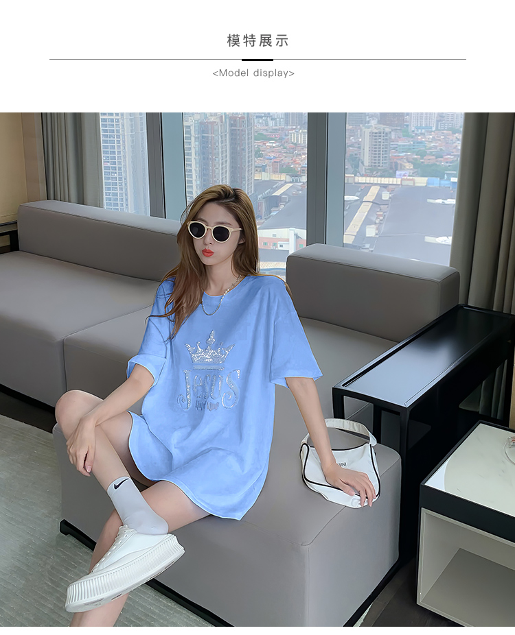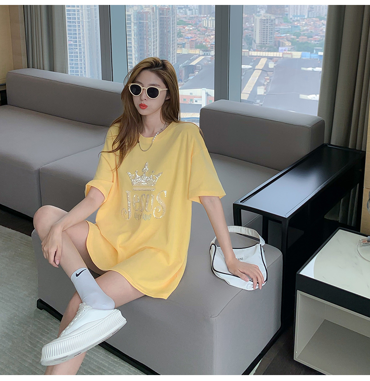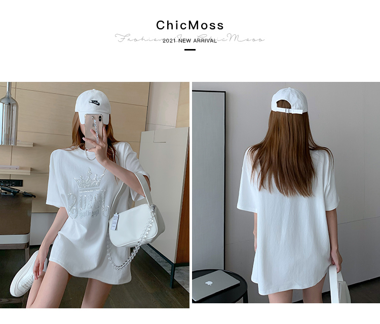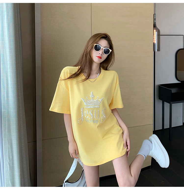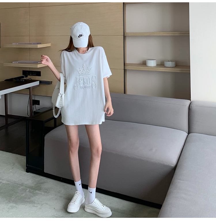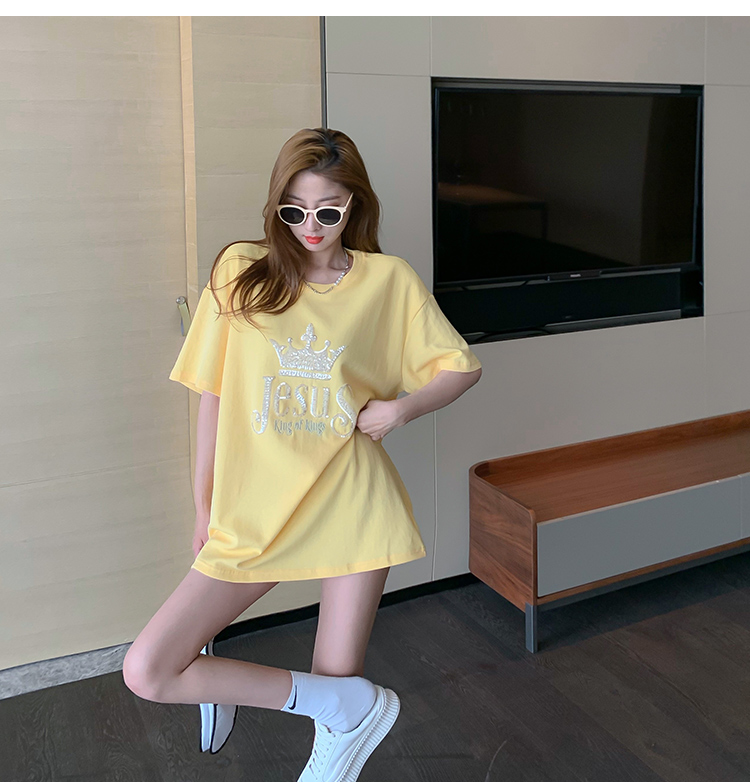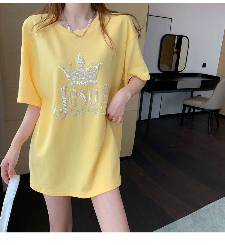 现货实拍 夏季重工刺绣亮片皇冠短袖t恤女宽松圆领中长款上衣