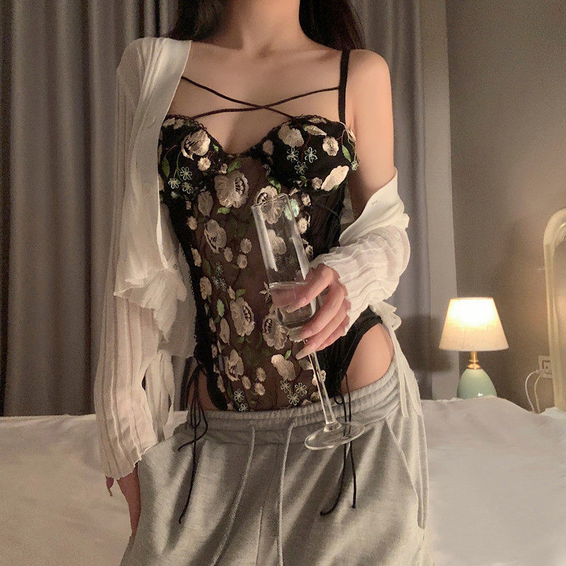 实拍实价重工艺蕾丝花朵网纱绑带拼接连体内衣+针织绑带开衫外套
