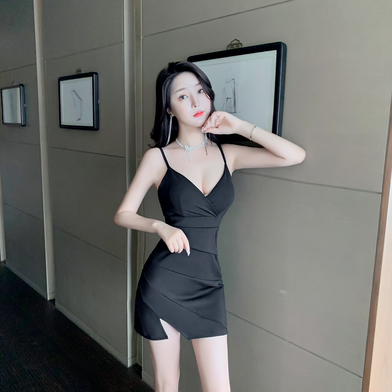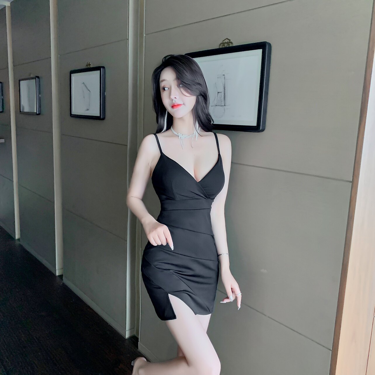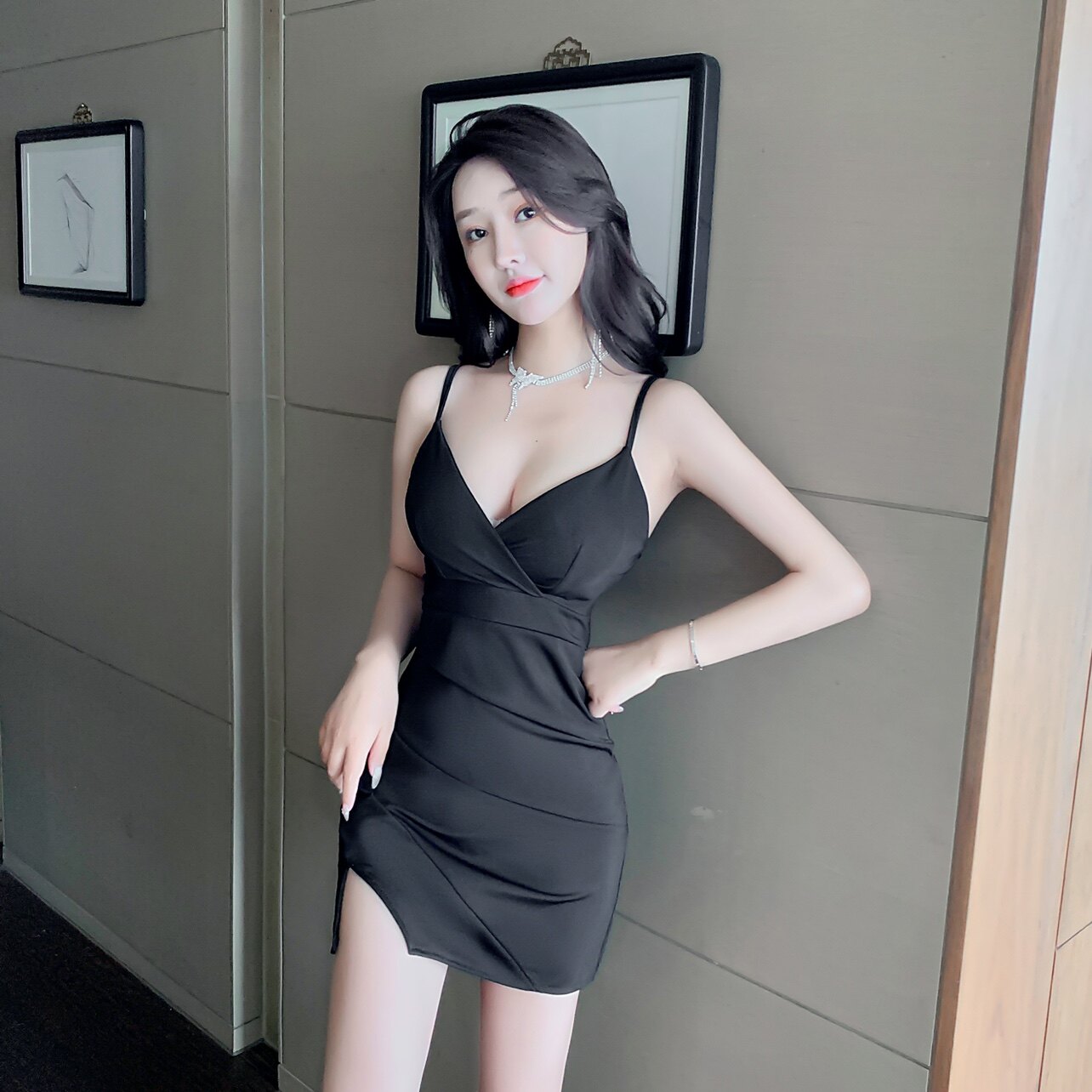 实拍新款现货紧身低胸开衩包臀吊带连衣裙