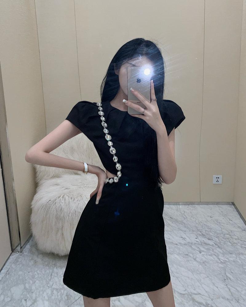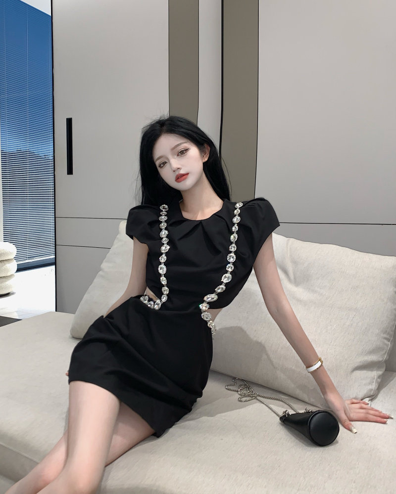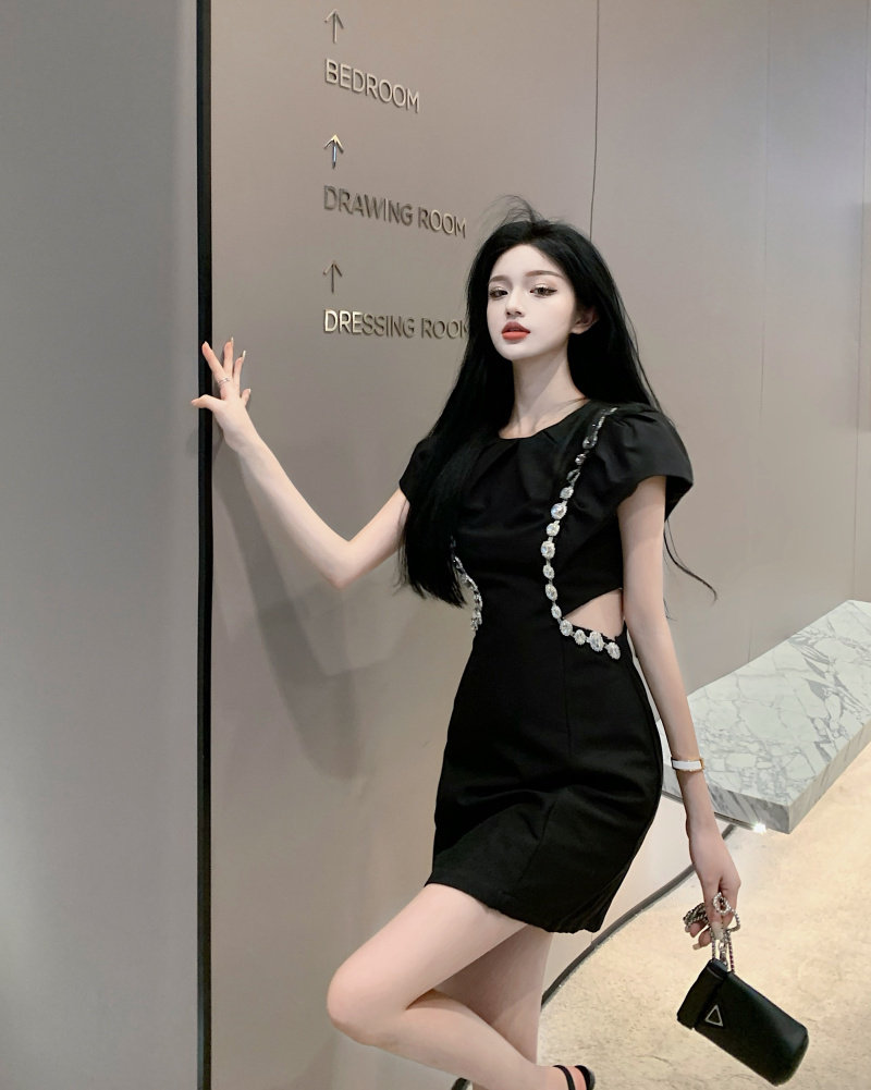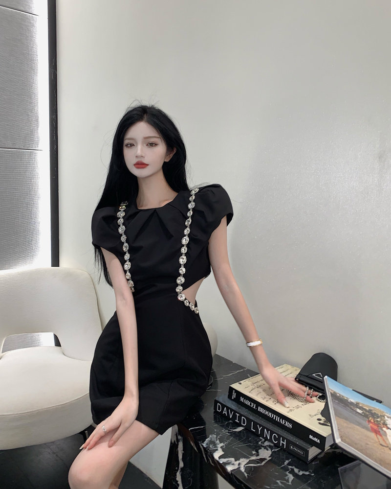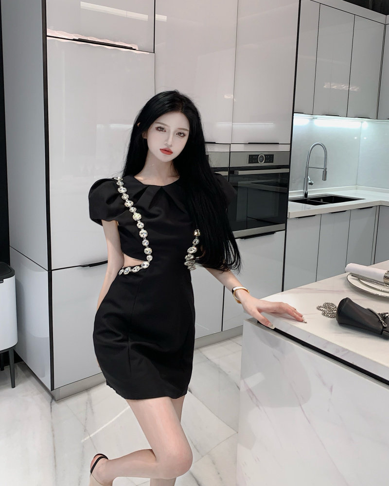 实拍实价 韩版泡泡袖重工镶钻收腰显瘦小黑裙连衣裙