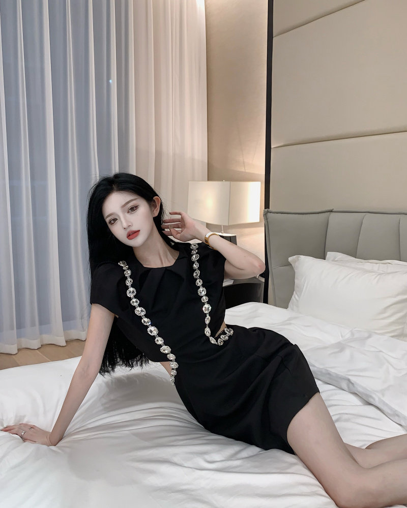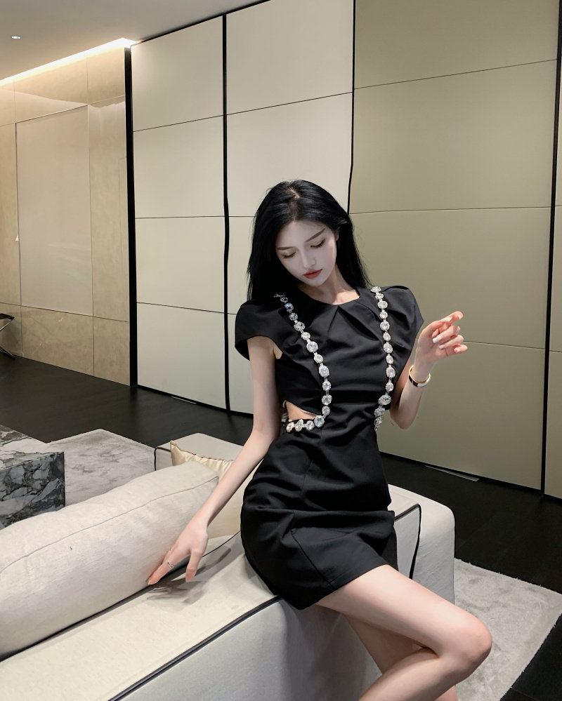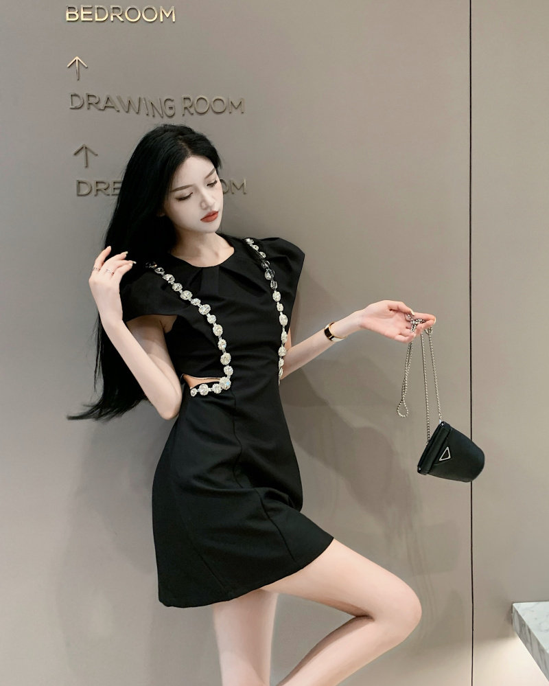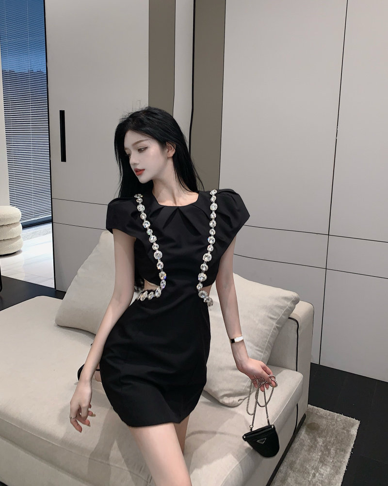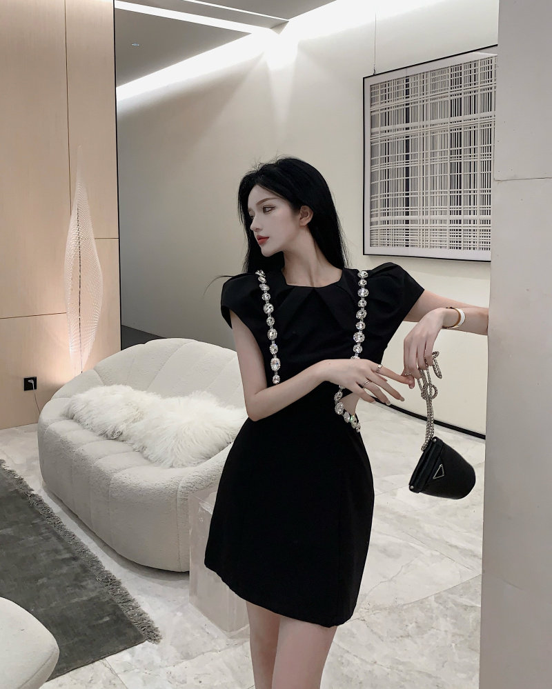实拍实价 韩版泡泡袖重工镶钻收腰显瘦小黑裙连衣裙