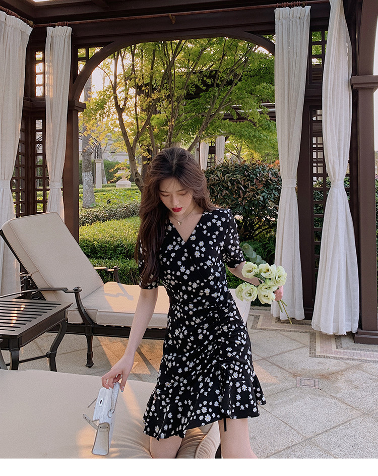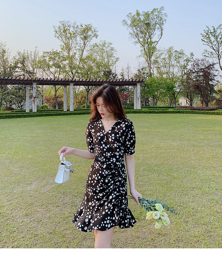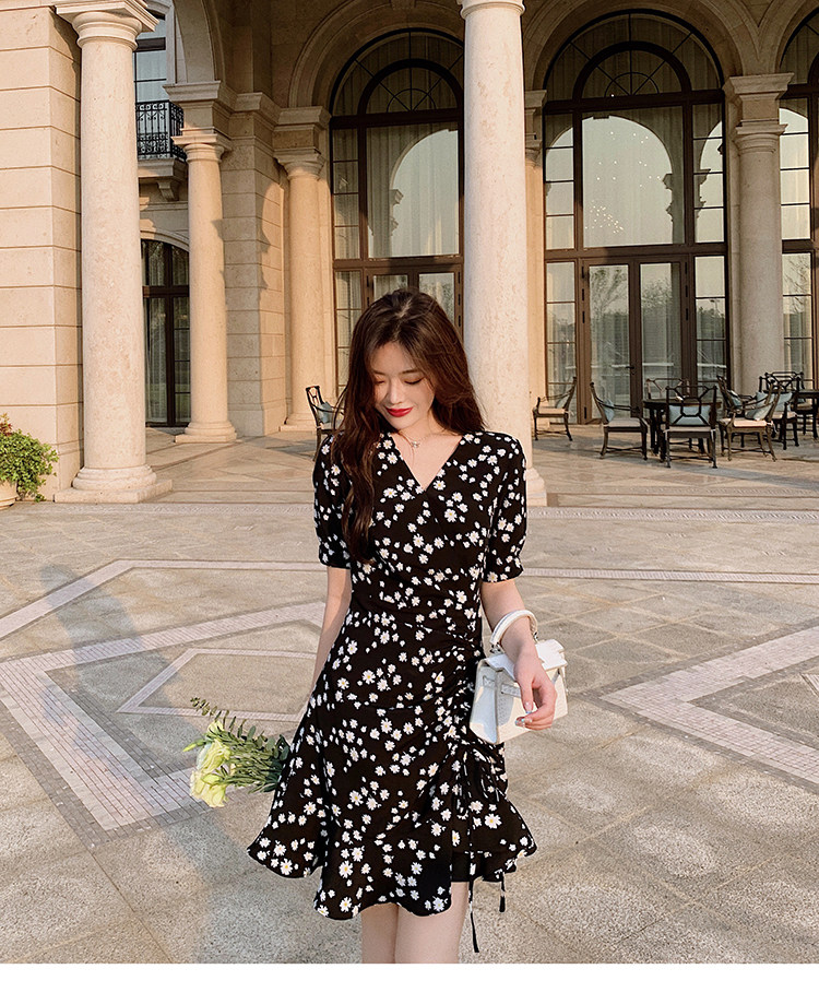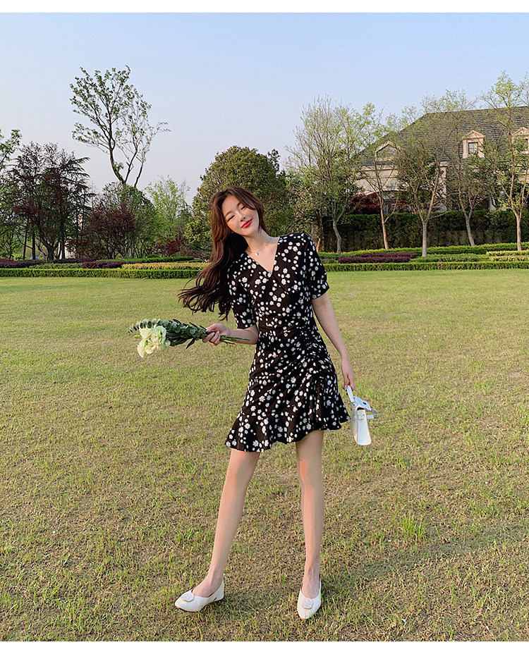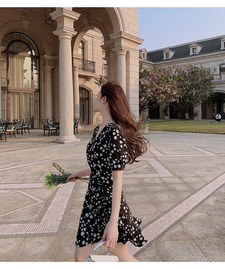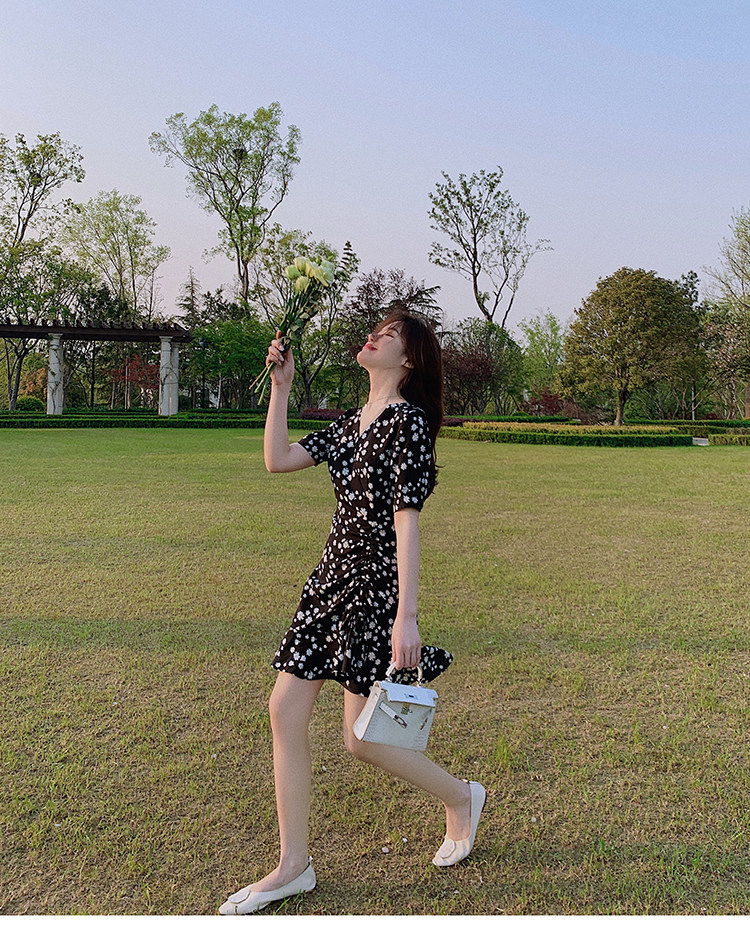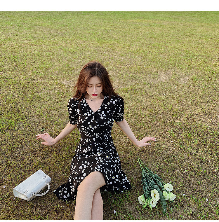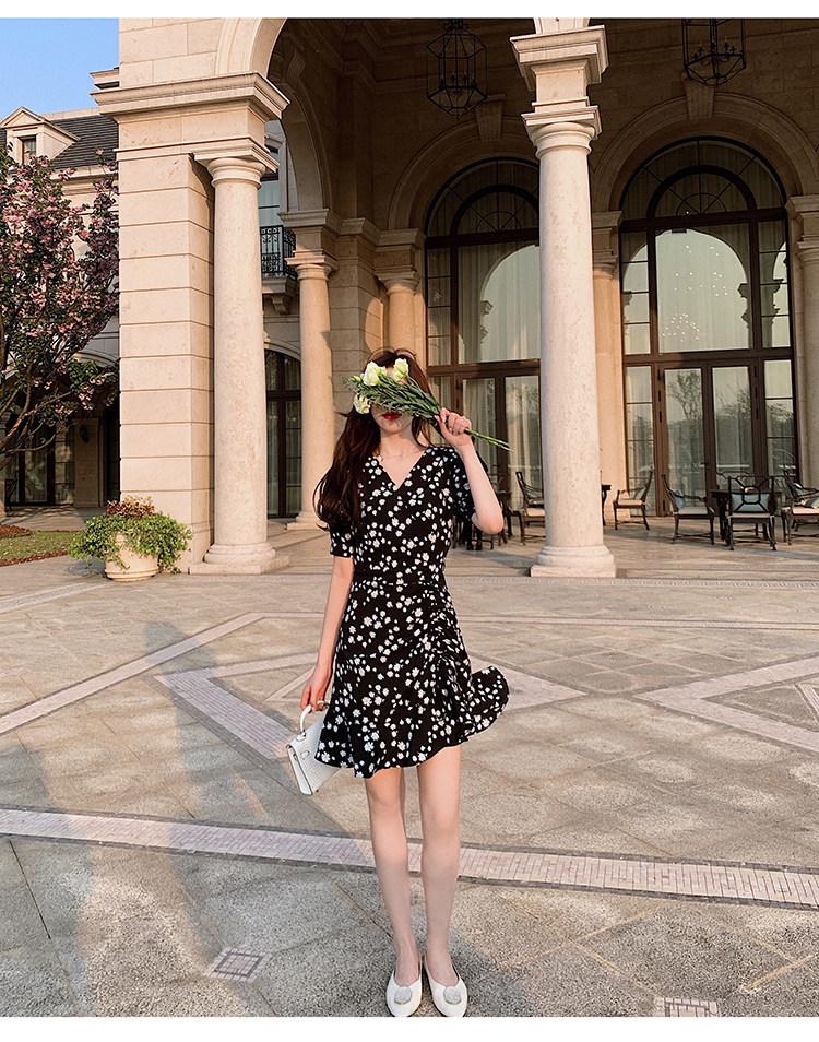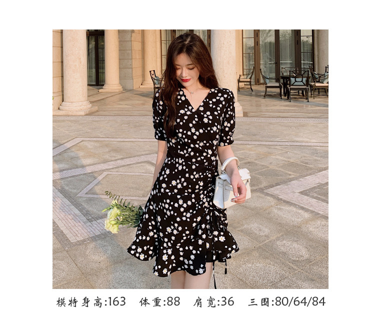实拍 夏季碎花连衣裙v领短袖高腰裙泫雅风超仙显瘦连衣裙女