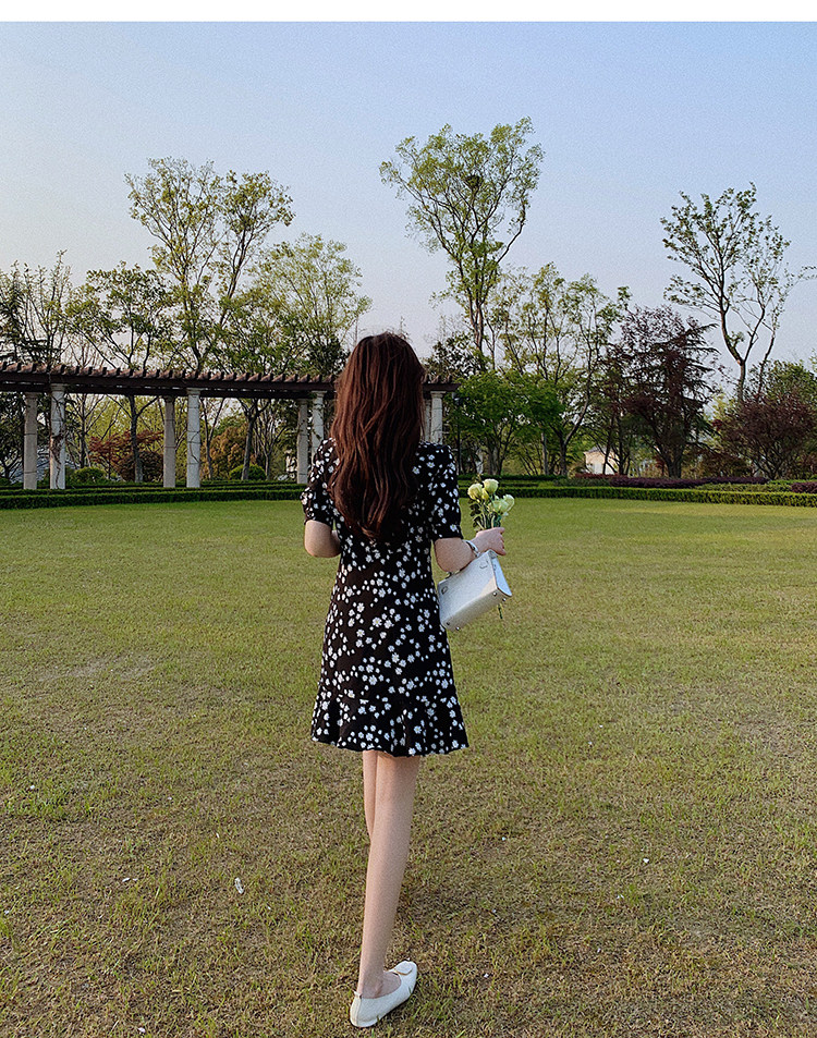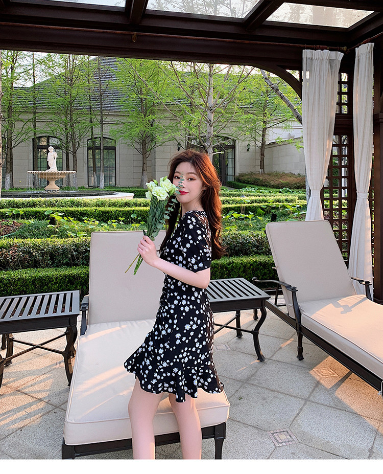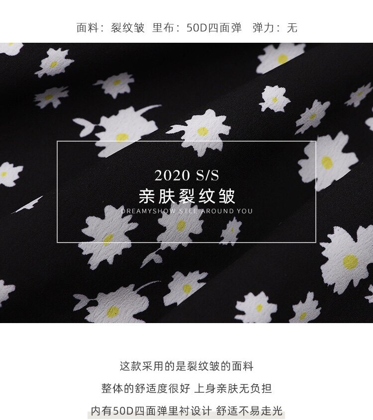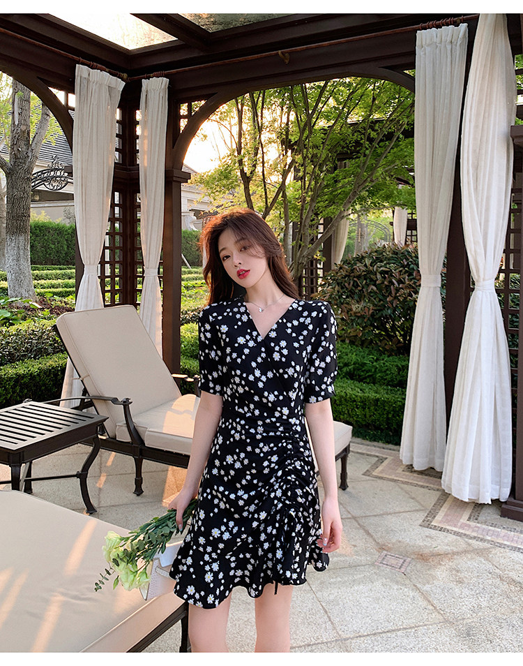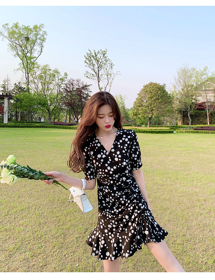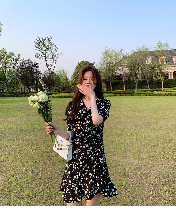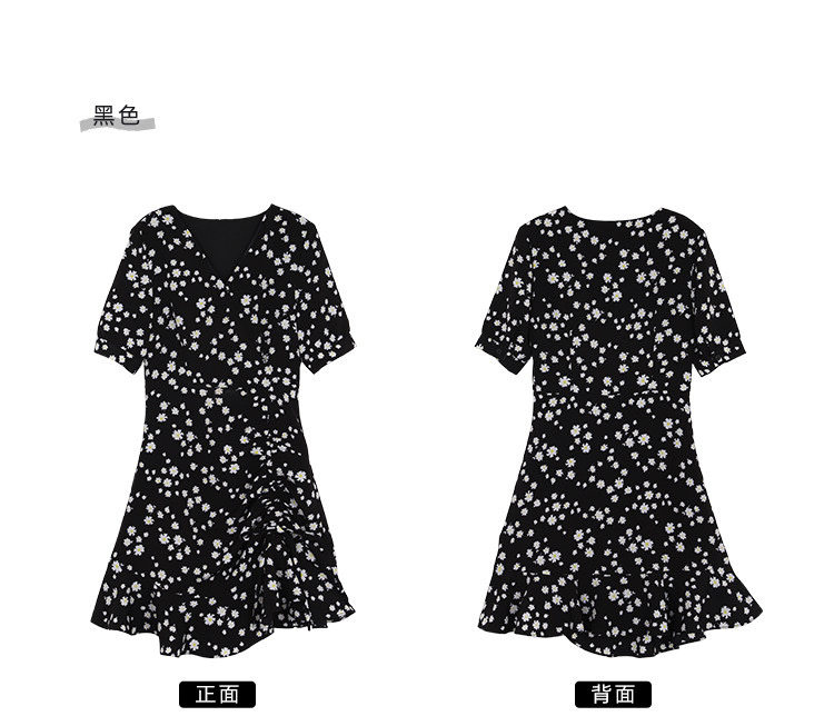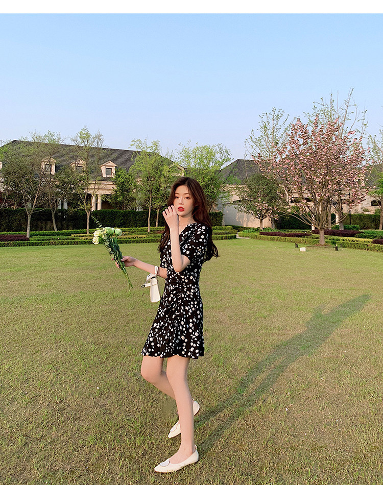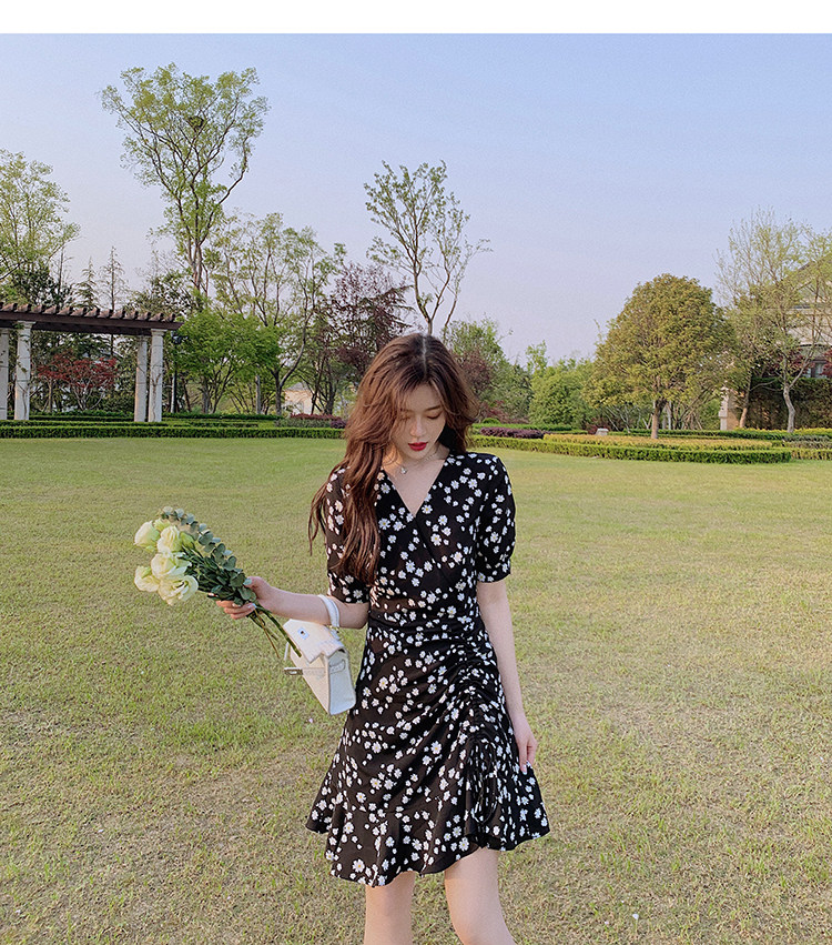 实拍 夏季碎花连衣裙v领短袖高腰裙泫雅风超仙显瘦连衣裙女