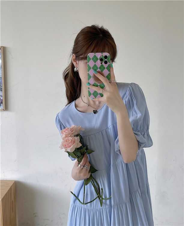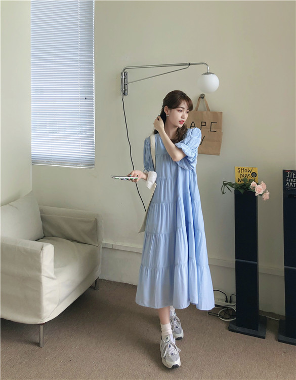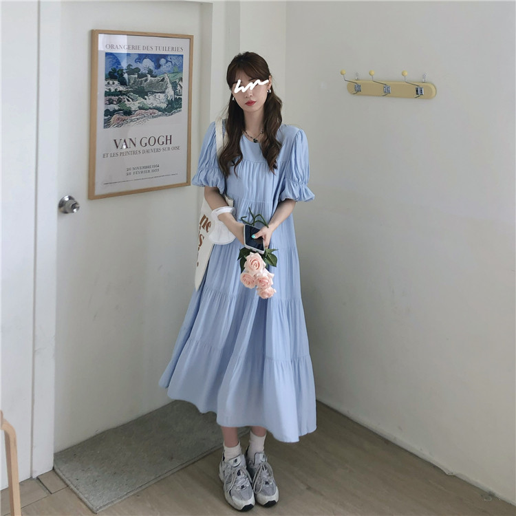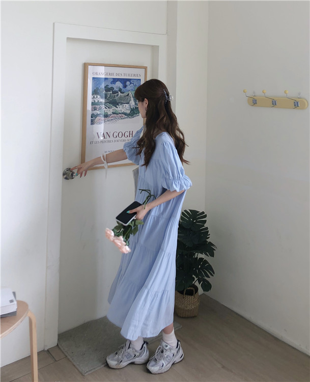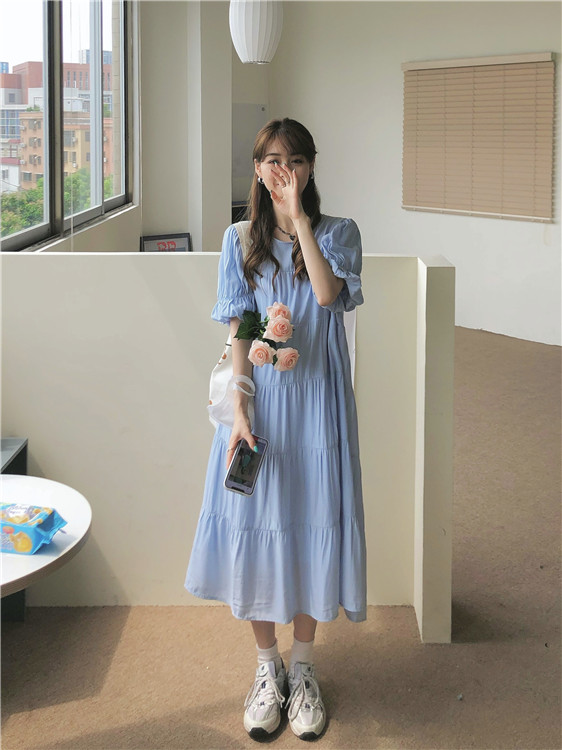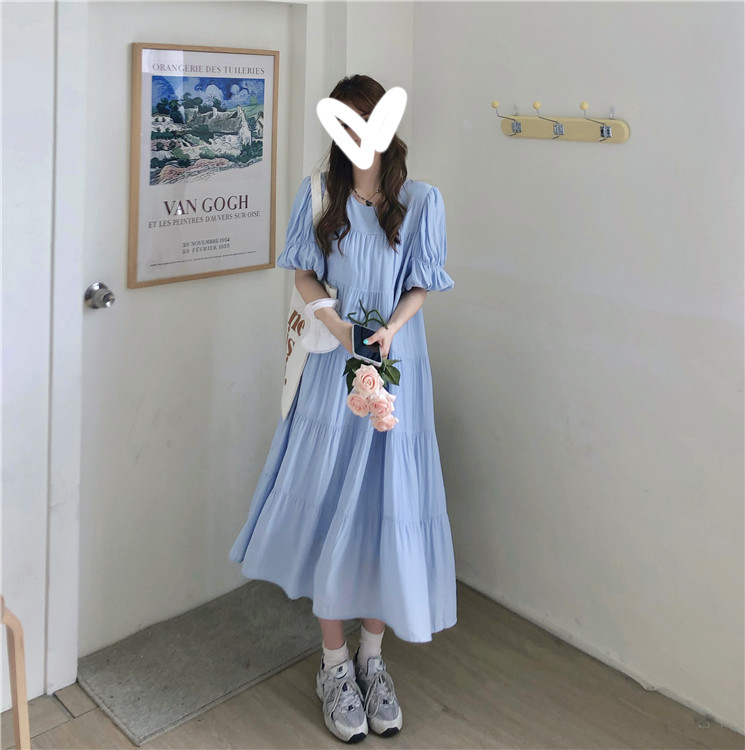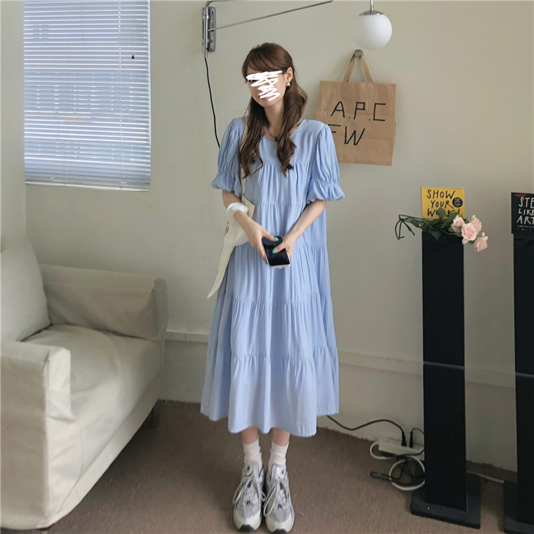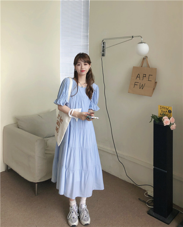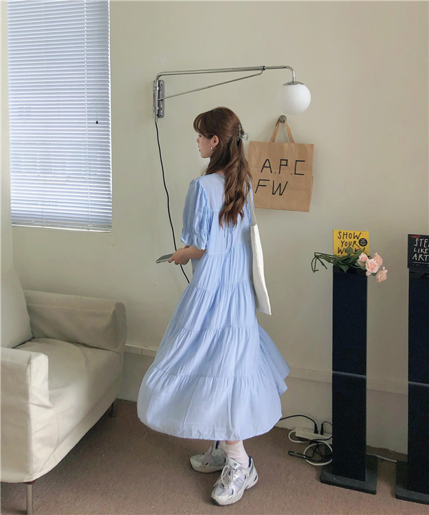 实拍 实价 小心机后背系设计压褶收腰泡泡袖连衣裙