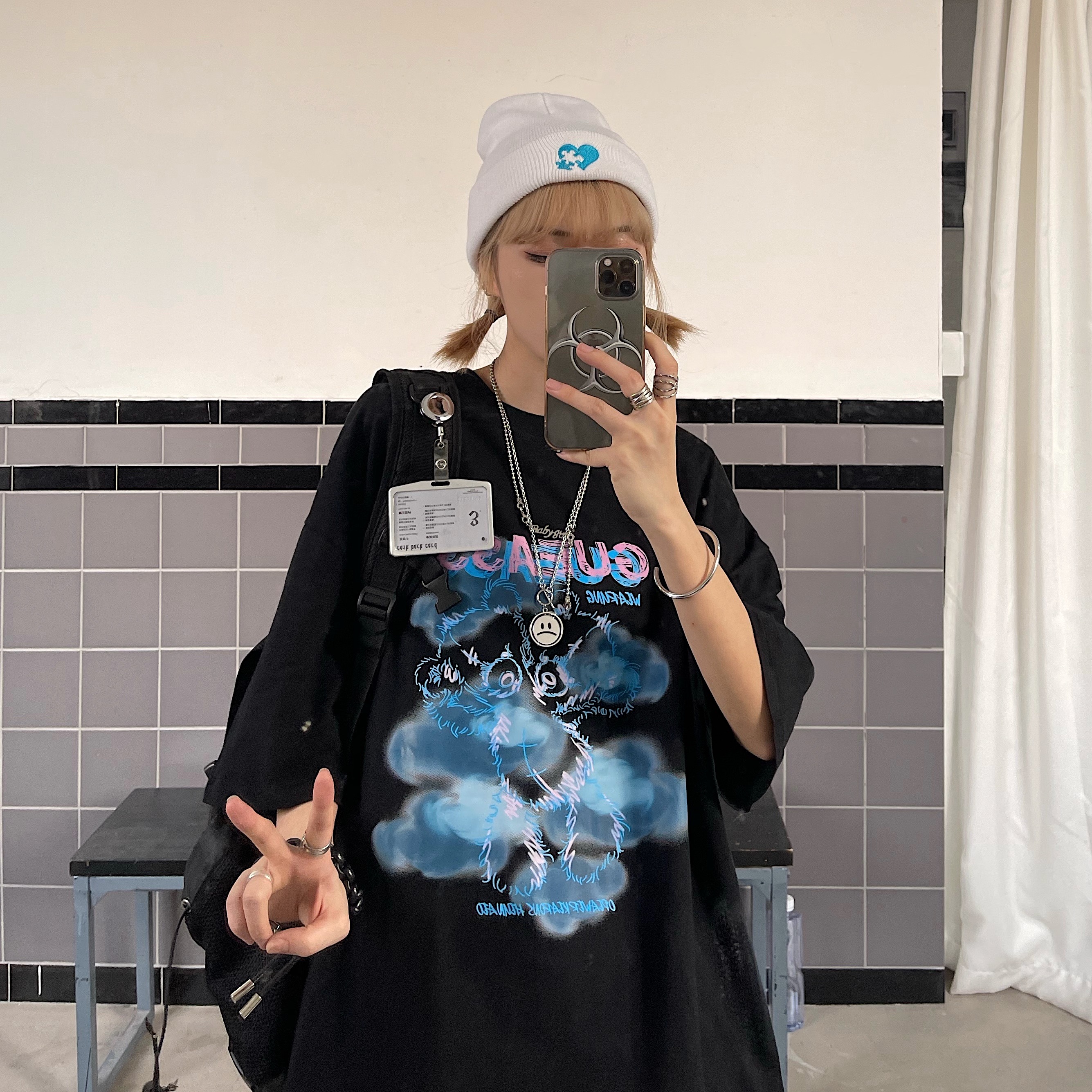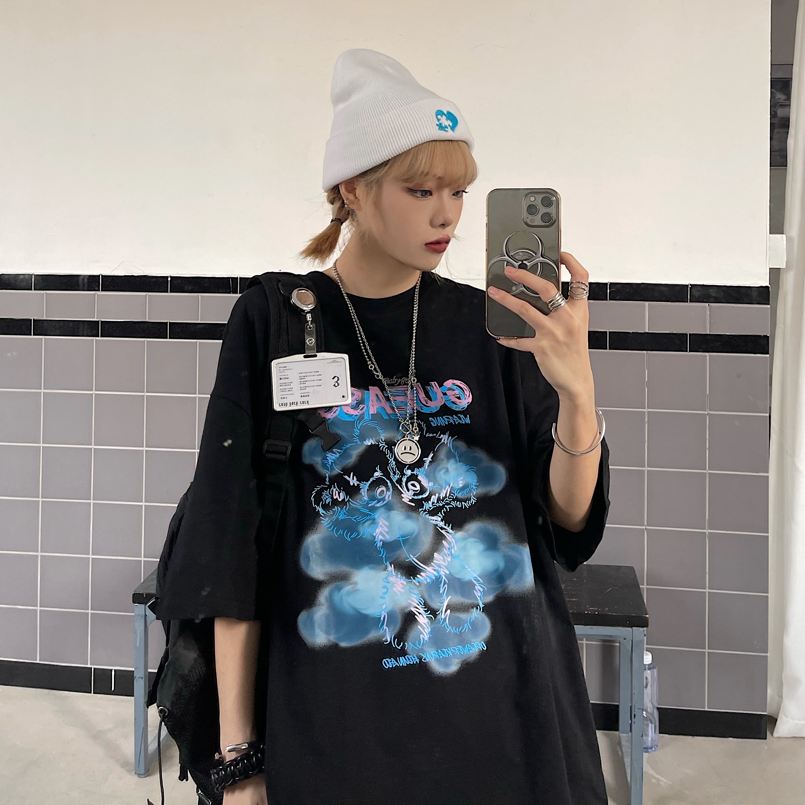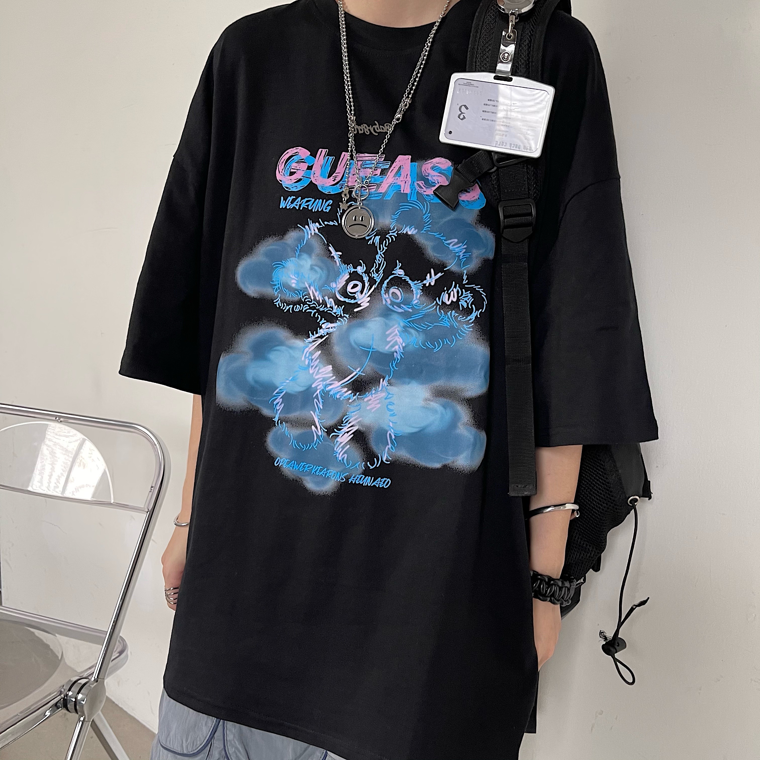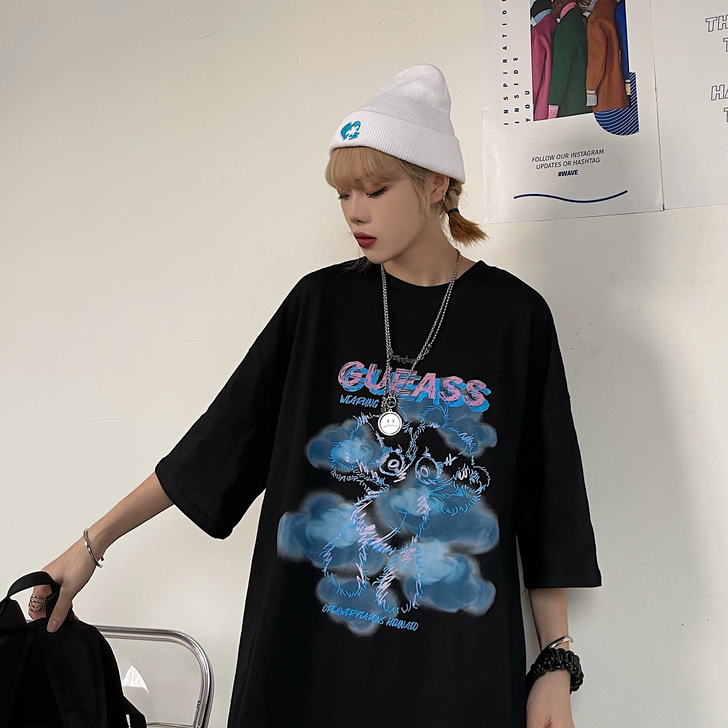 控+3实拍实价原宿纯棉INS迷雾小熊印花情侣短袖T恤男女上衣