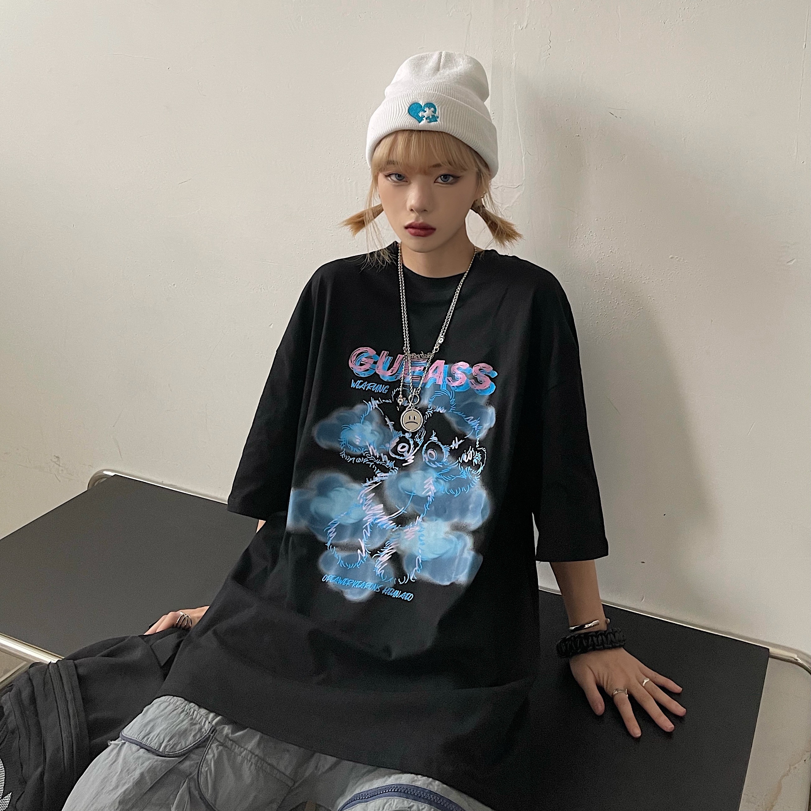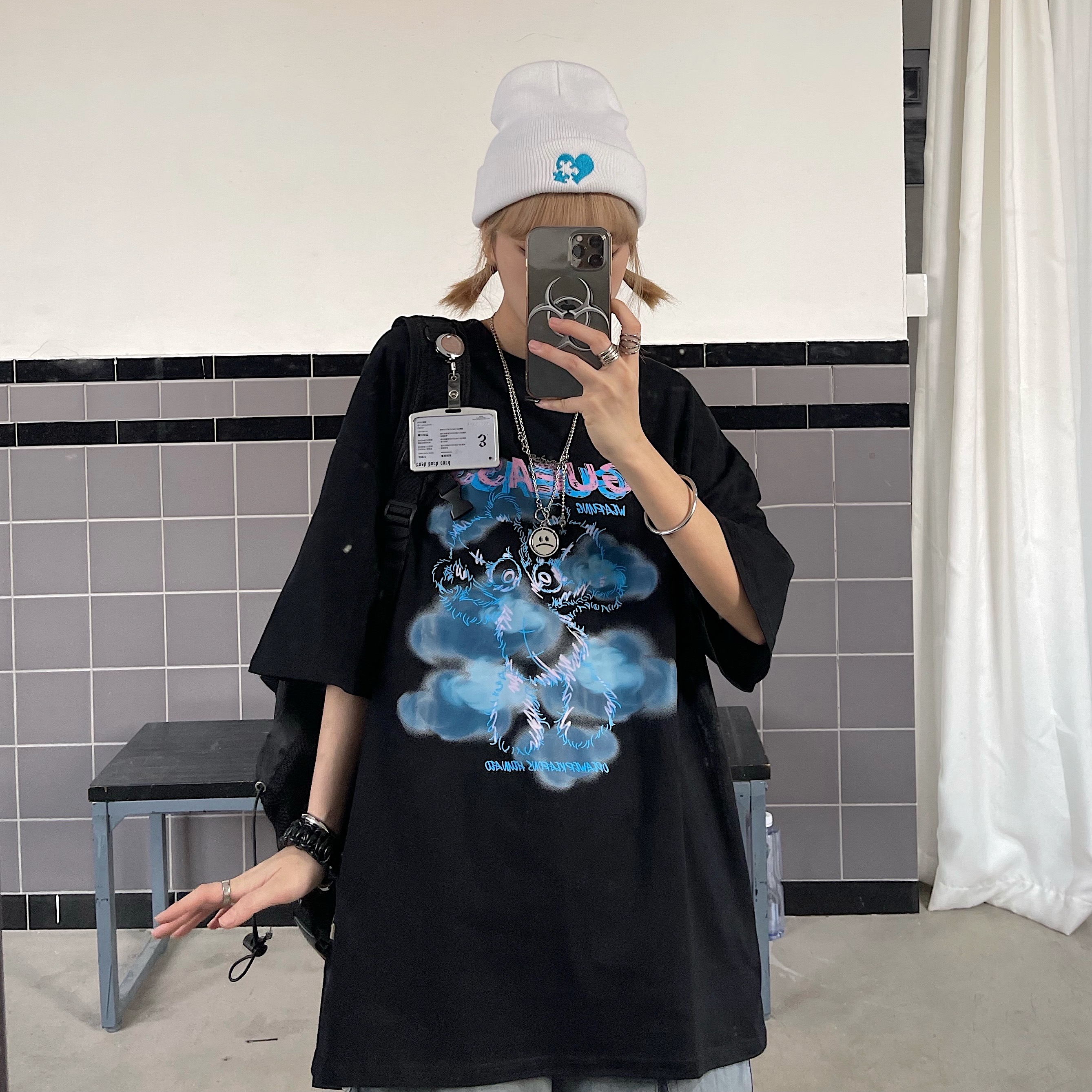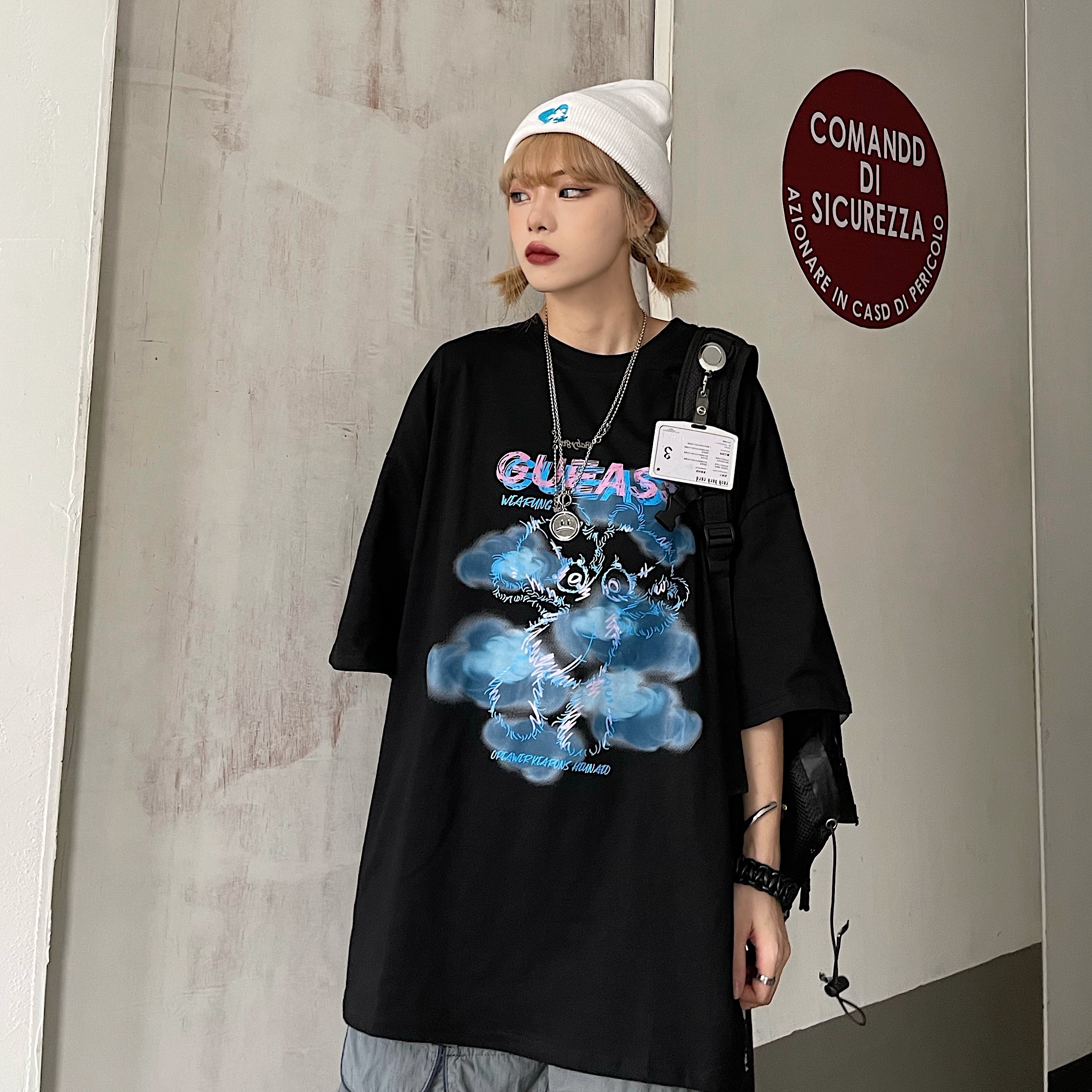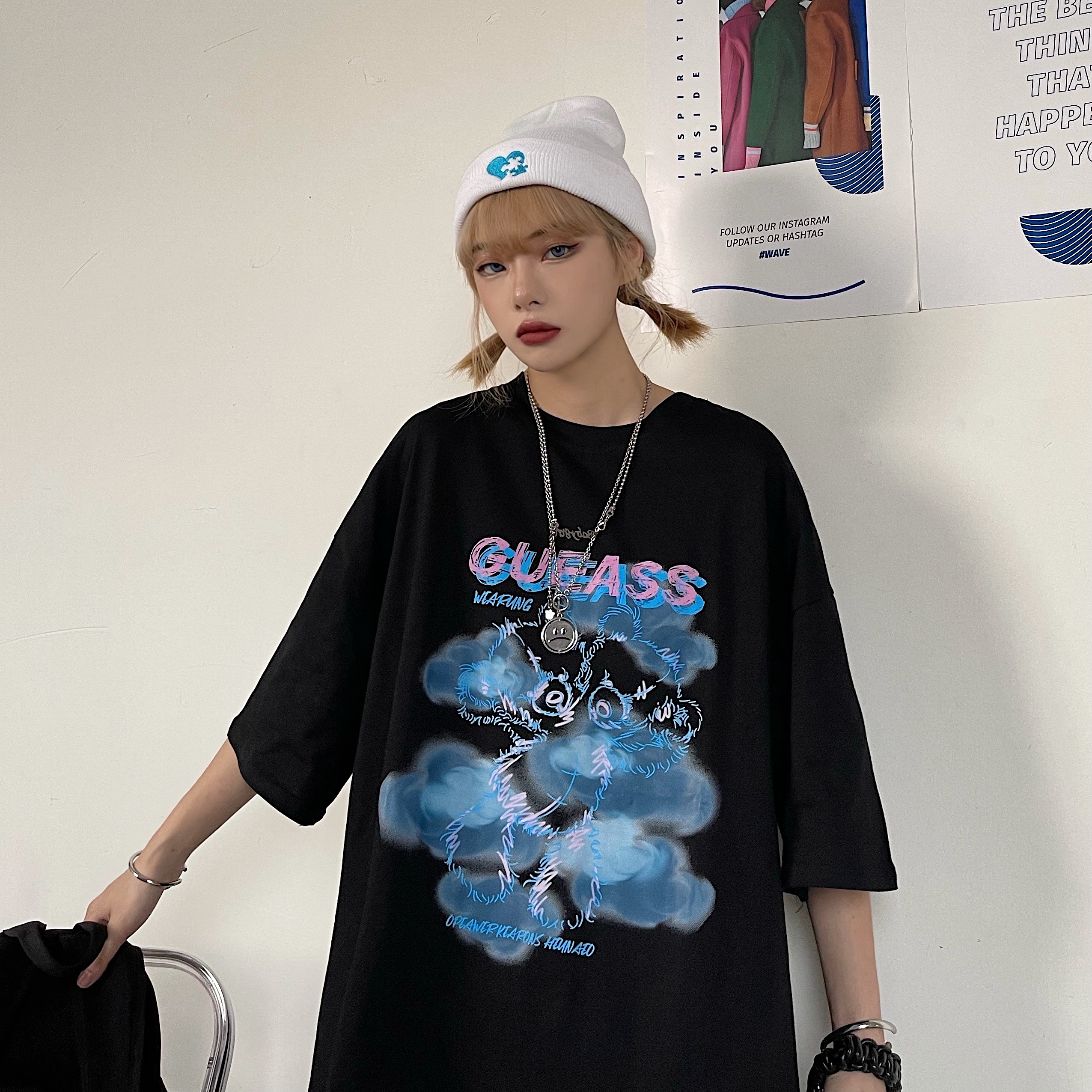 控+3实拍实价原宿纯棉INS迷雾小熊印花情侣短袖T恤男女上衣