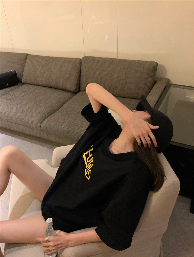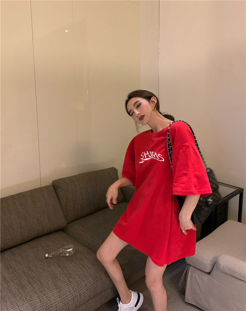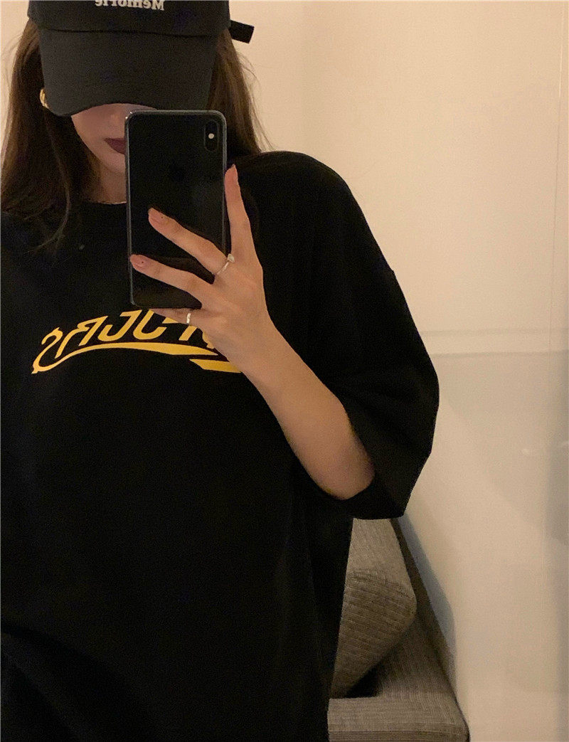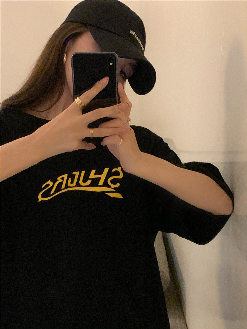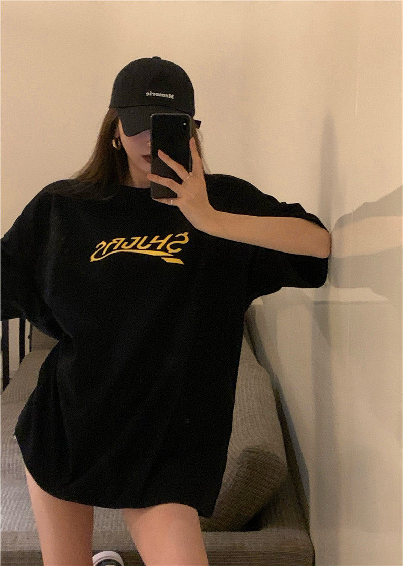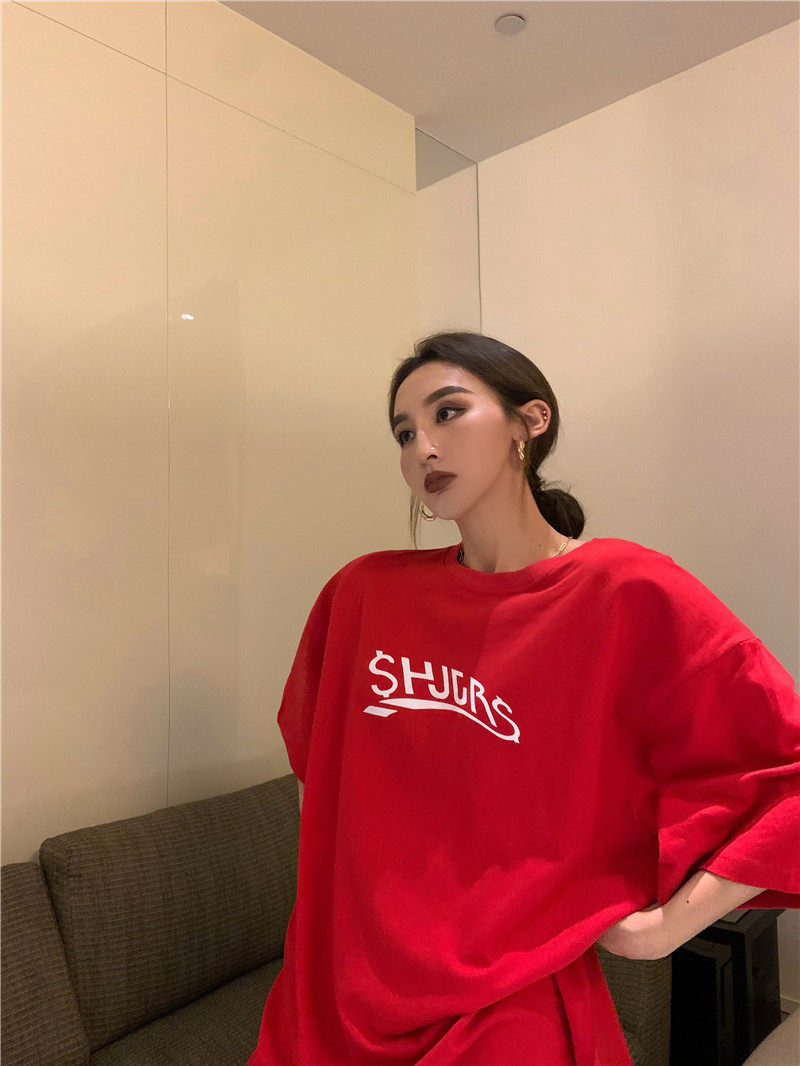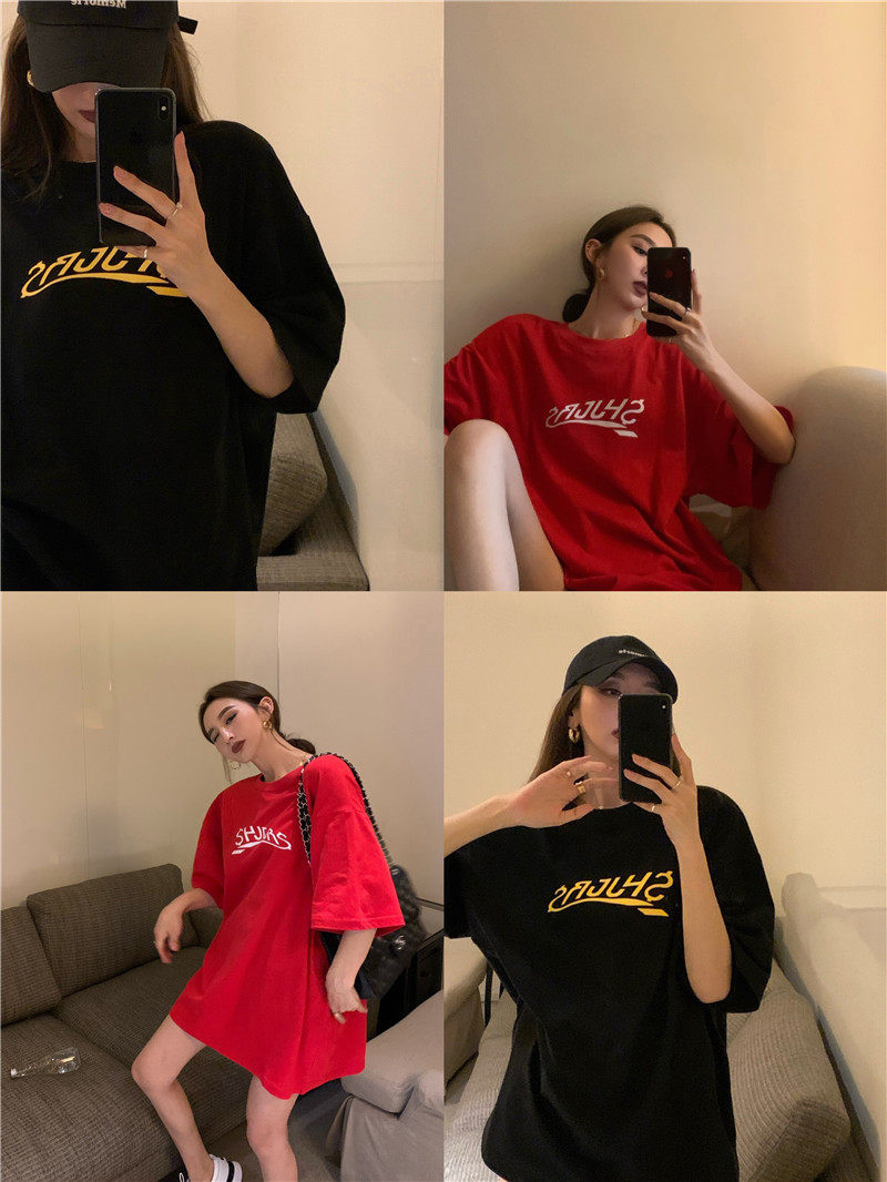 实拍实价 休闲百搭简约印花宽松中长款T恤上衣