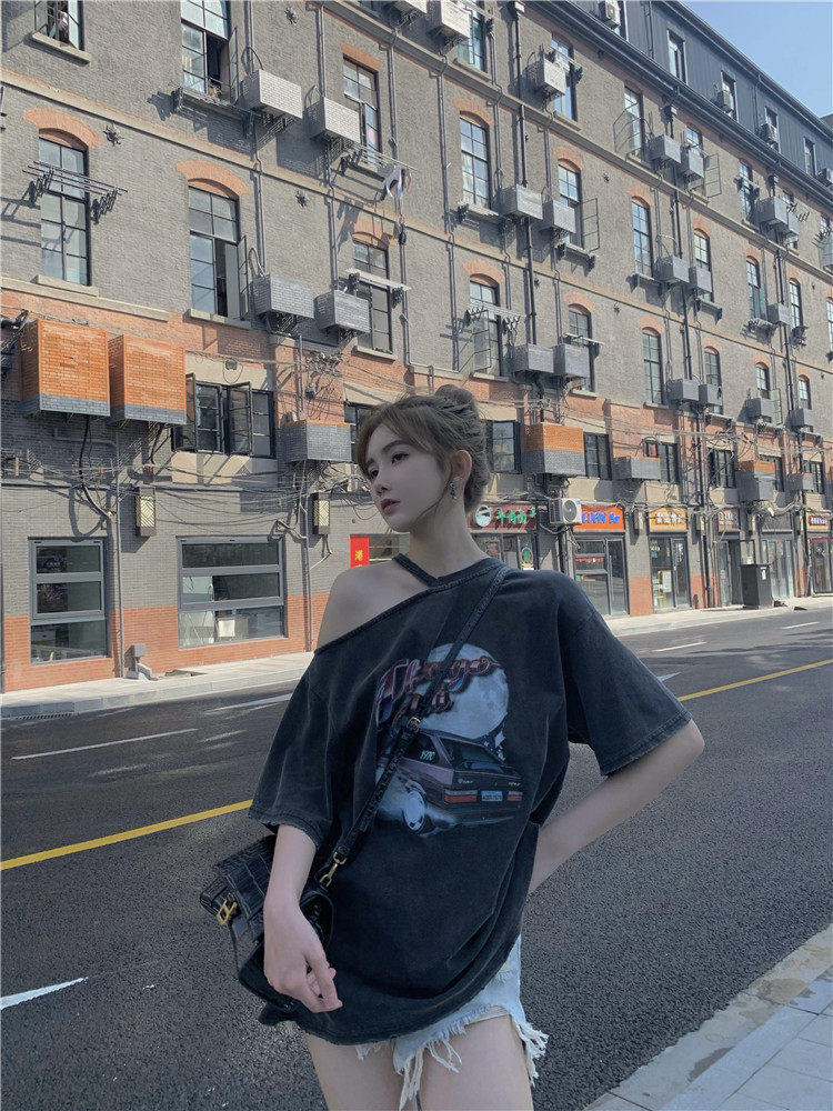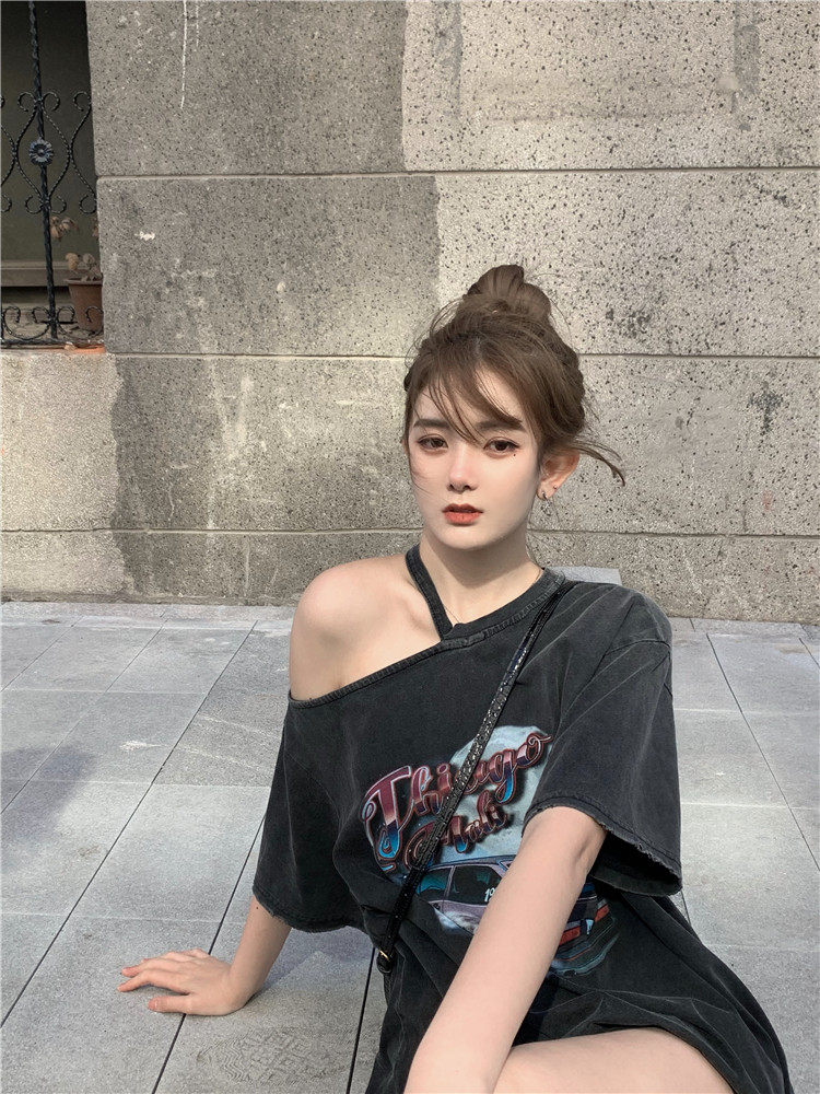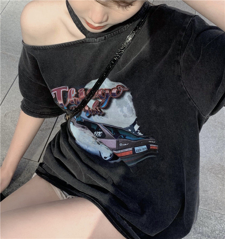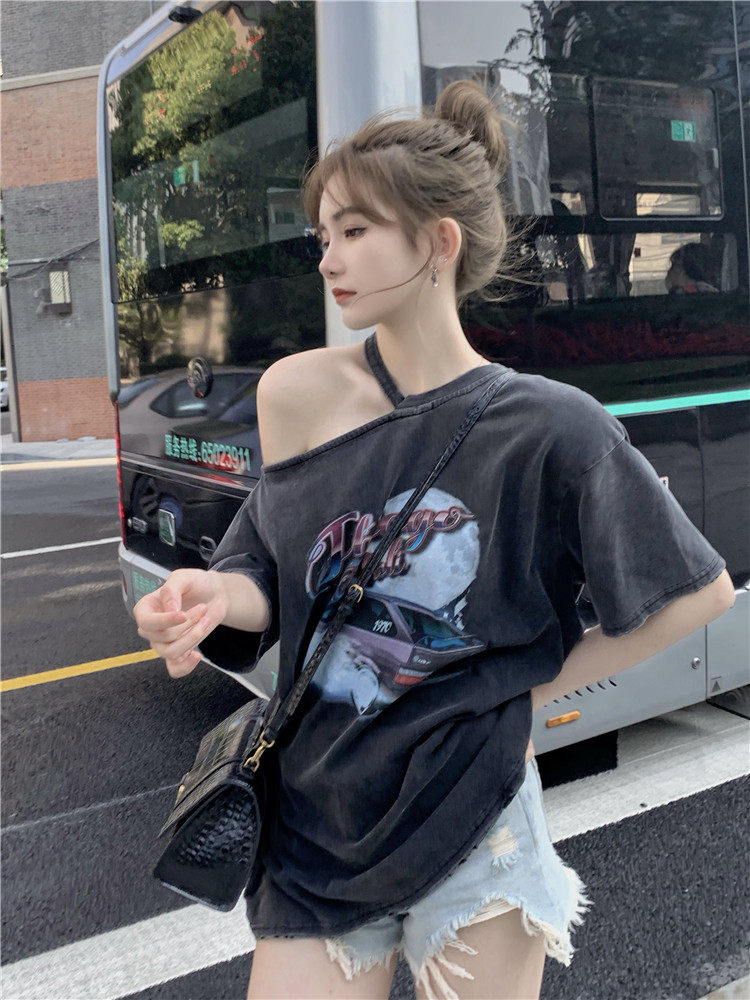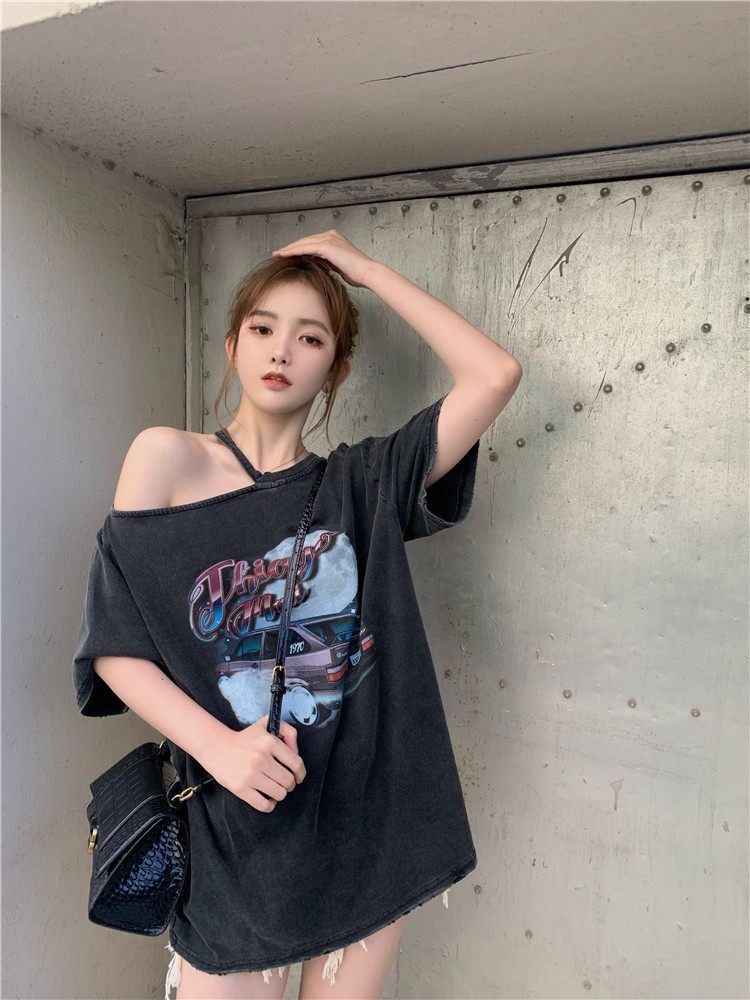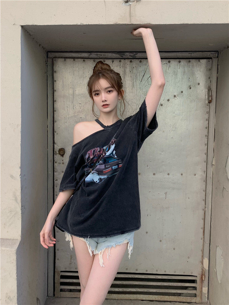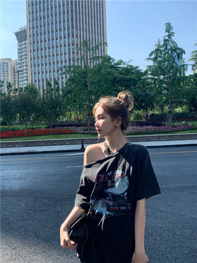 实价实拍 露肩印花T恤黑色宽松辣妹上衣