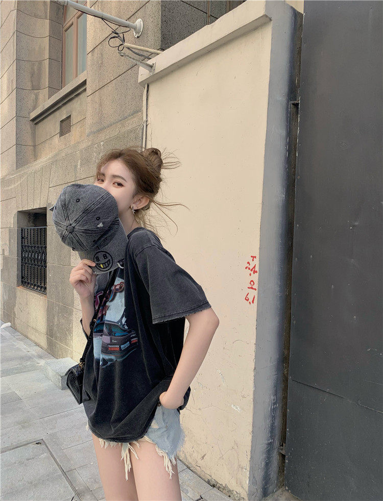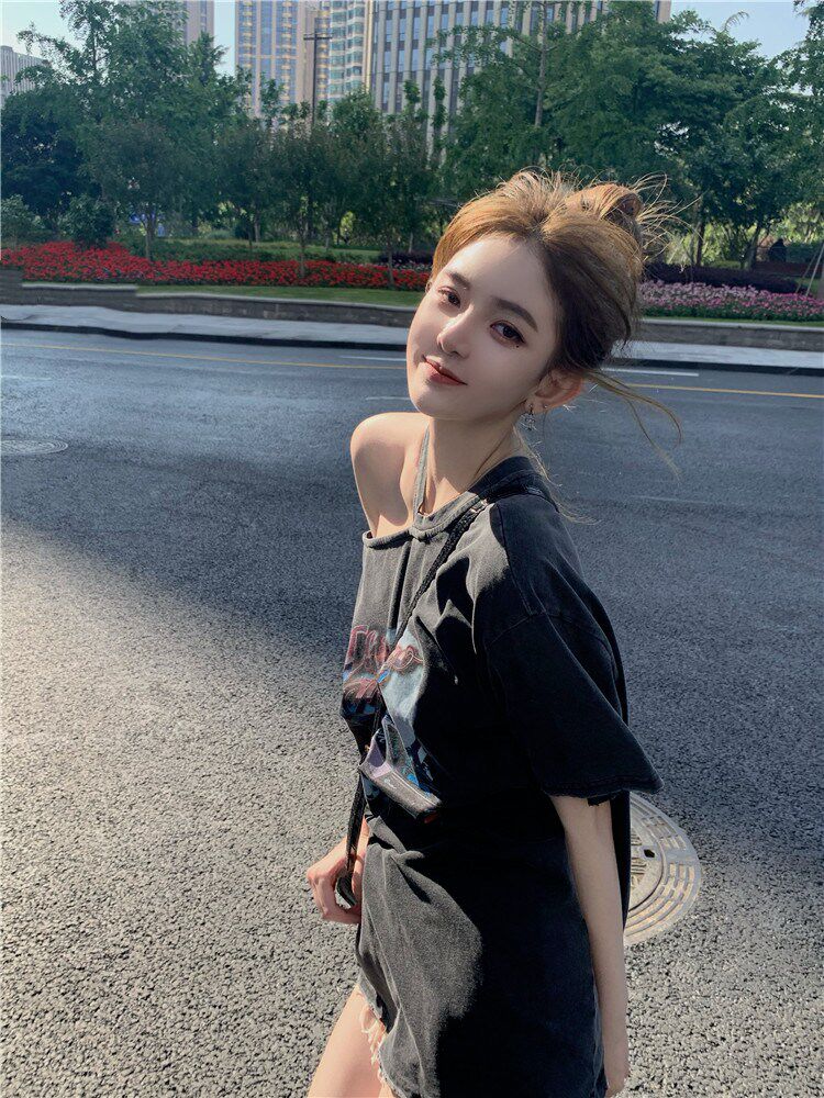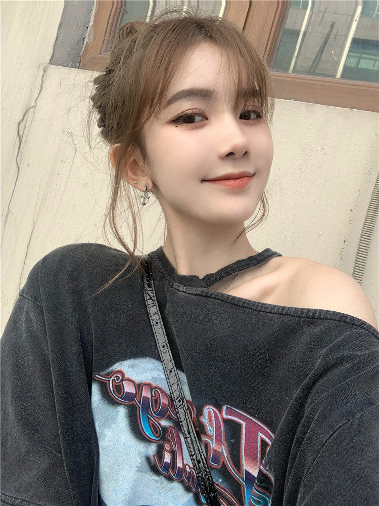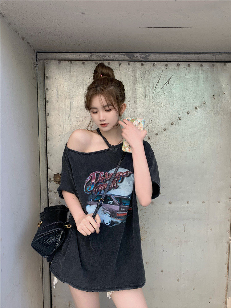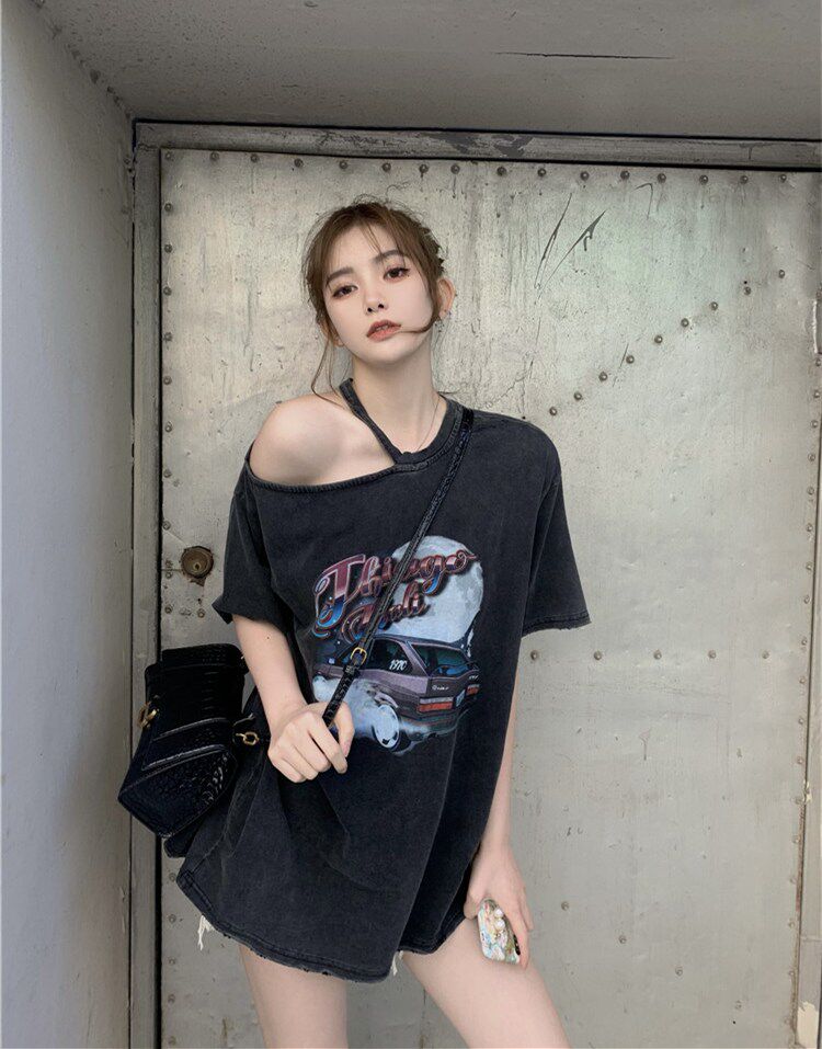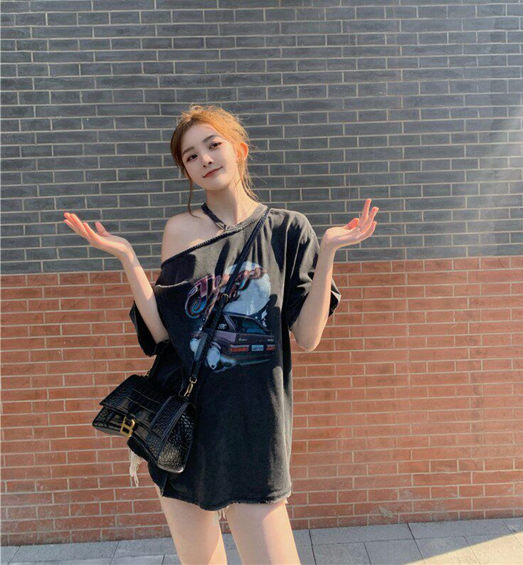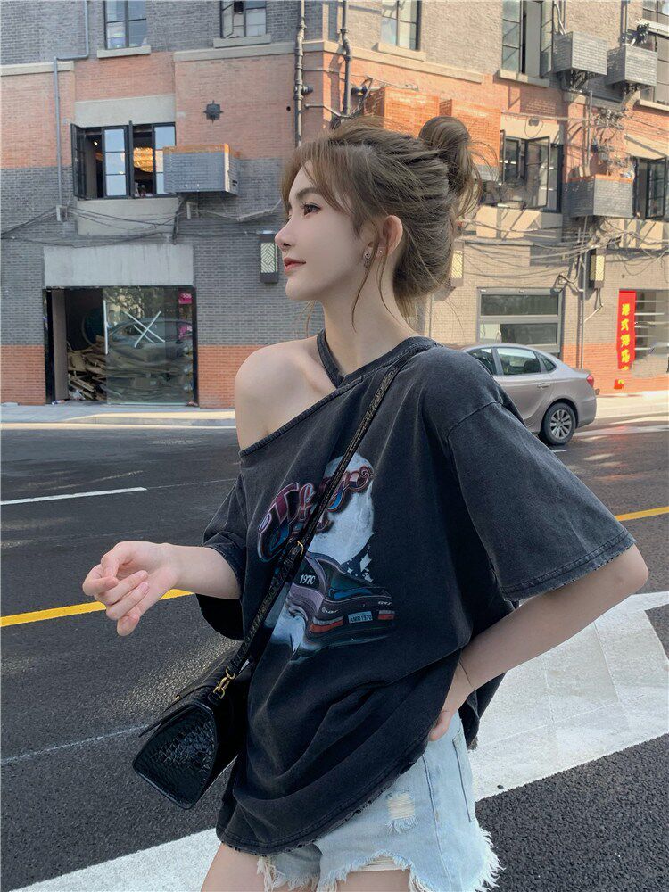 实价实拍 露肩印花T恤黑色宽松辣妹上衣