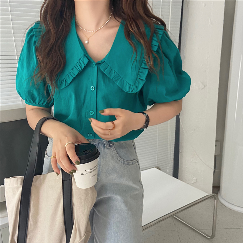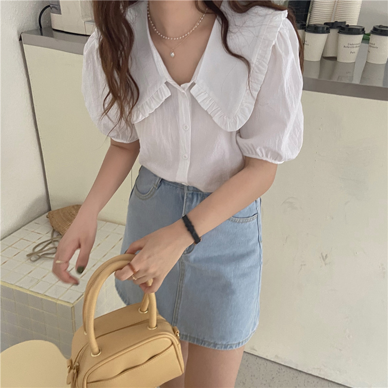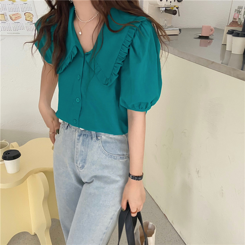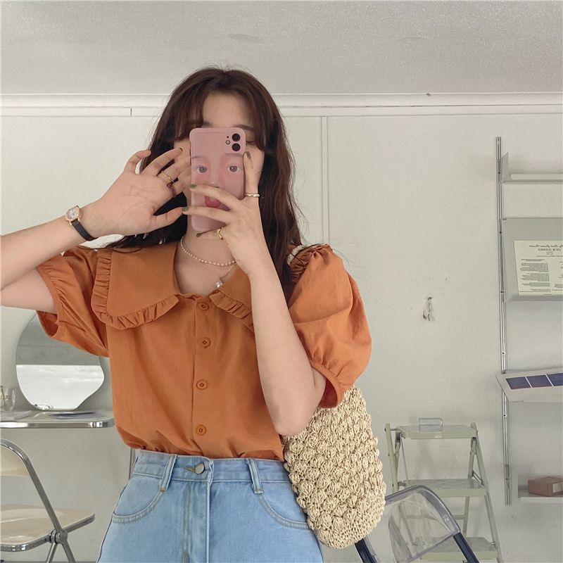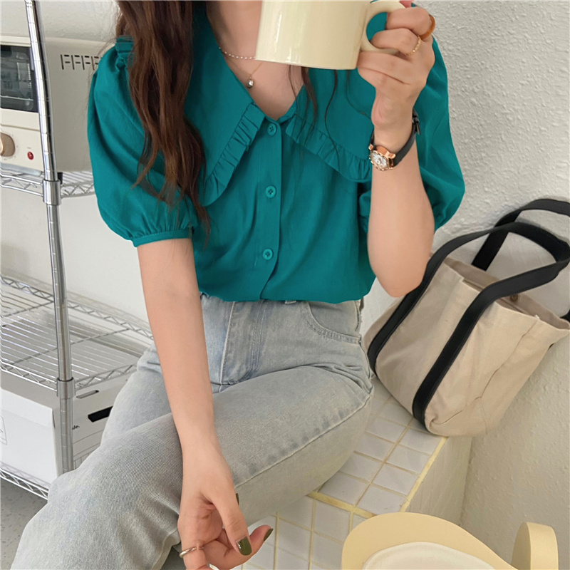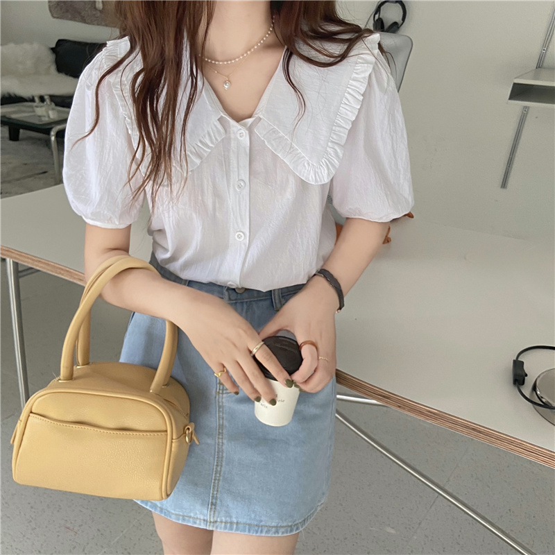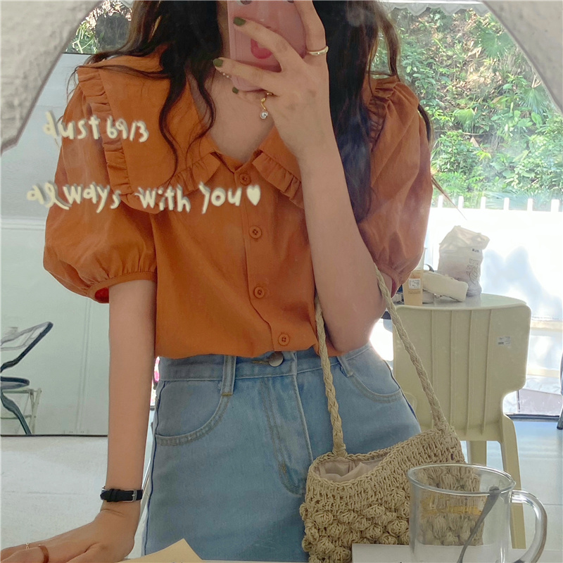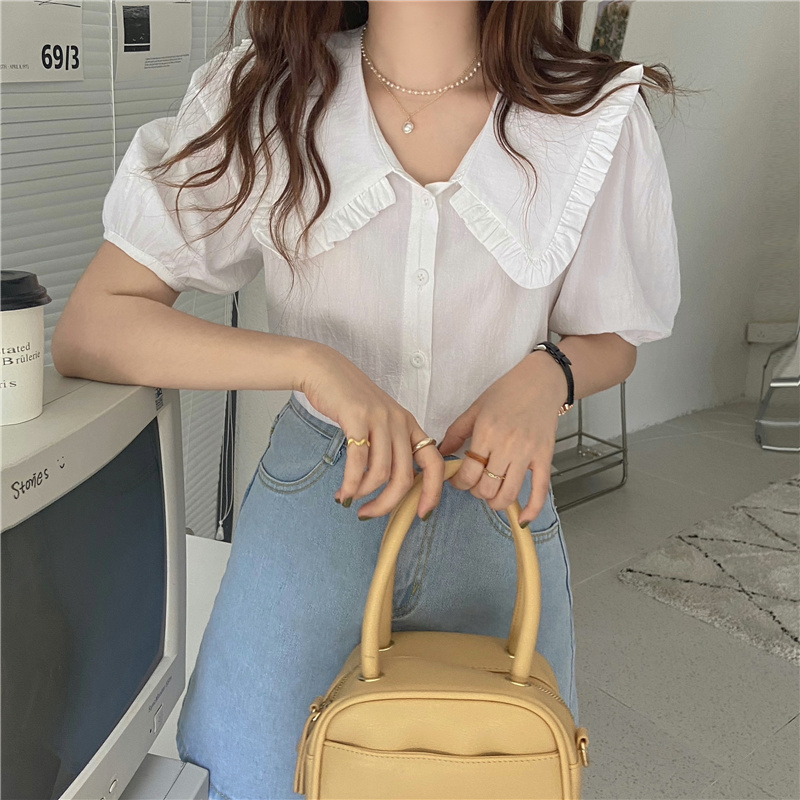 实拍实价 新款韩版气质娃娃领衬衫女泡泡短袖上衣