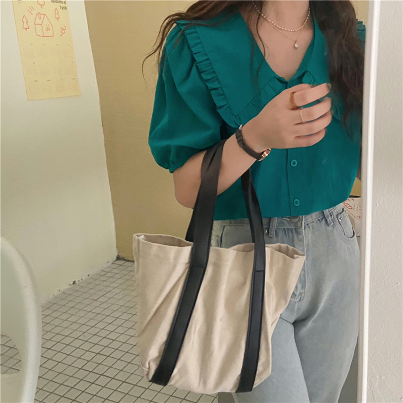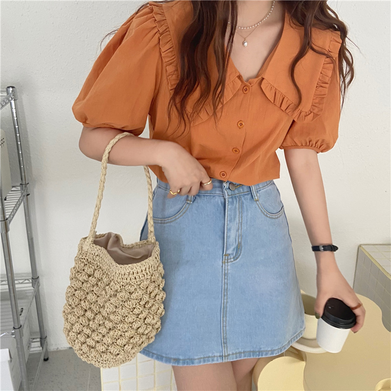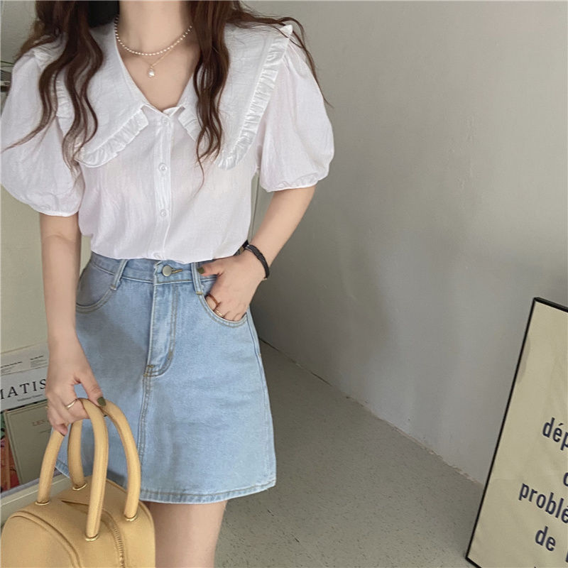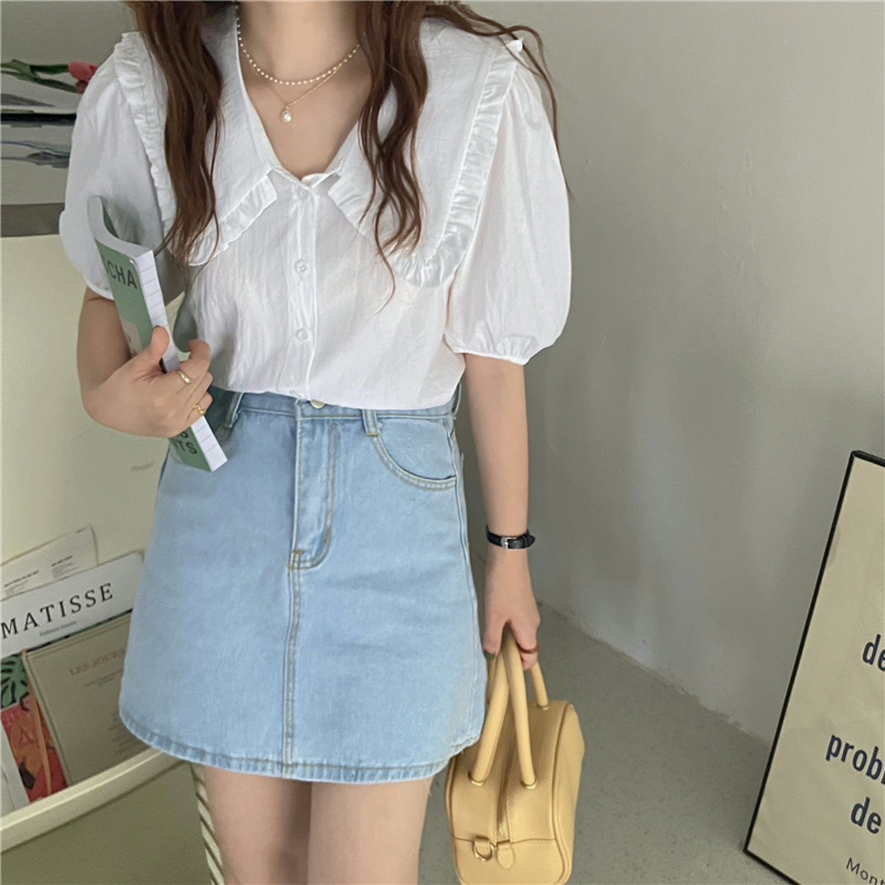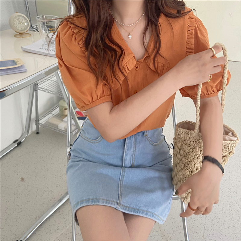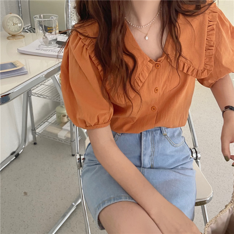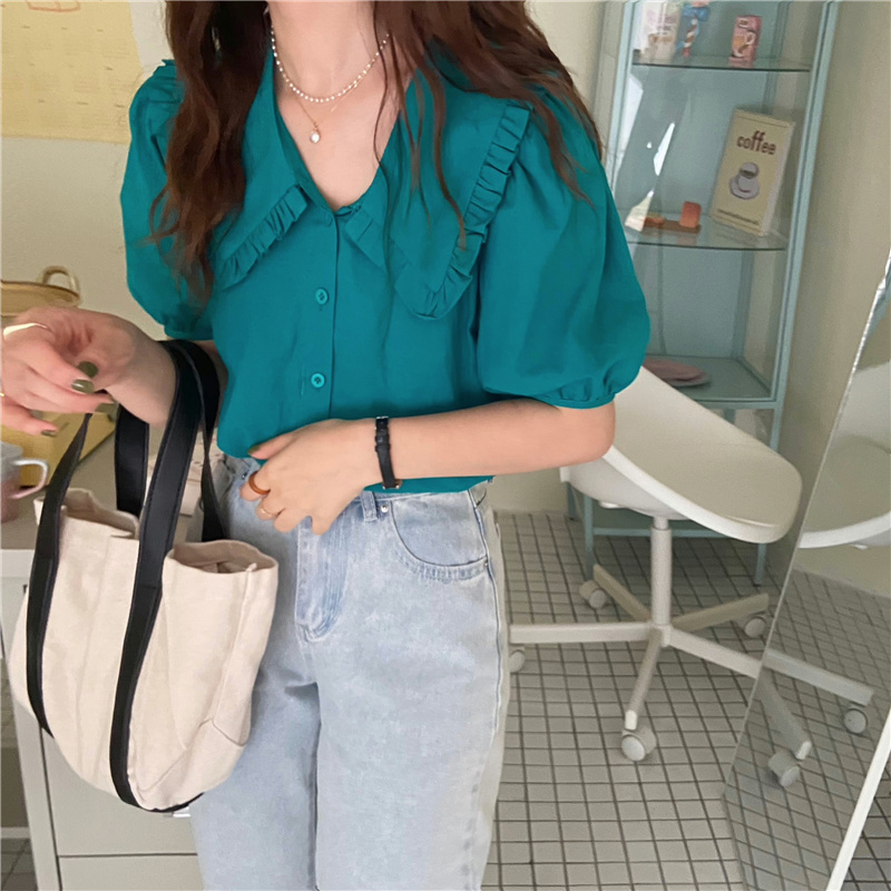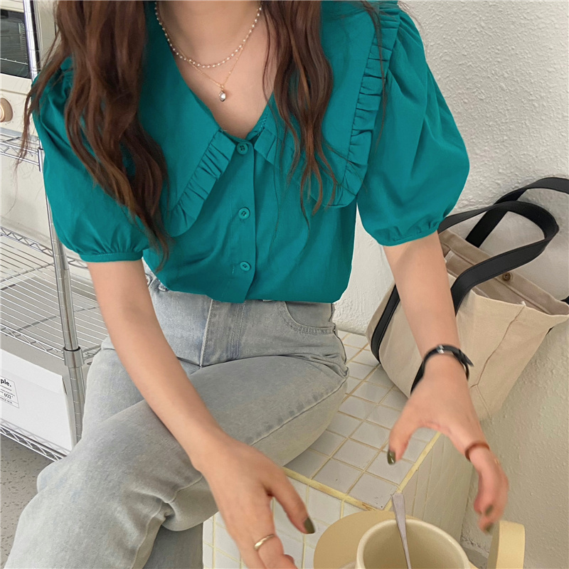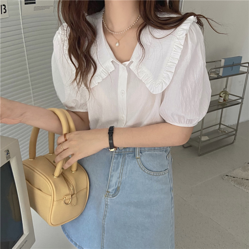 实拍实价 新款韩版气质娃娃领衬衫女泡泡短袖上衣