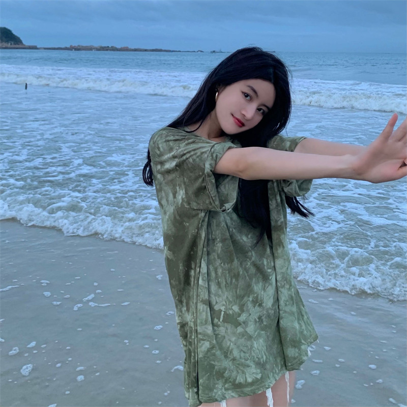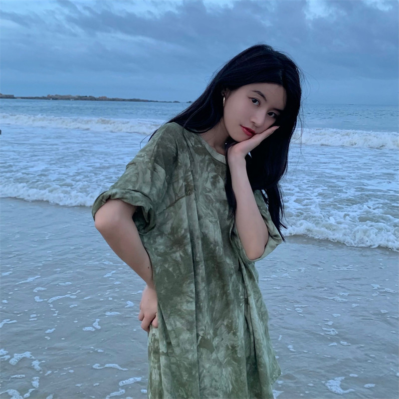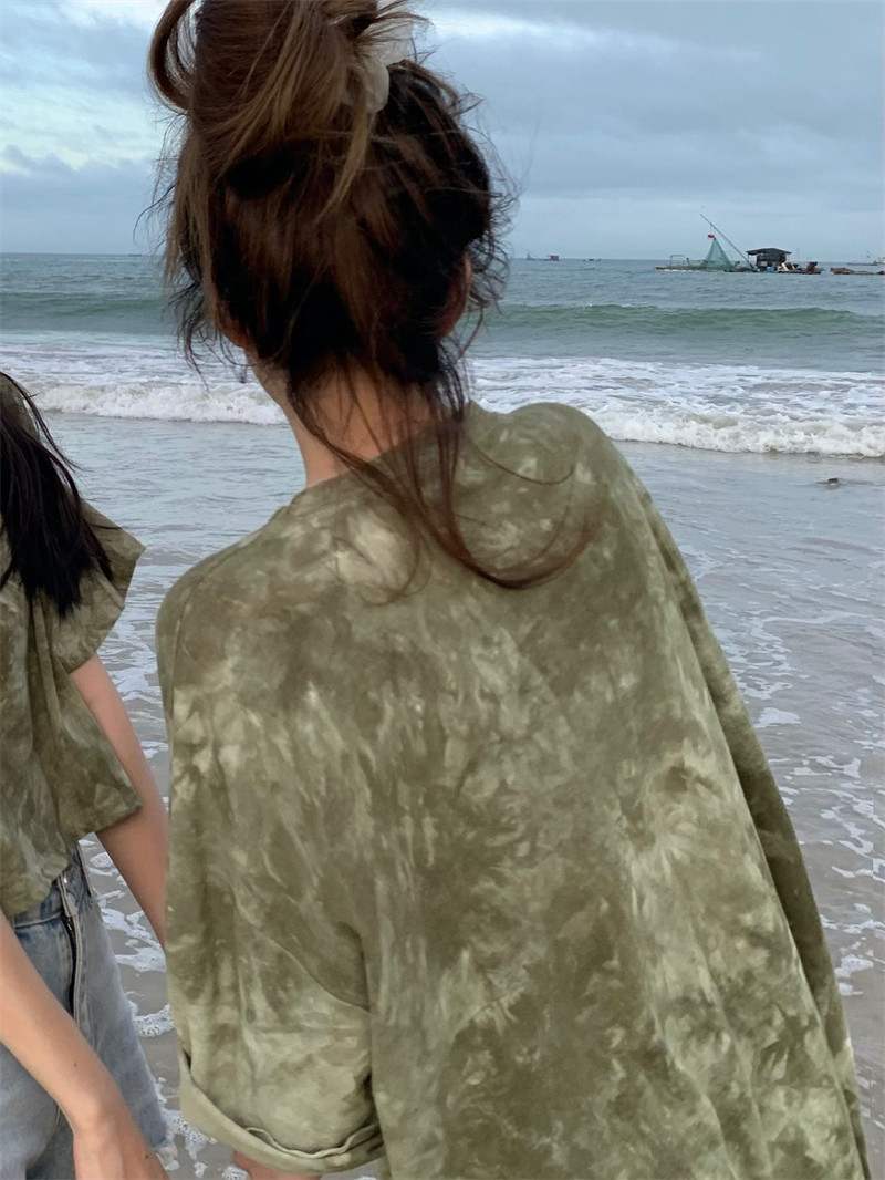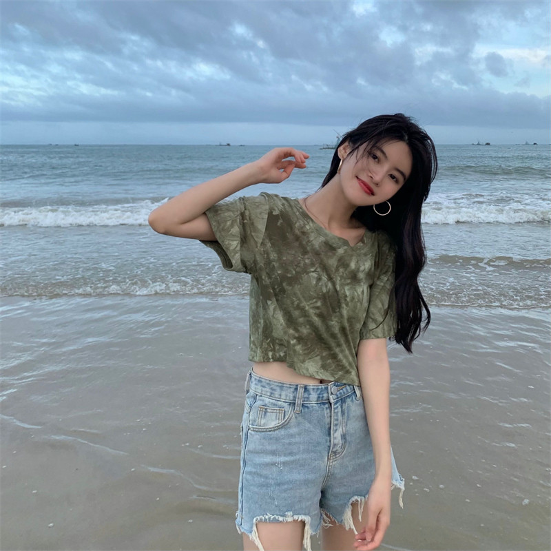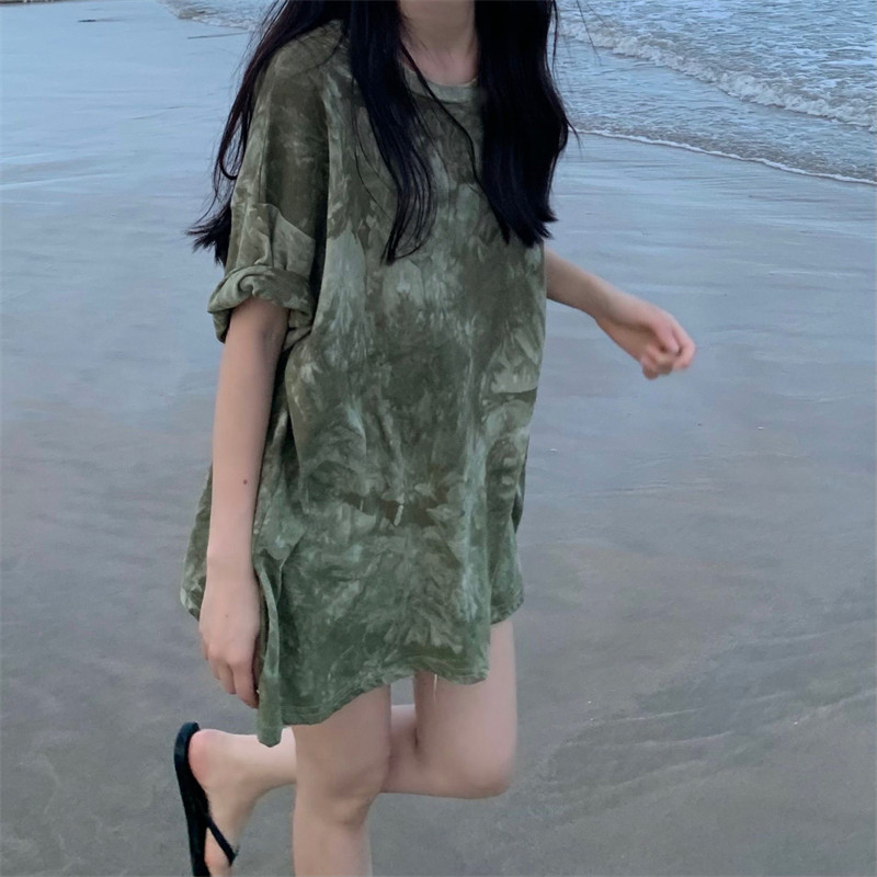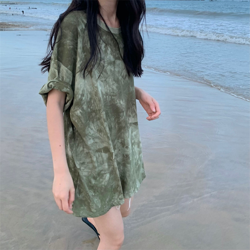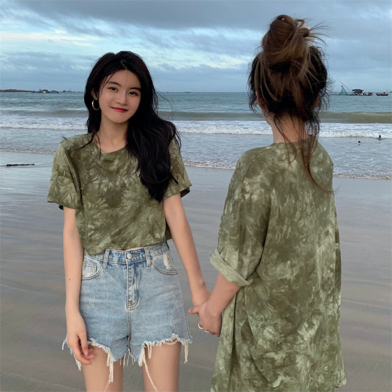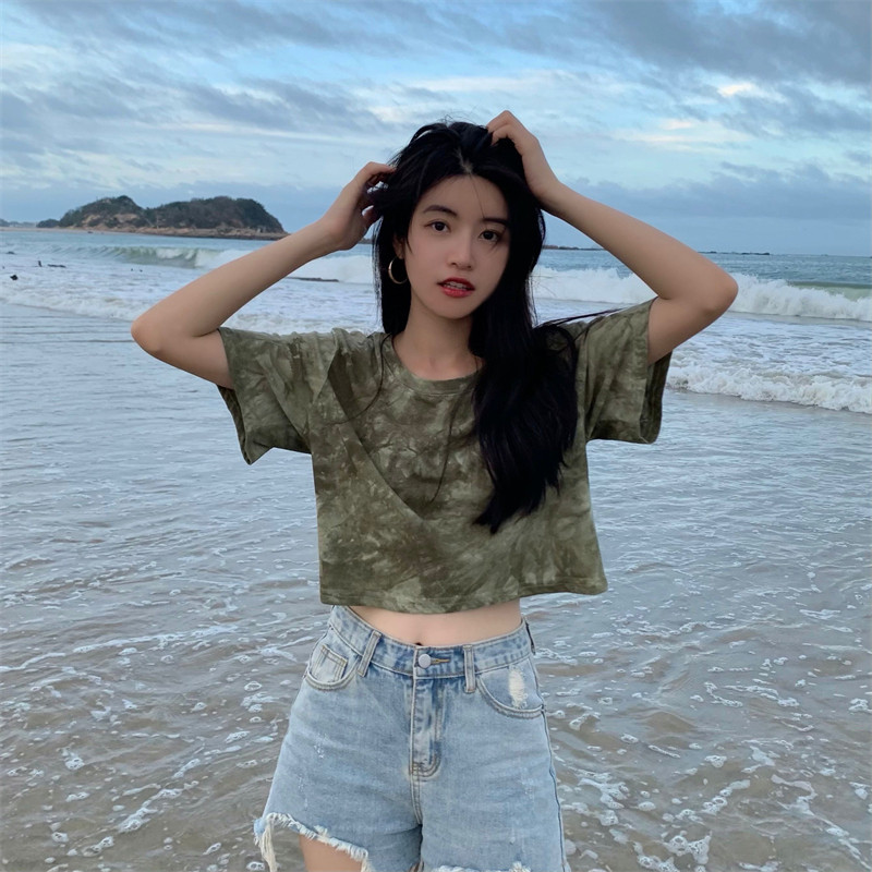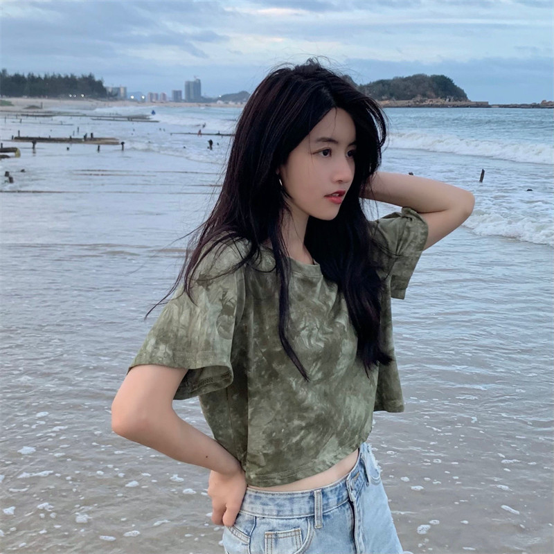新款 实拍实价 复古绿色小众扎染短袖T恤 短款/中长款