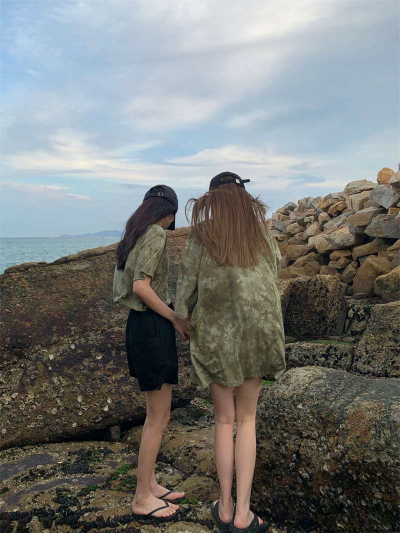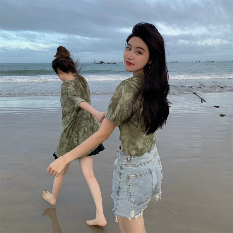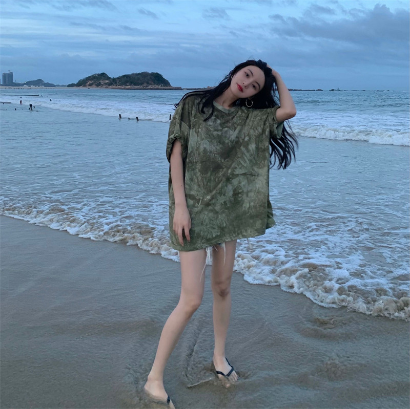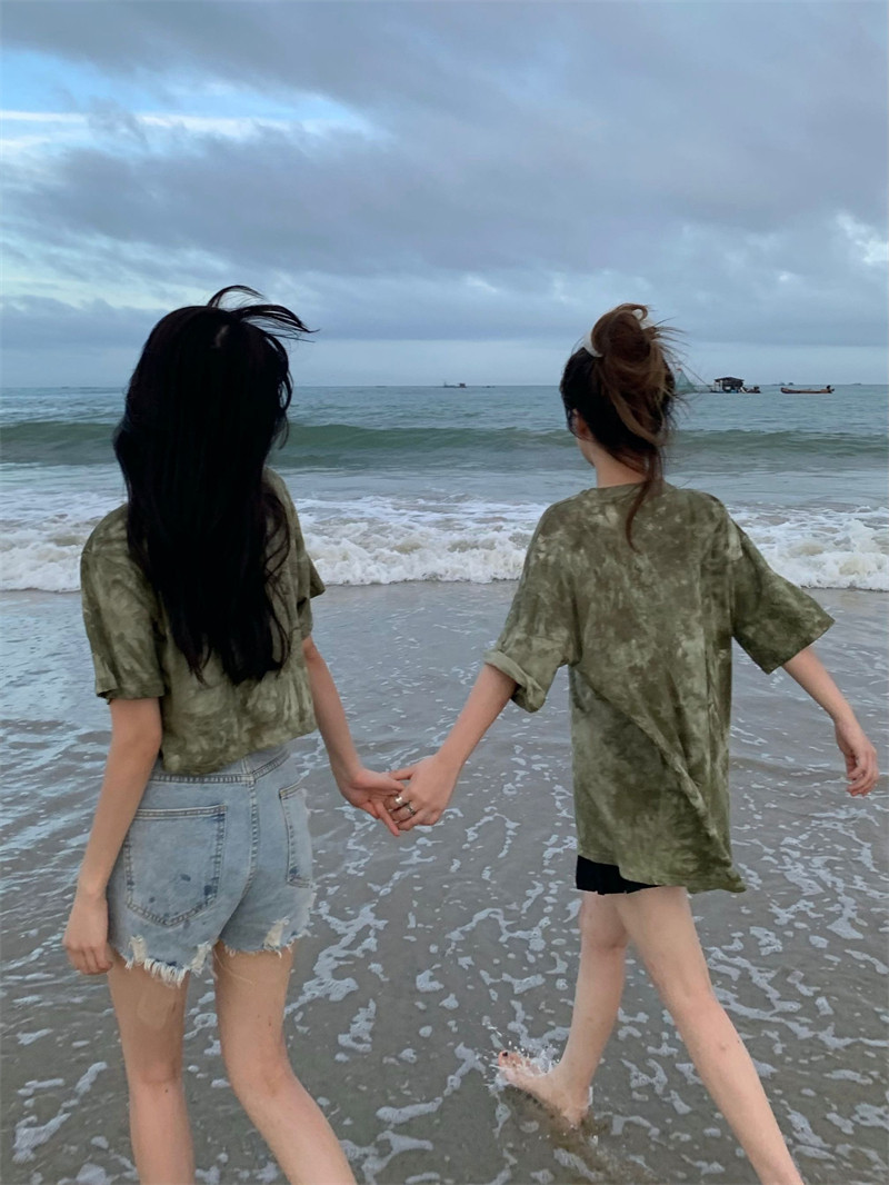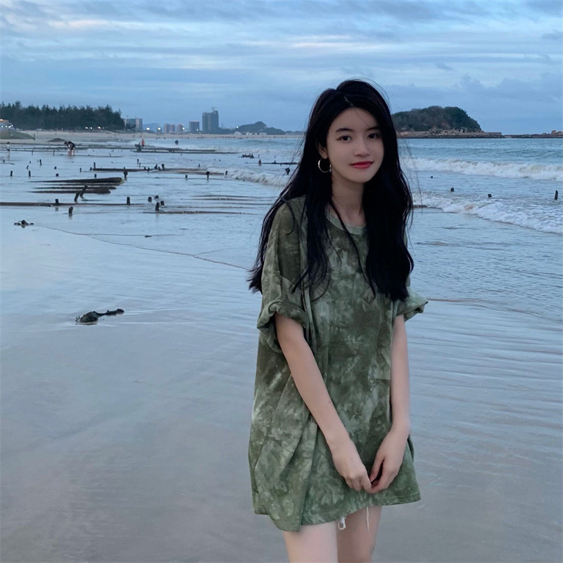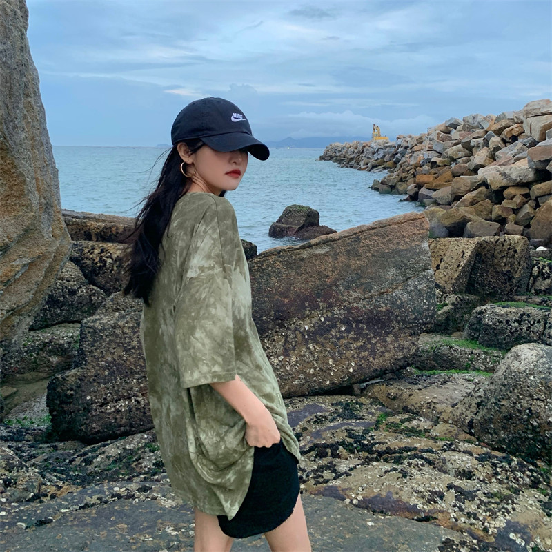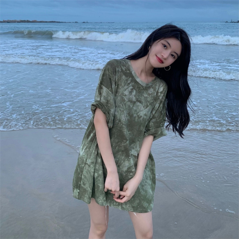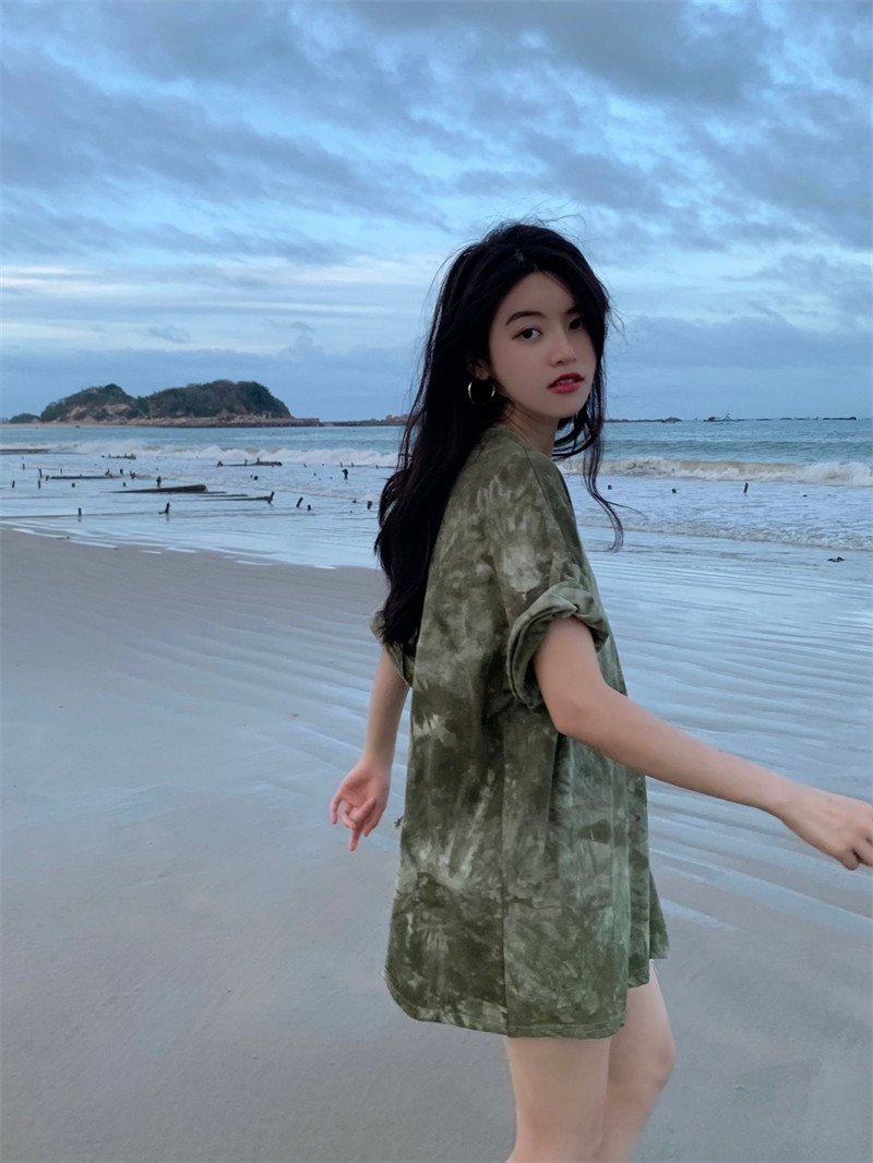 新款 实拍实价 复古绿色小众扎染短袖T恤 短款/中长款