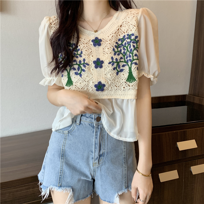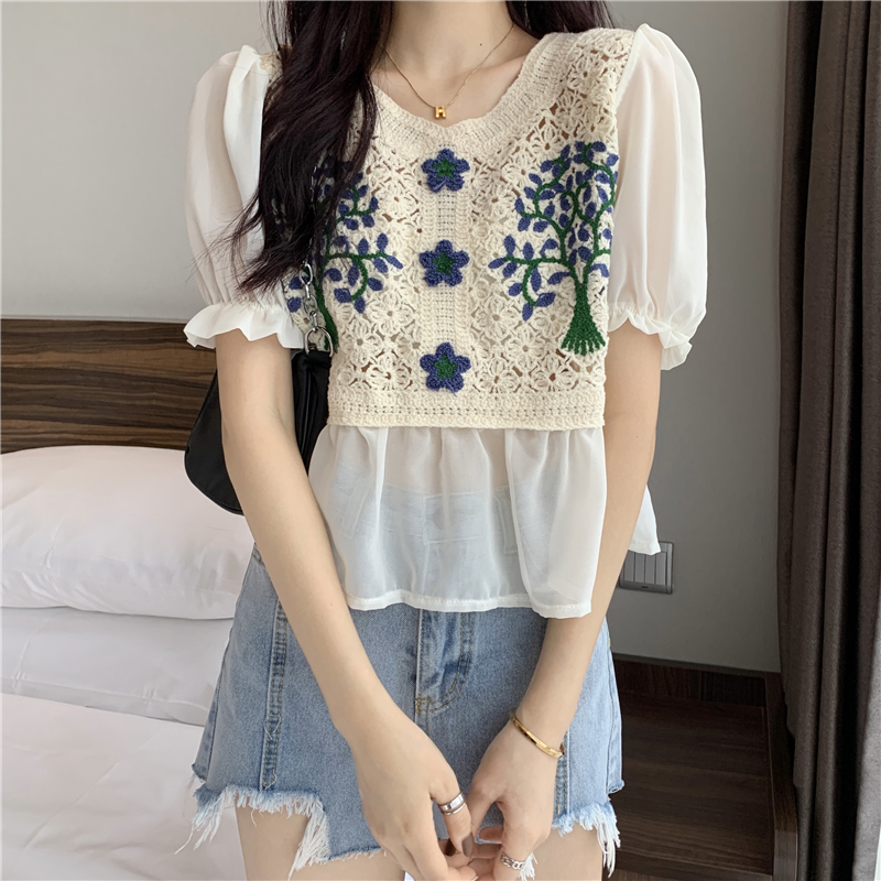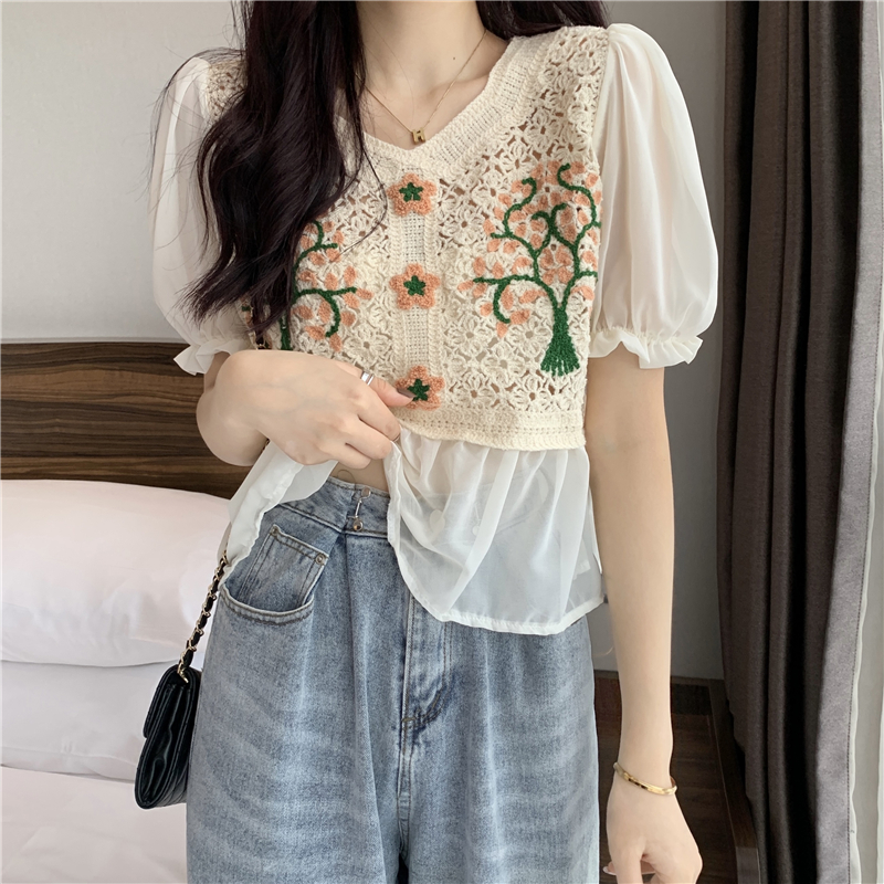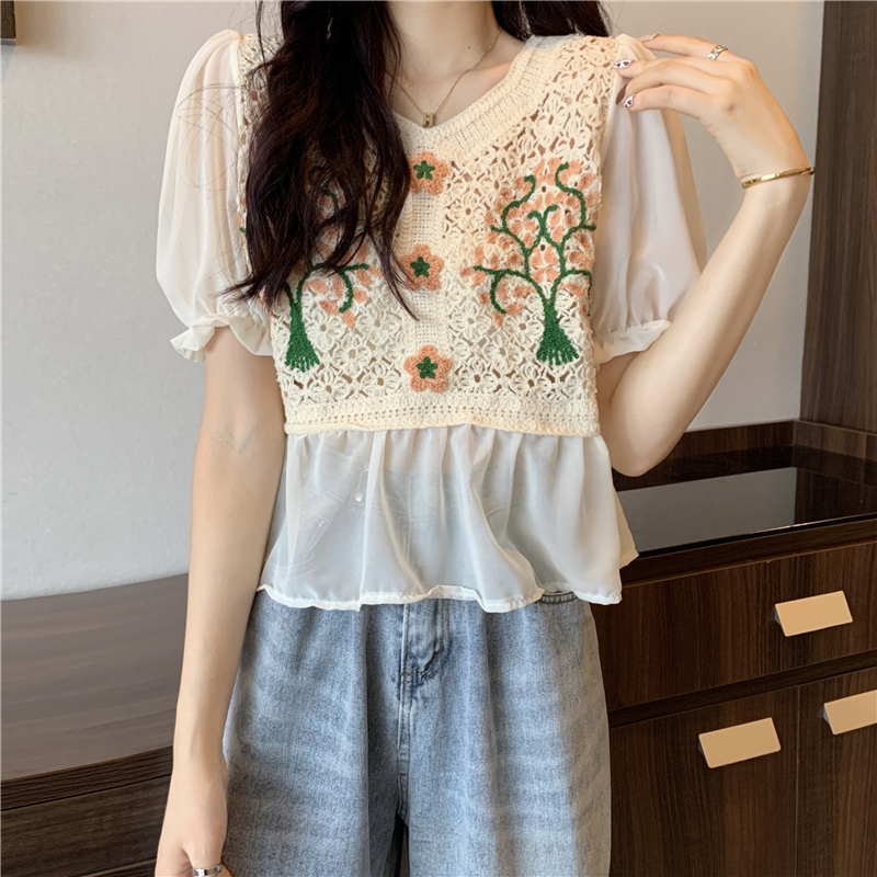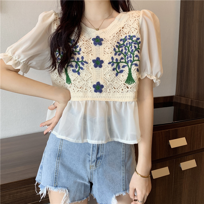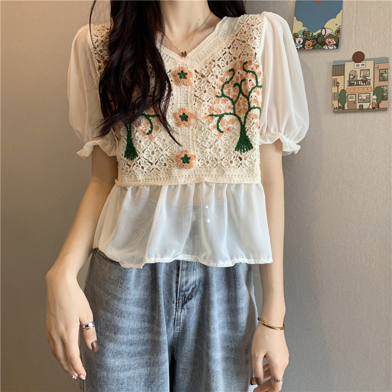 实拍实价~2021夏季新款法式镂空刺绣喇叭袖甜美拼接雪纺上衣