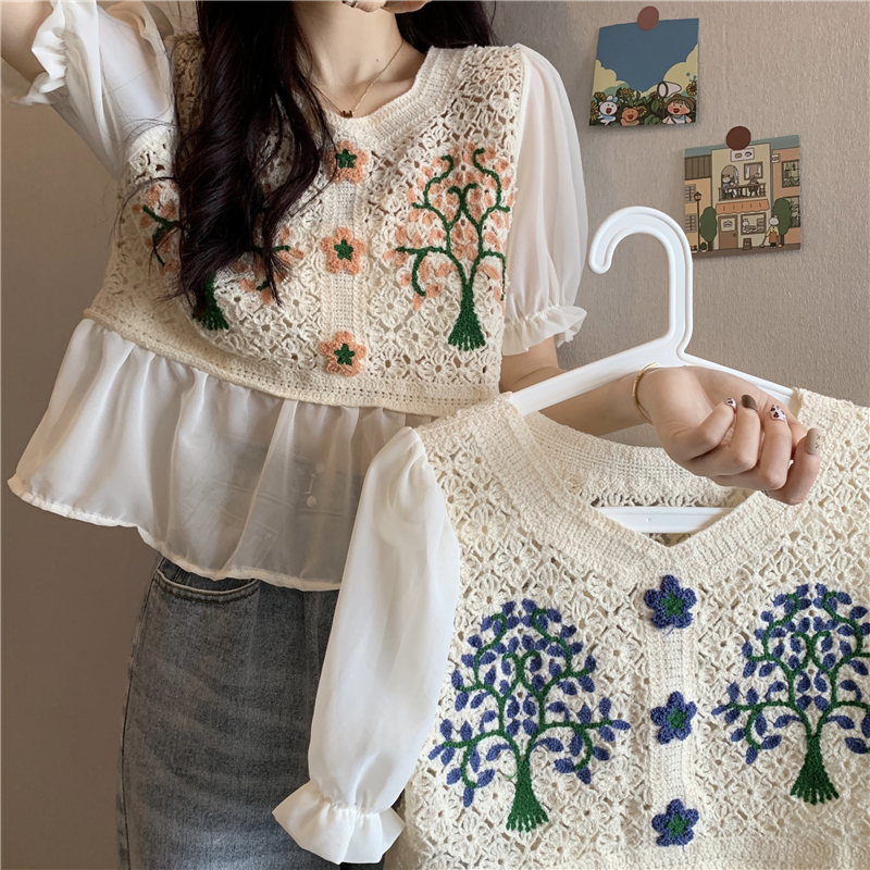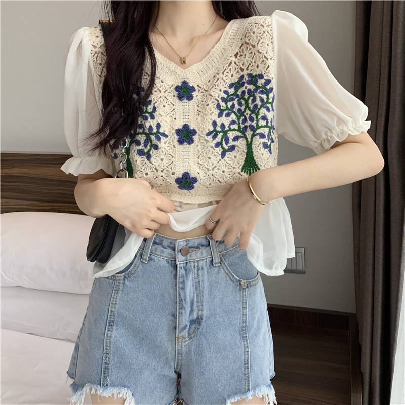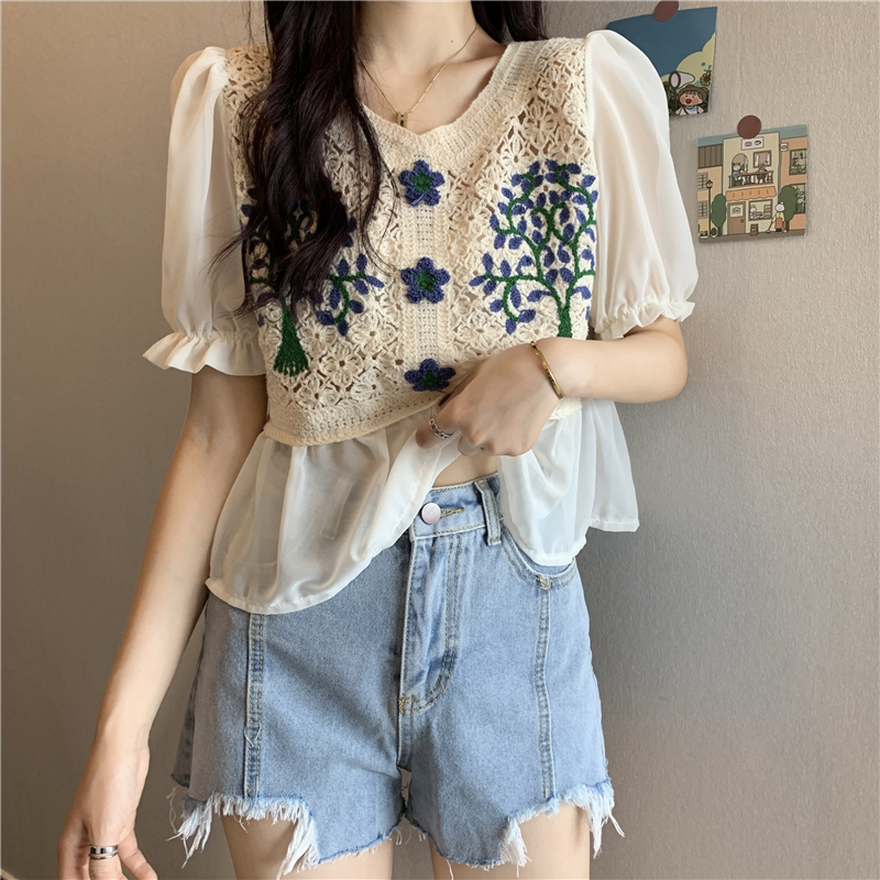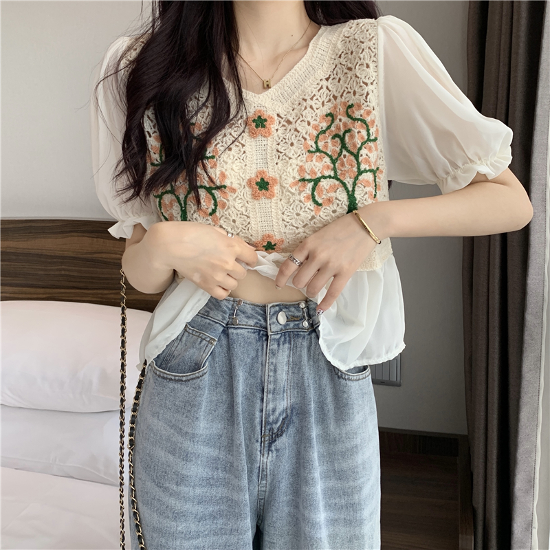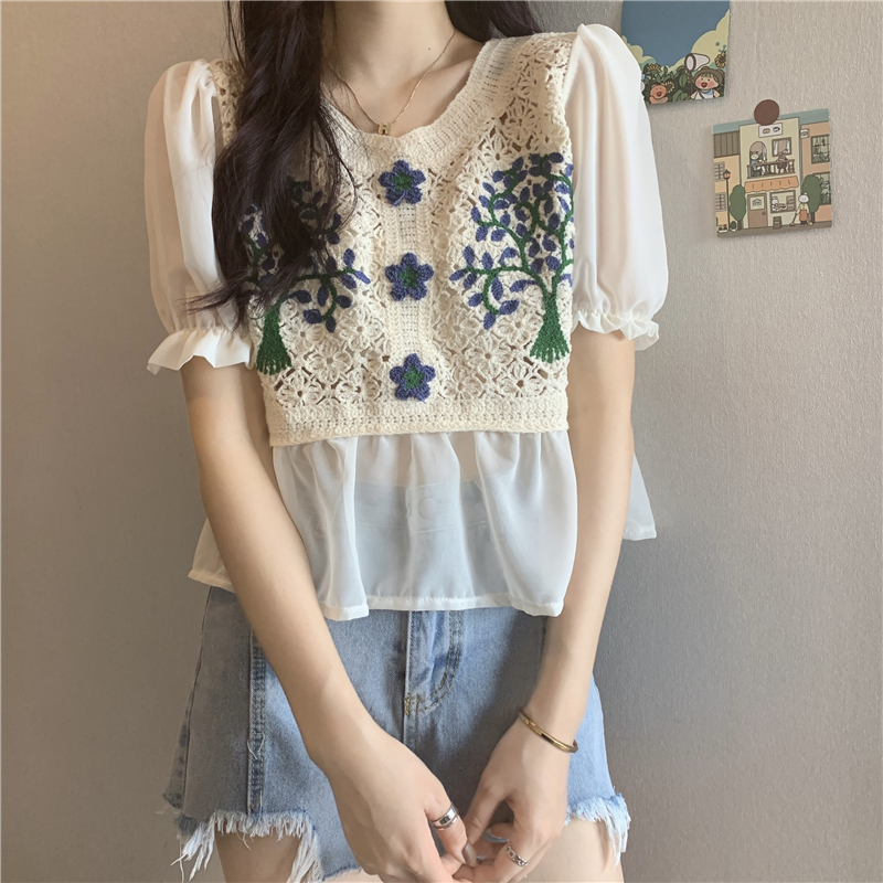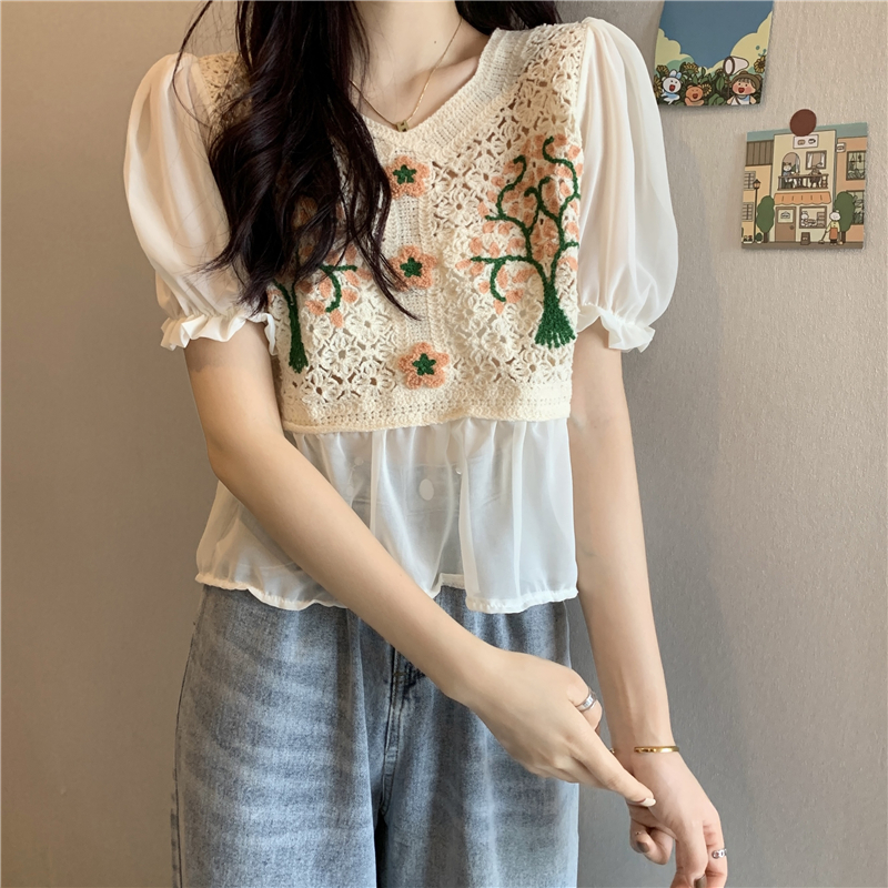 实拍实价~2021夏季新款法式镂空刺绣喇叭袖甜美拼接雪纺上衣