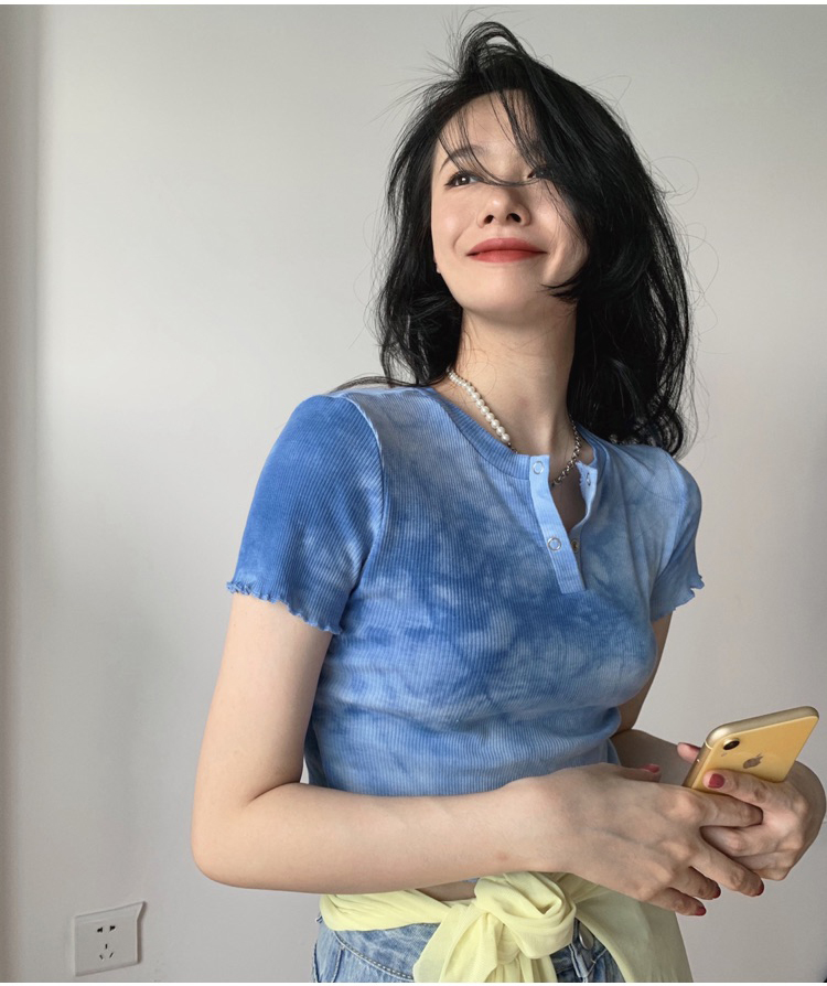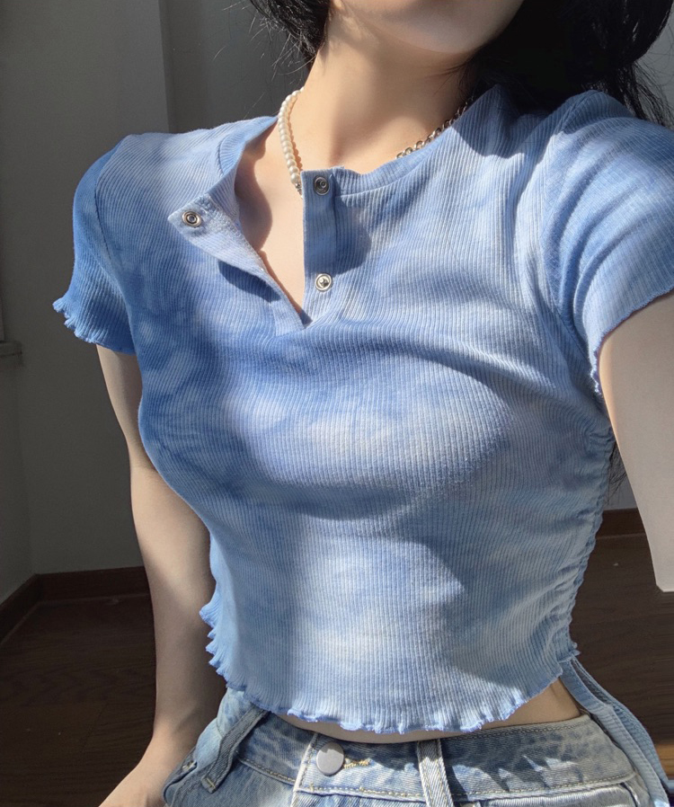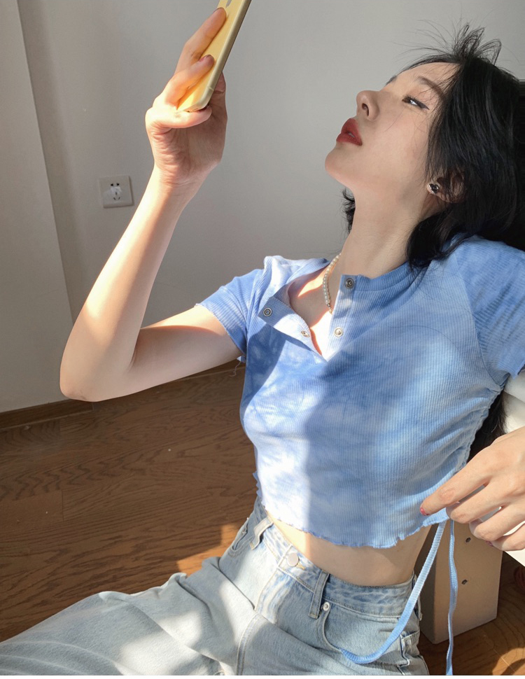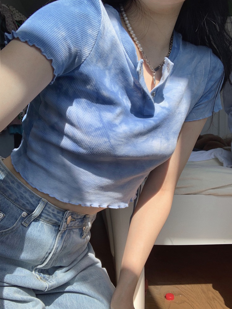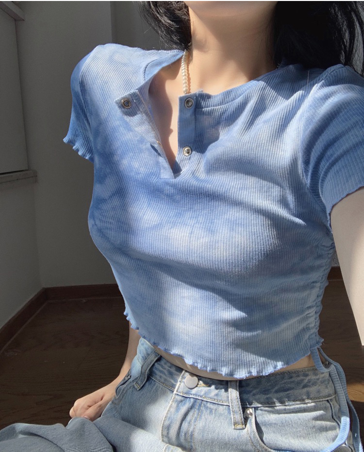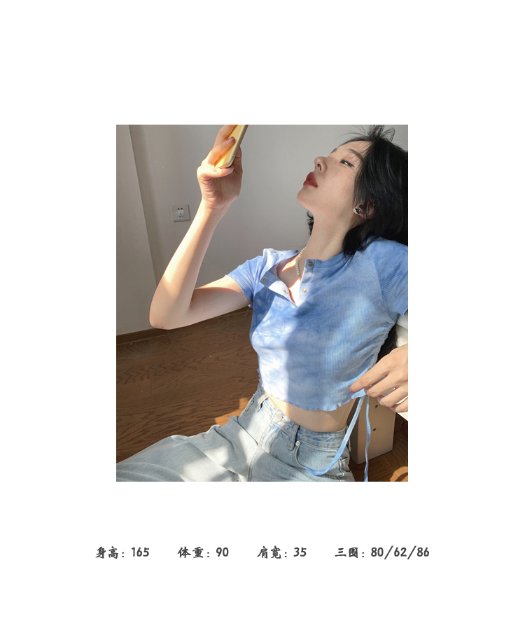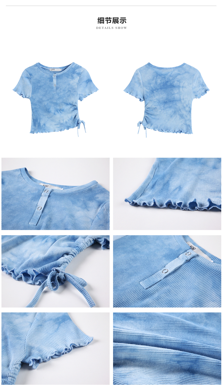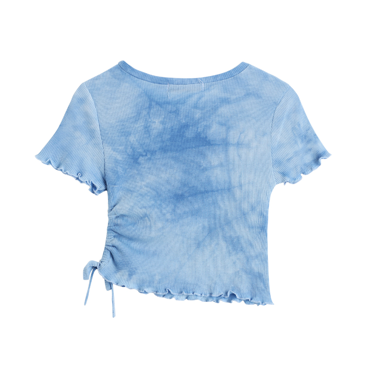 实拍 辣妹短抽褶上衣女扎染设计感高腰露脐网红炸街短袖T恤ins潮