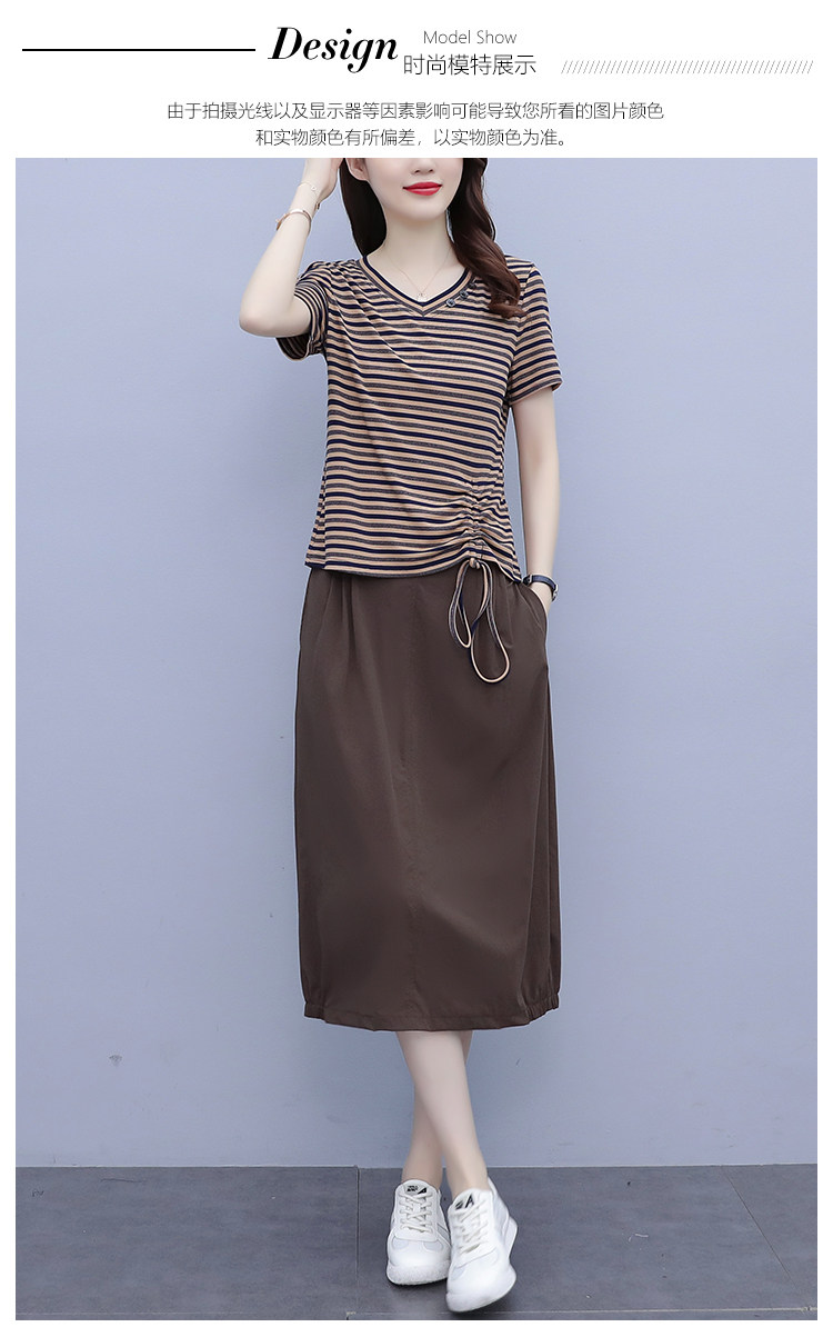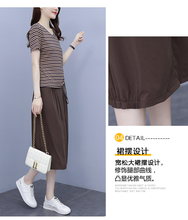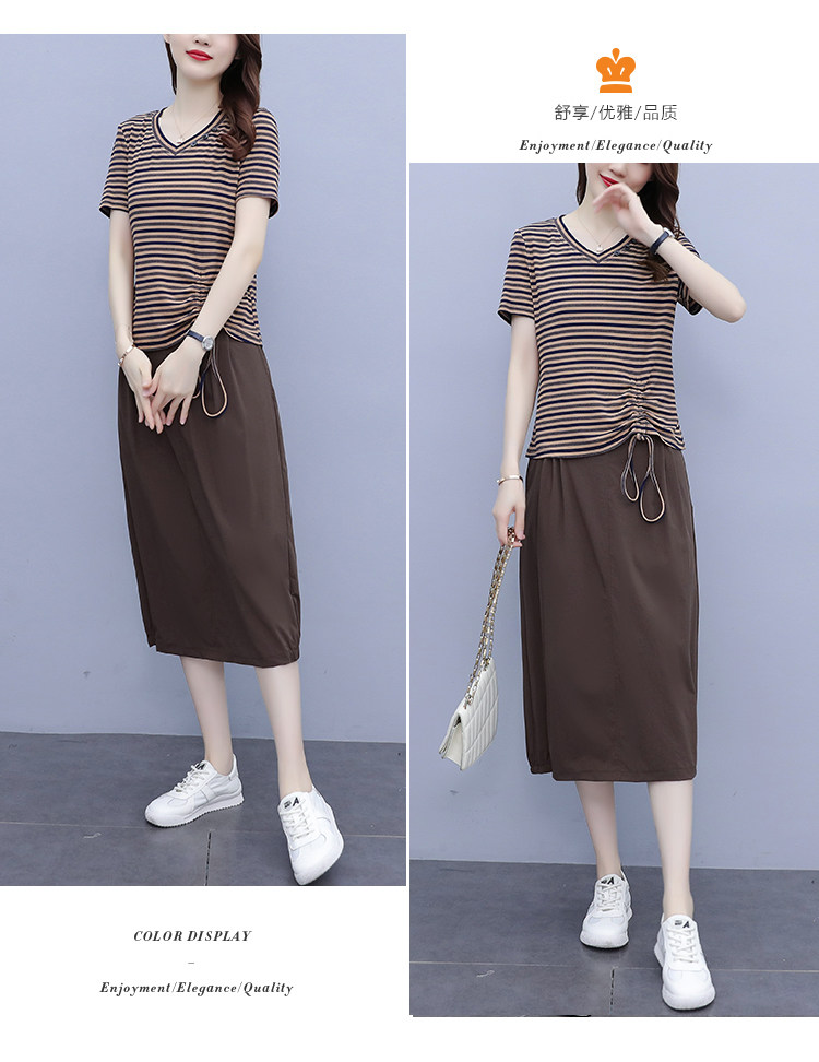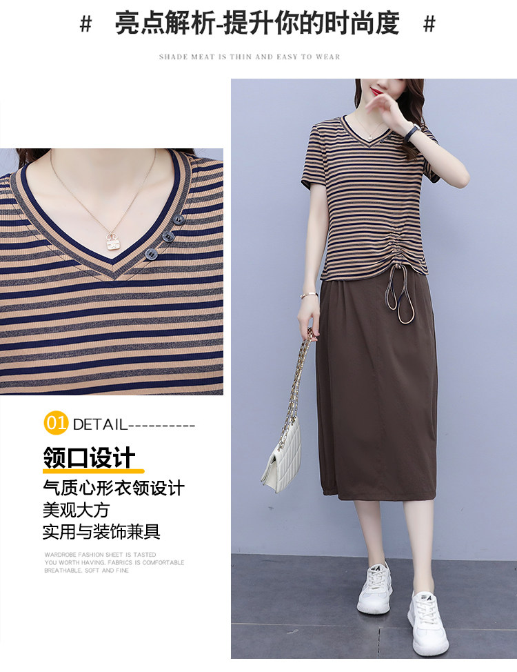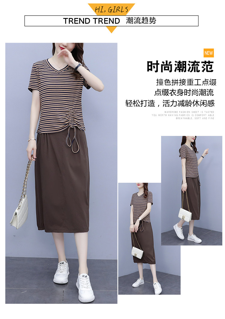 时尚套装裙女休闲2021夏装新款韩版条纹短袖洋气减龄两件套棉裙子