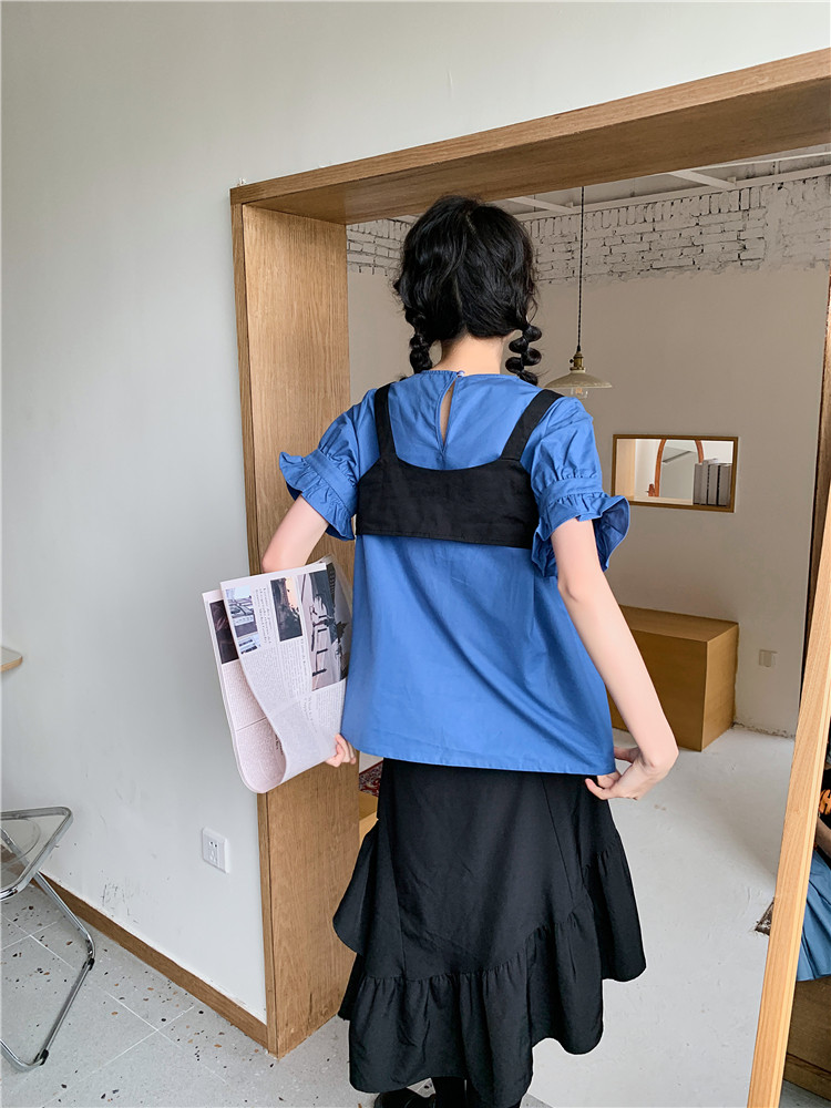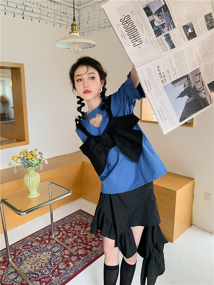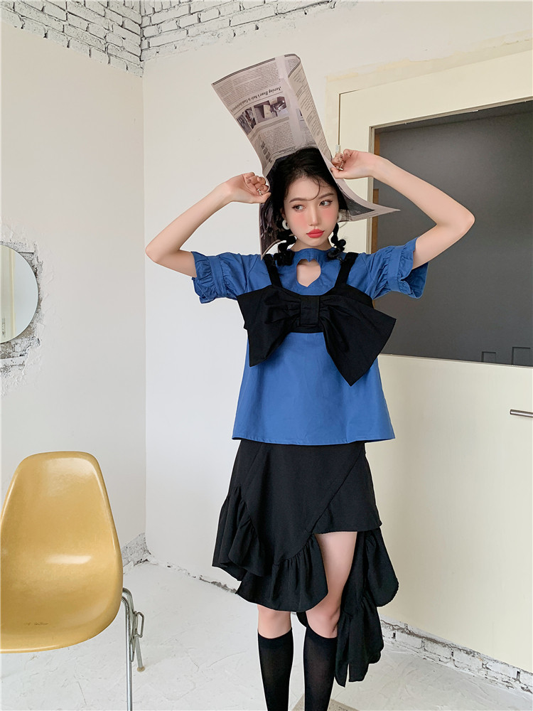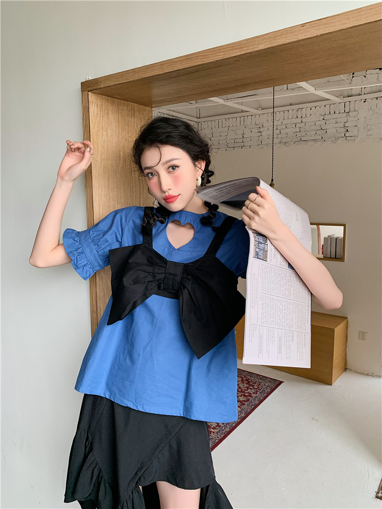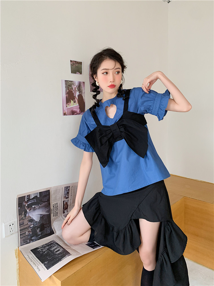 甜酷风两件套短袖上衣女2021夏新款心形镂空衬衫+蝴蝶结吊带套装