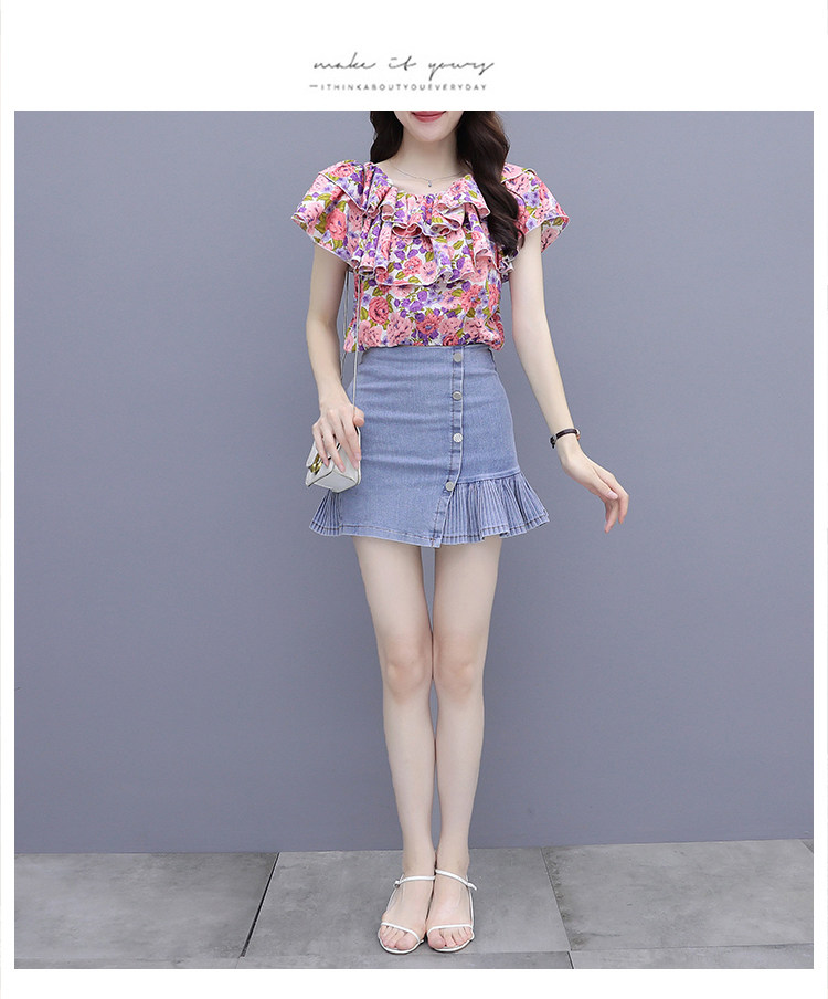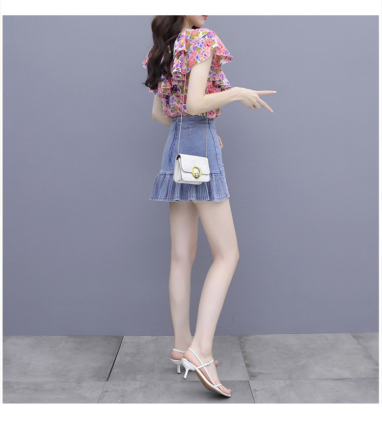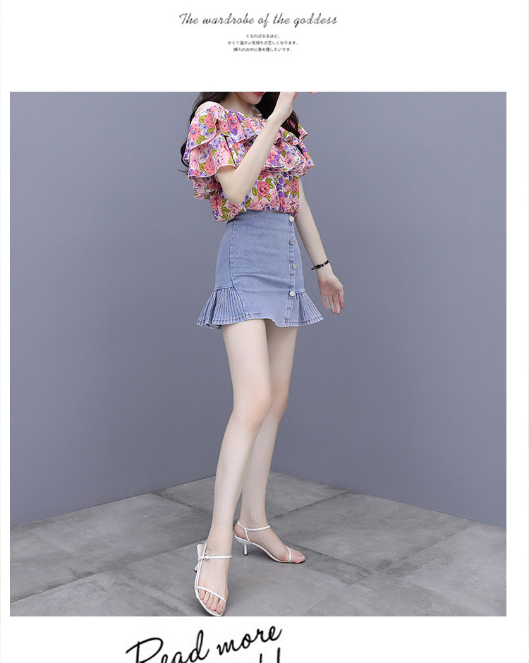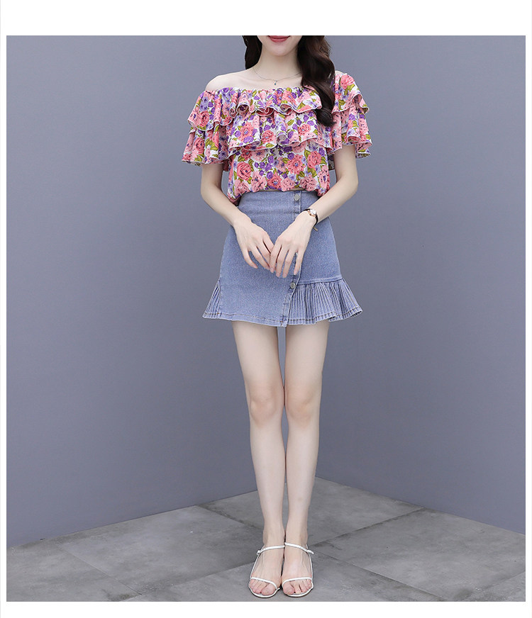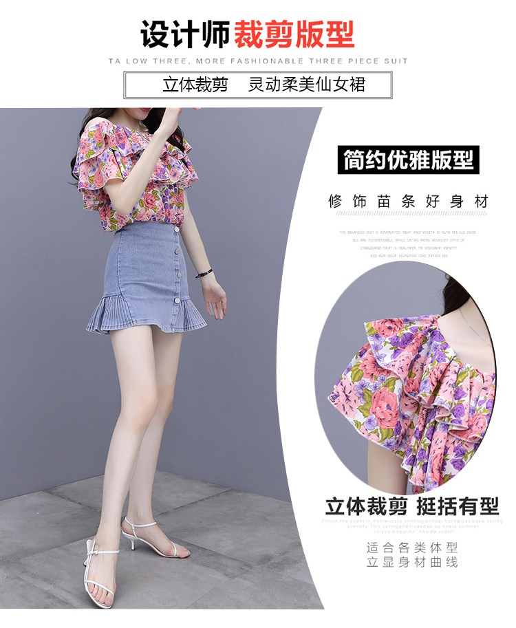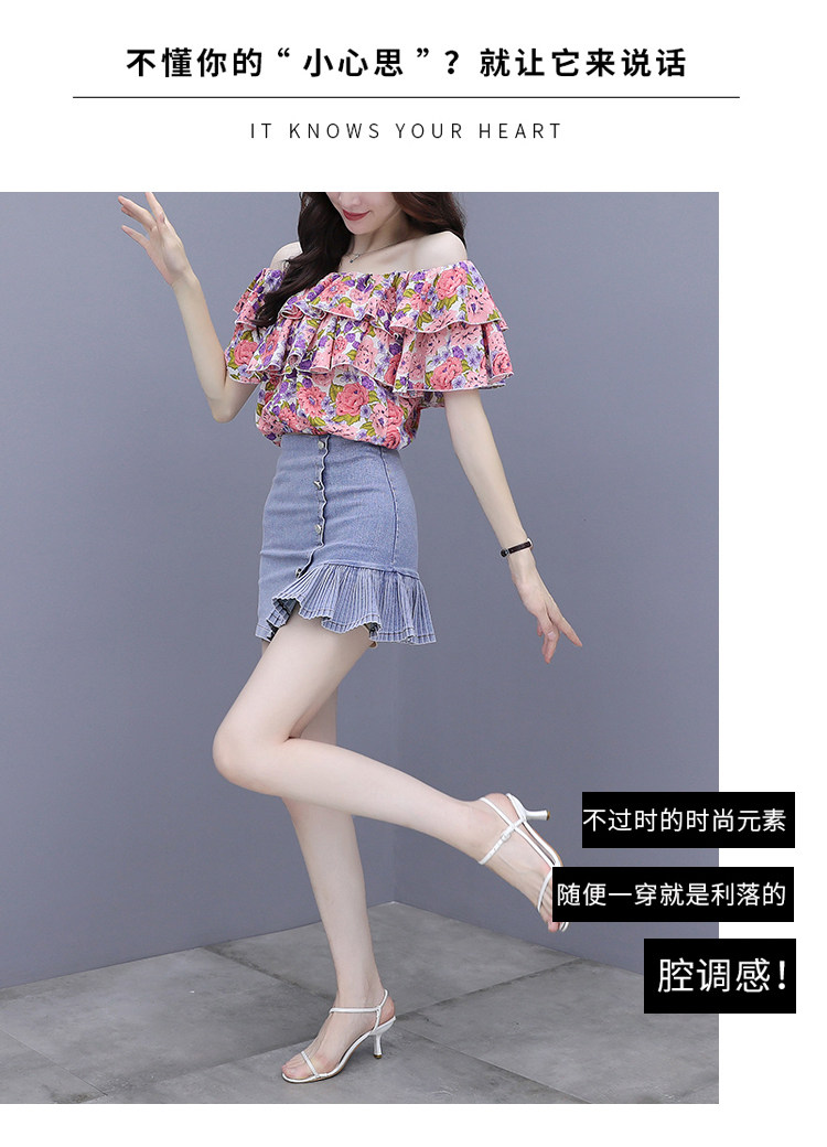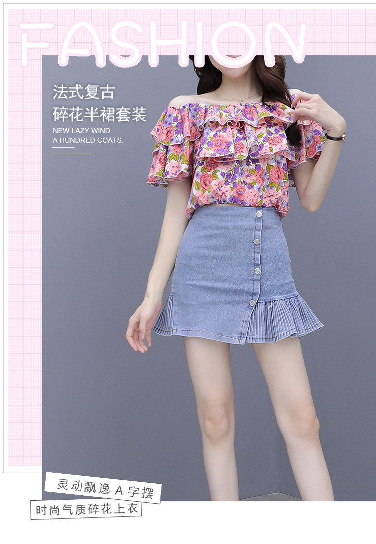 实拍 夏季款洋气一字肩短袖碎花t恤+高腰牛仔不规则短裙女套装