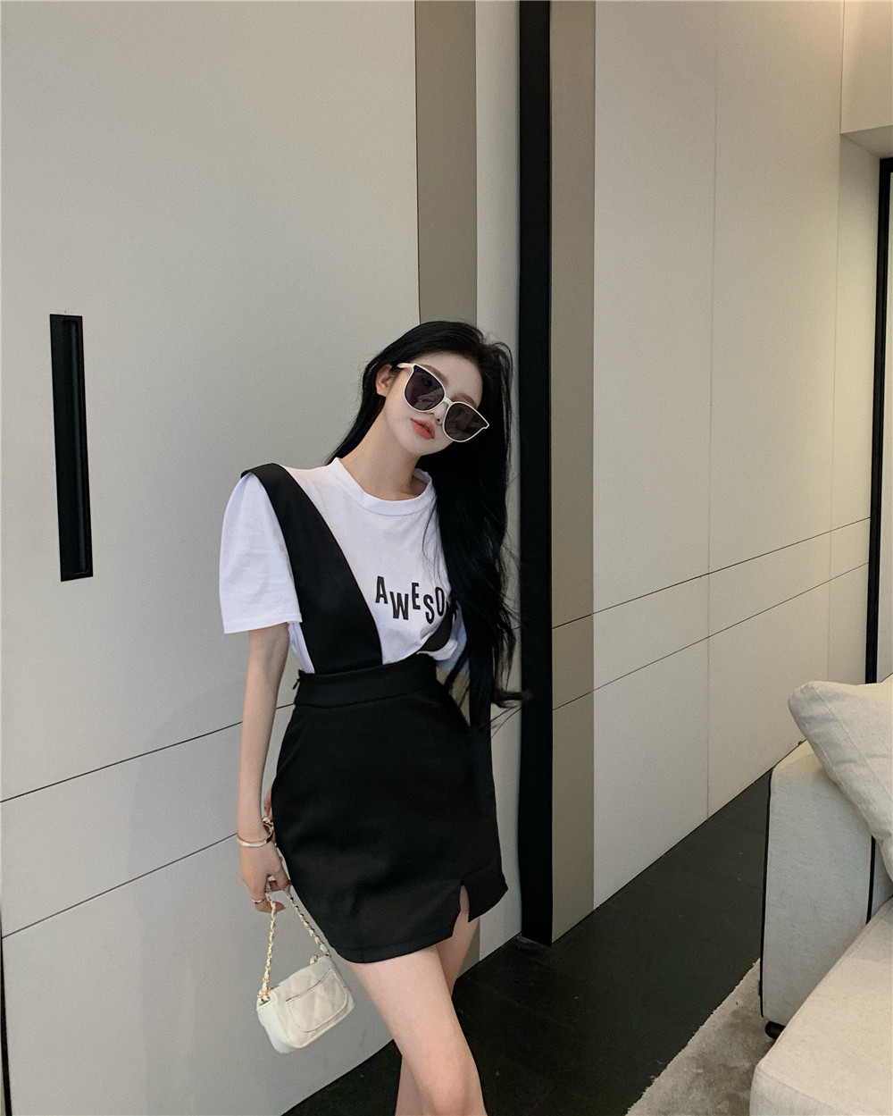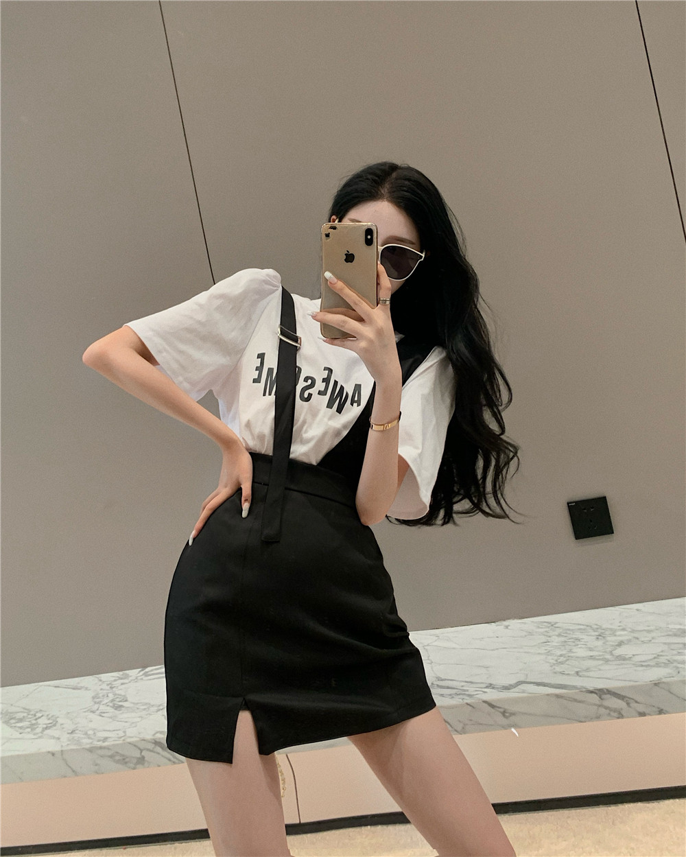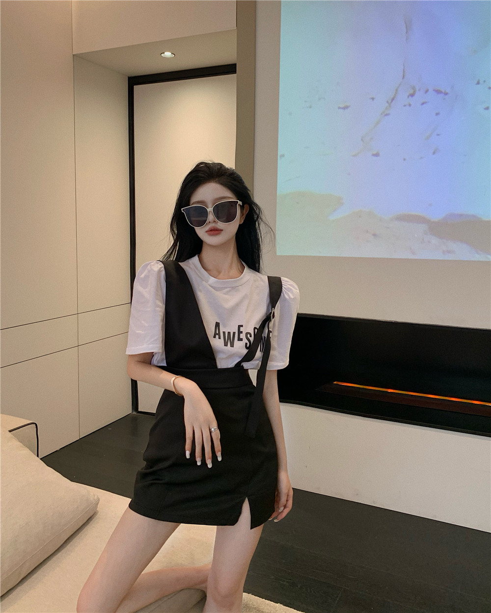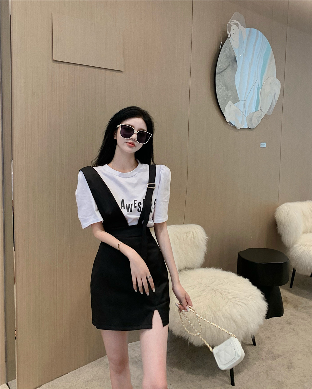 实拍 实价 泡泡袖字母印花T恤+开叉高腰背带裙