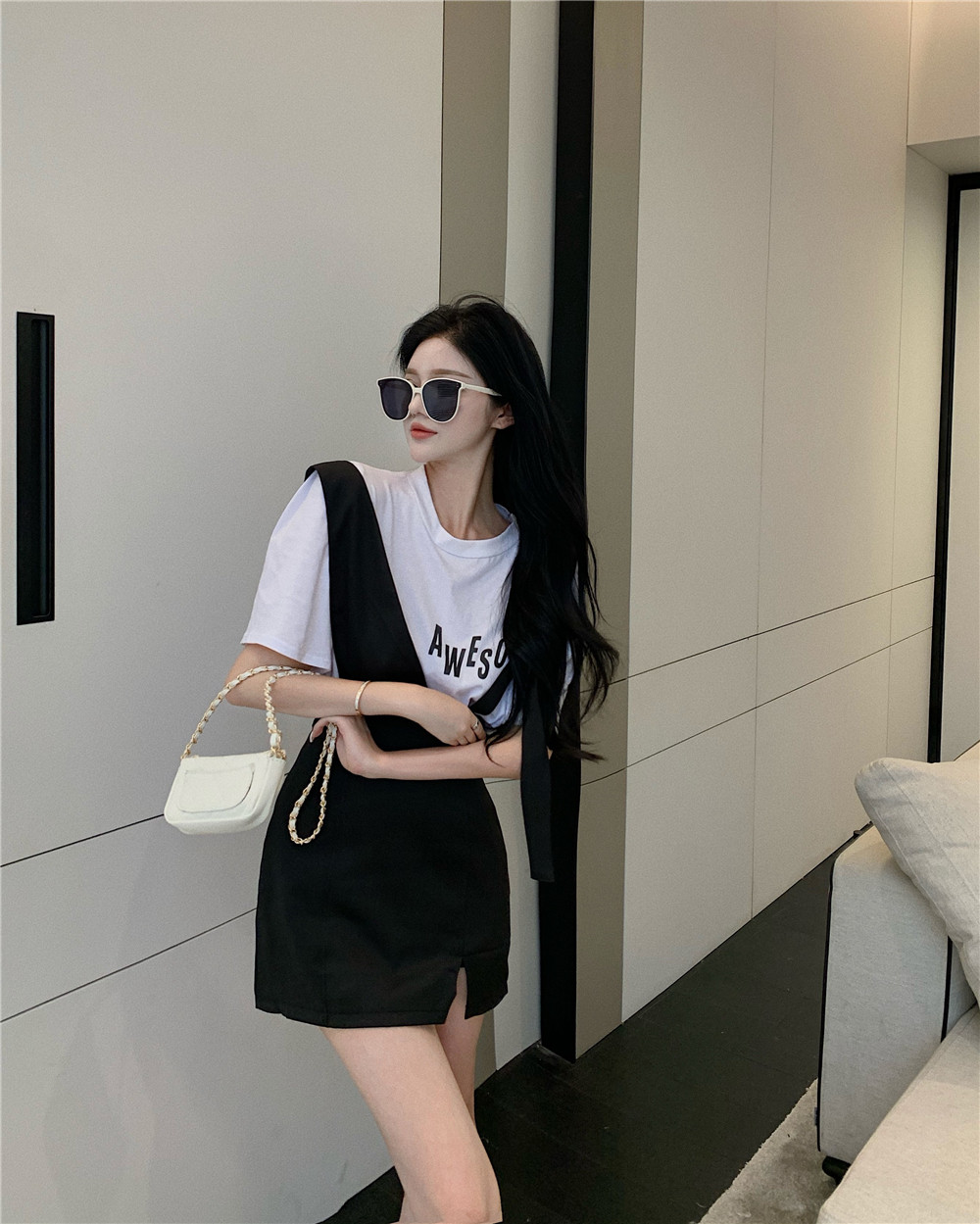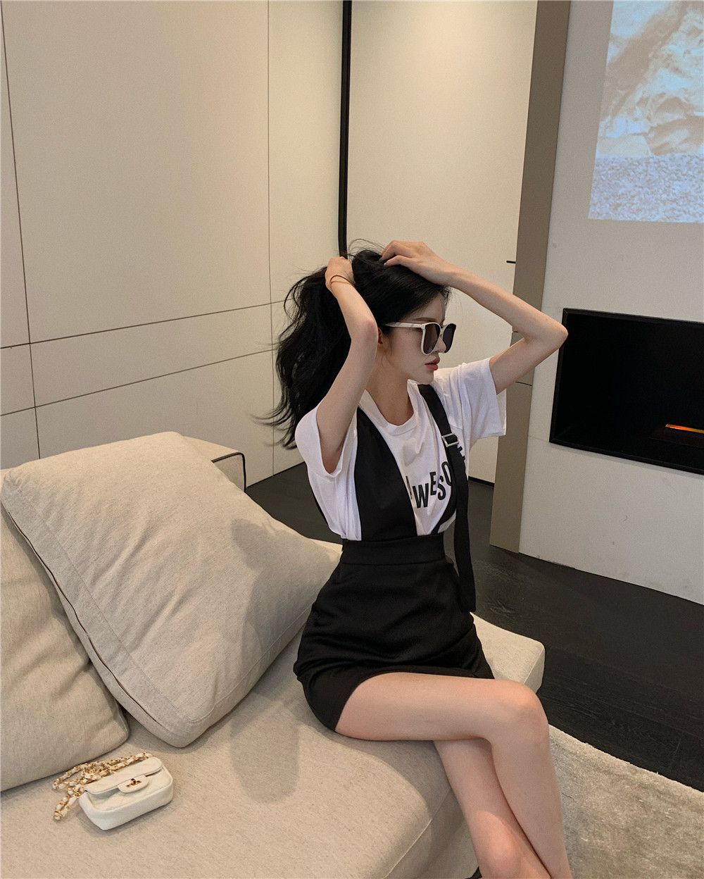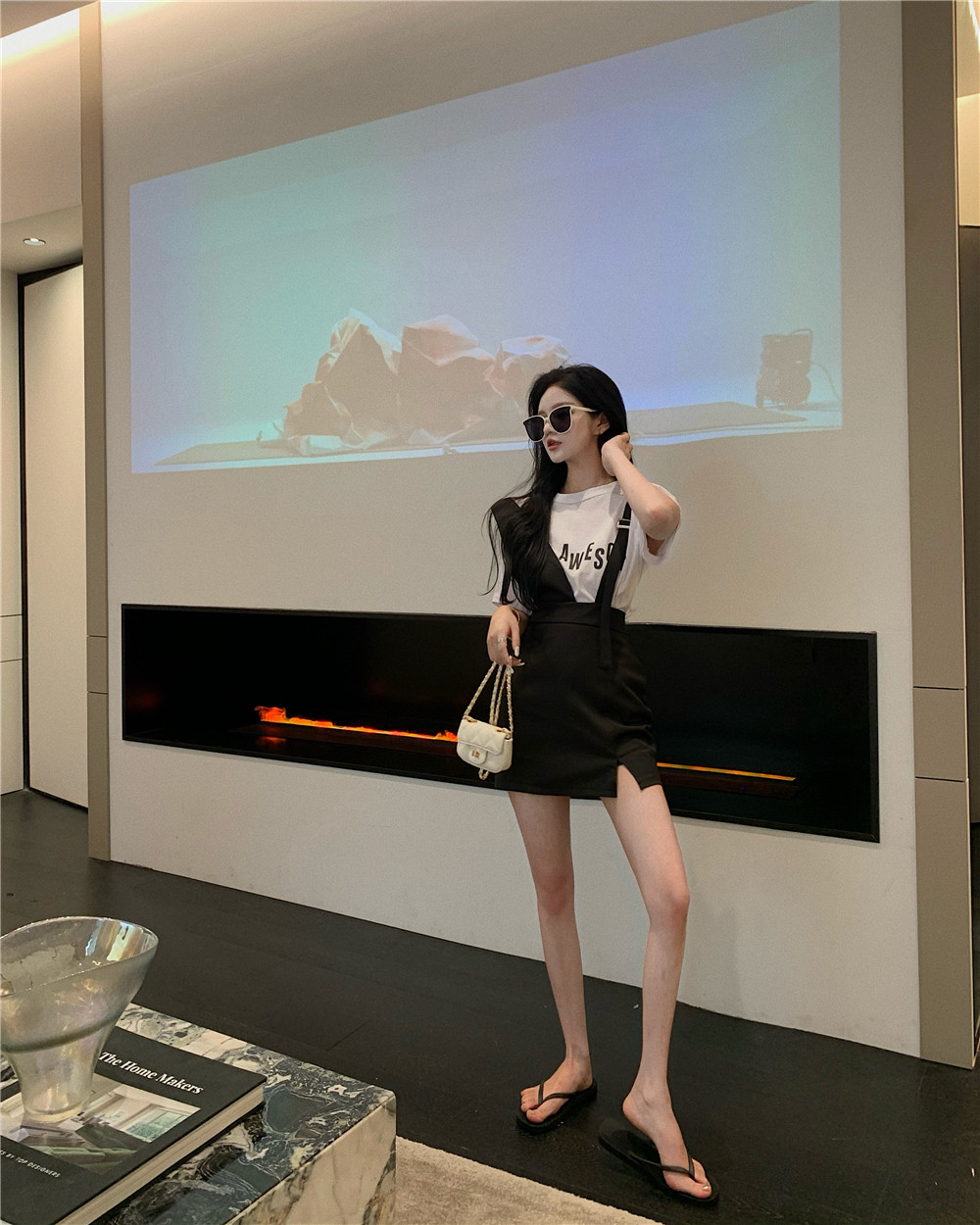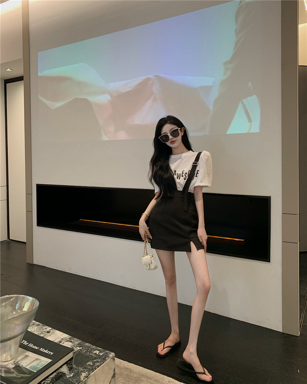 实拍 实价 泡泡袖字母印花T恤+开叉高腰背带裙