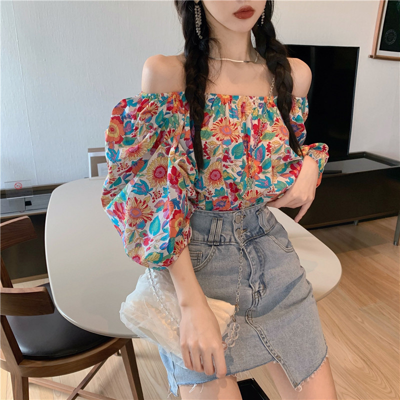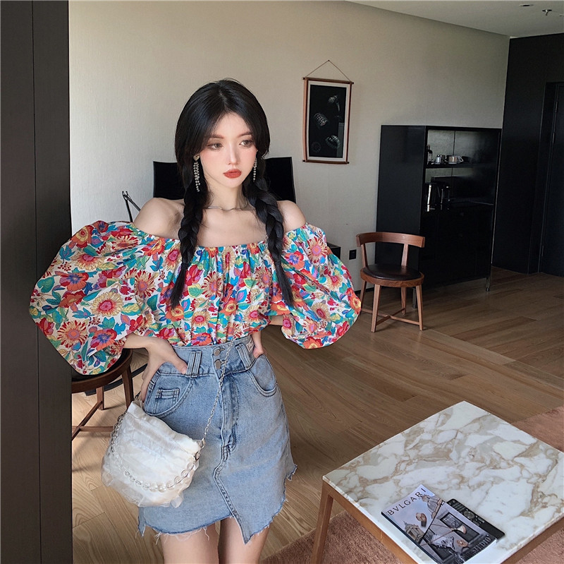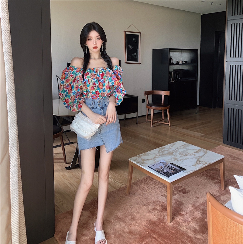 实价实拍一字肩碎花泡泡袖衬衫高腰不规则开叉包臀牛仔裙