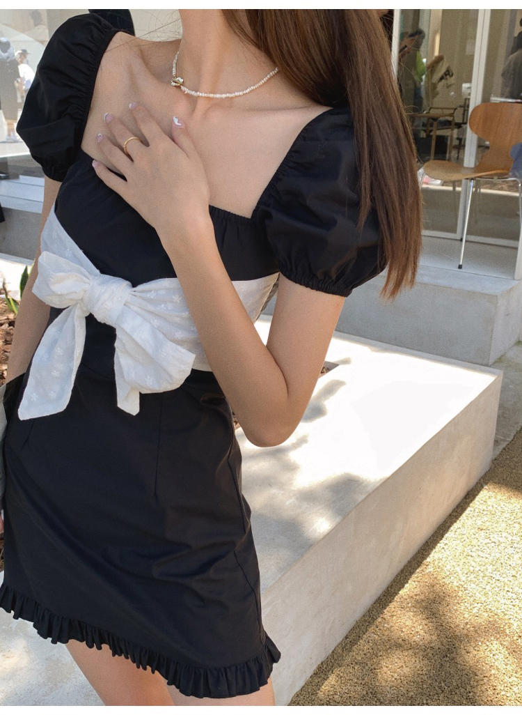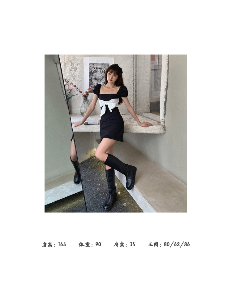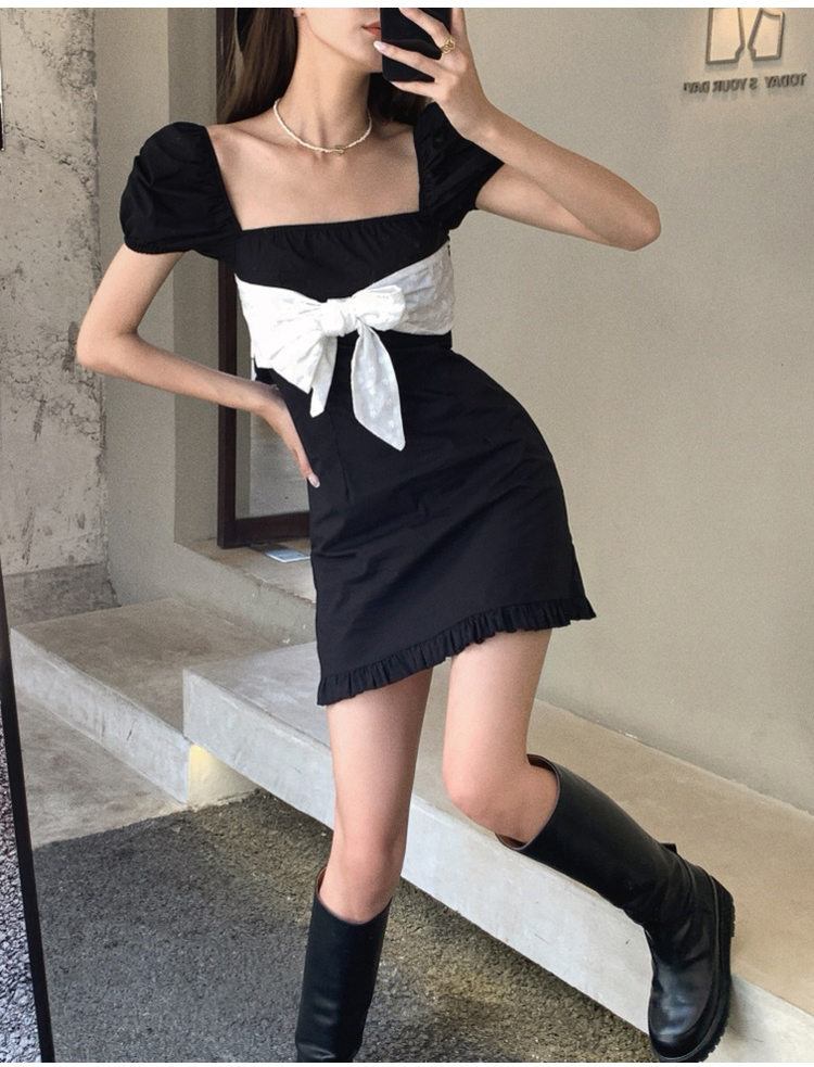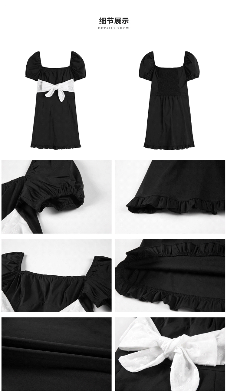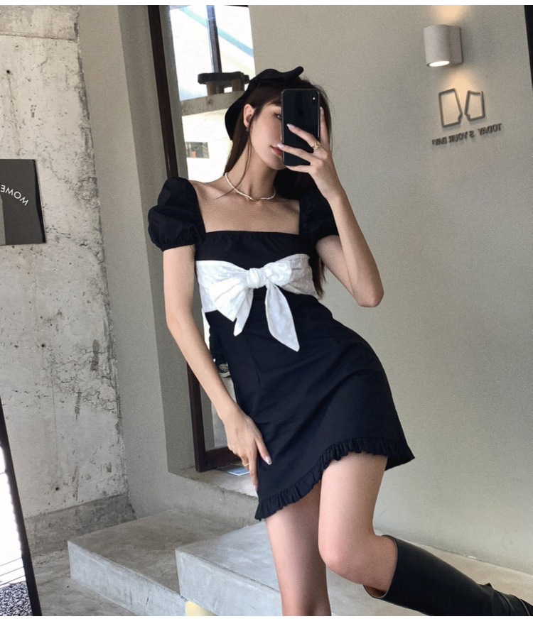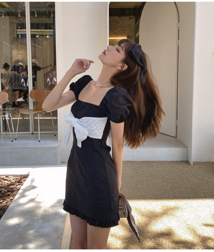 实拍 赫本风蝴蝶结连衣裙女设计感短款方领泡泡袖气质小黑裙子夏