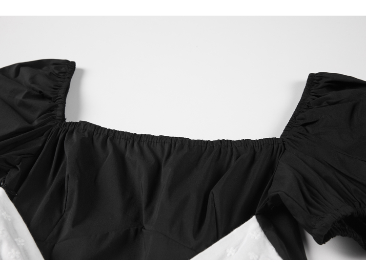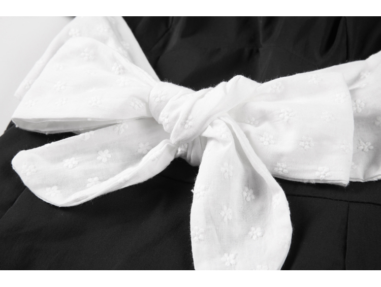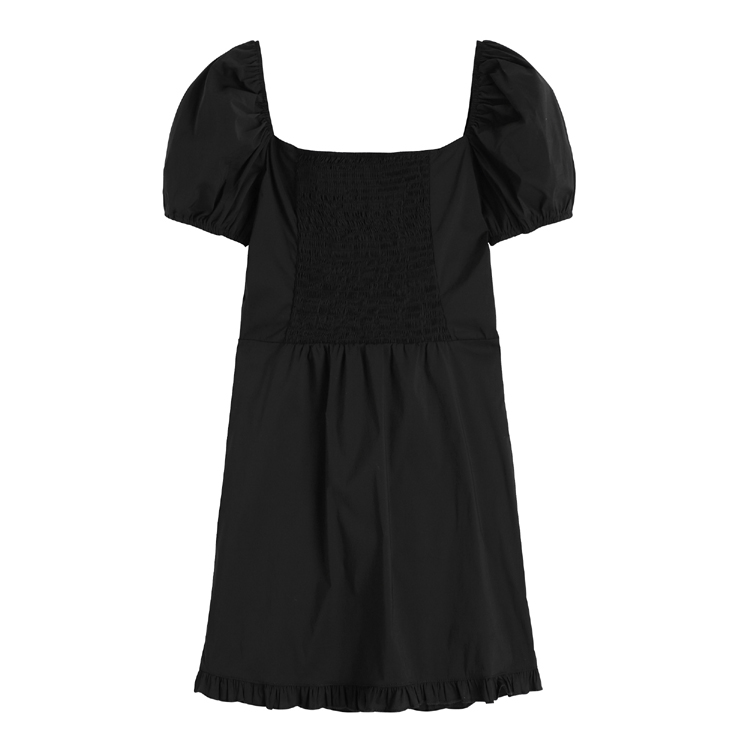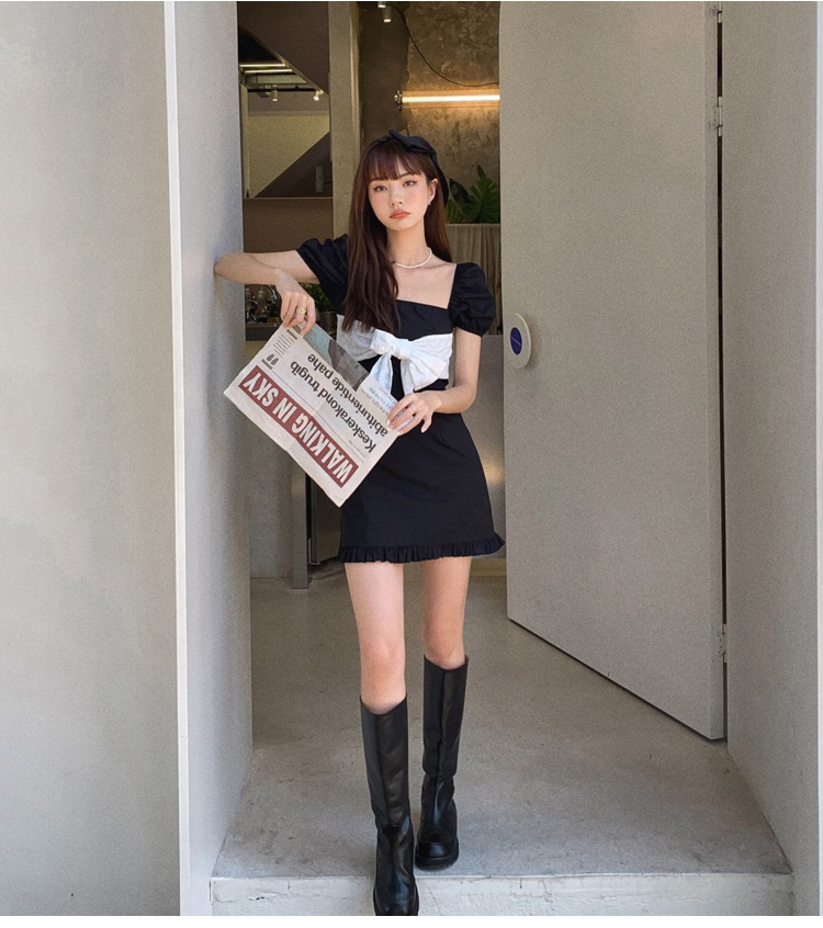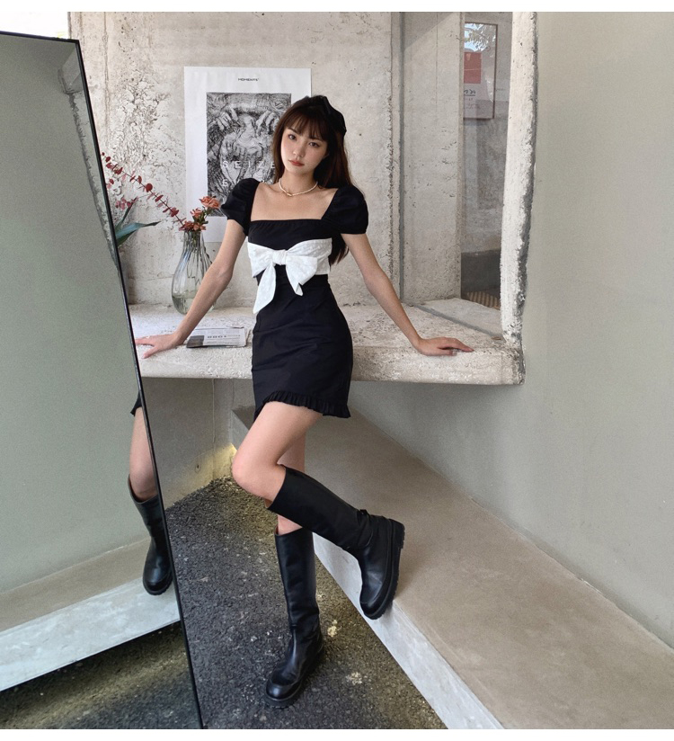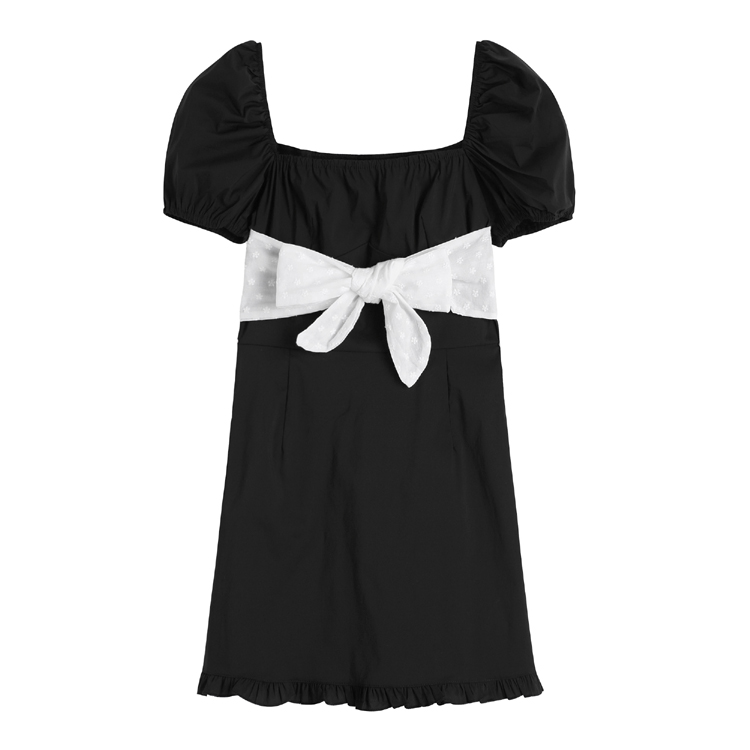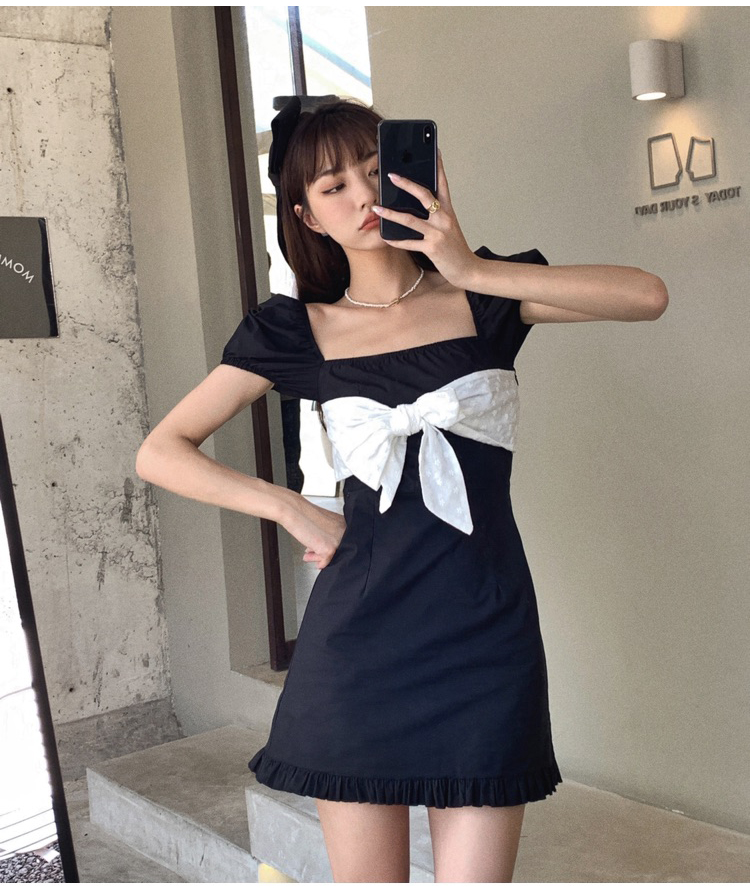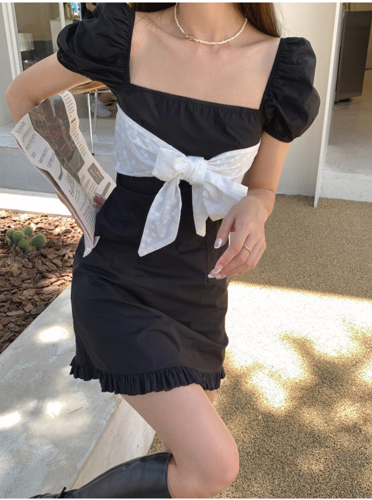 实拍 赫本风蝴蝶结连衣裙女设计感短款方领泡泡袖气质小黑裙子夏