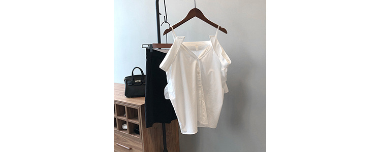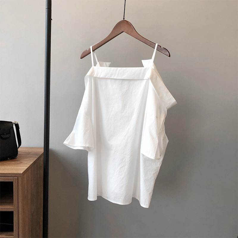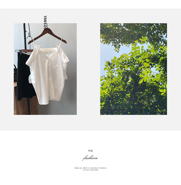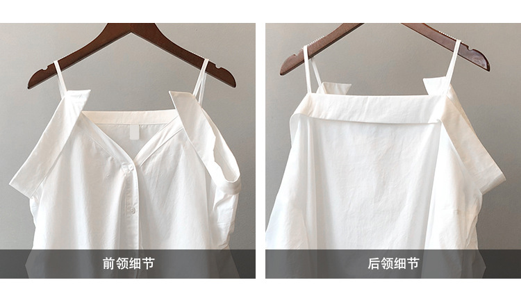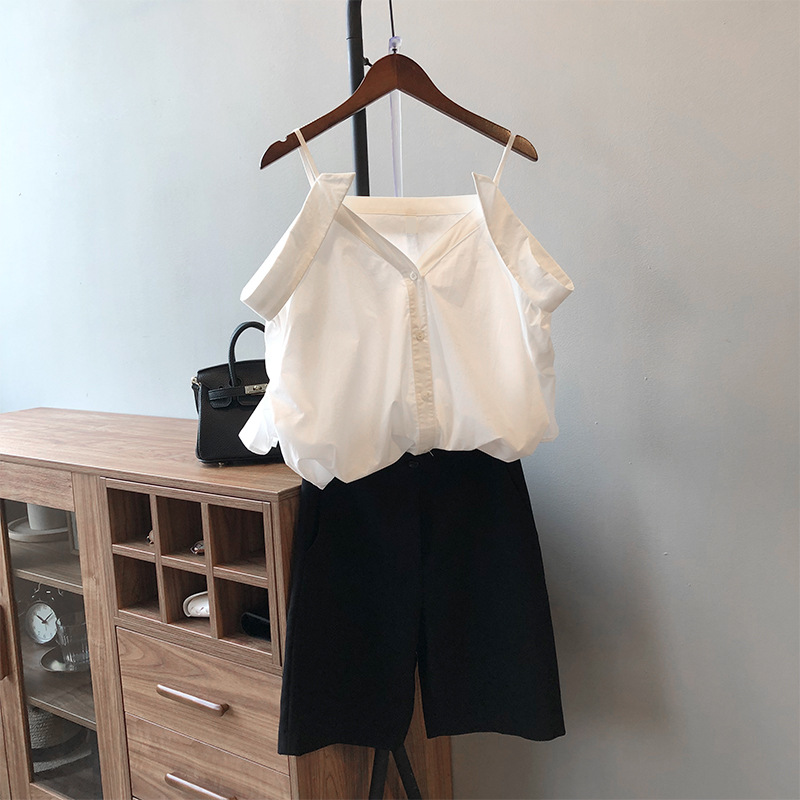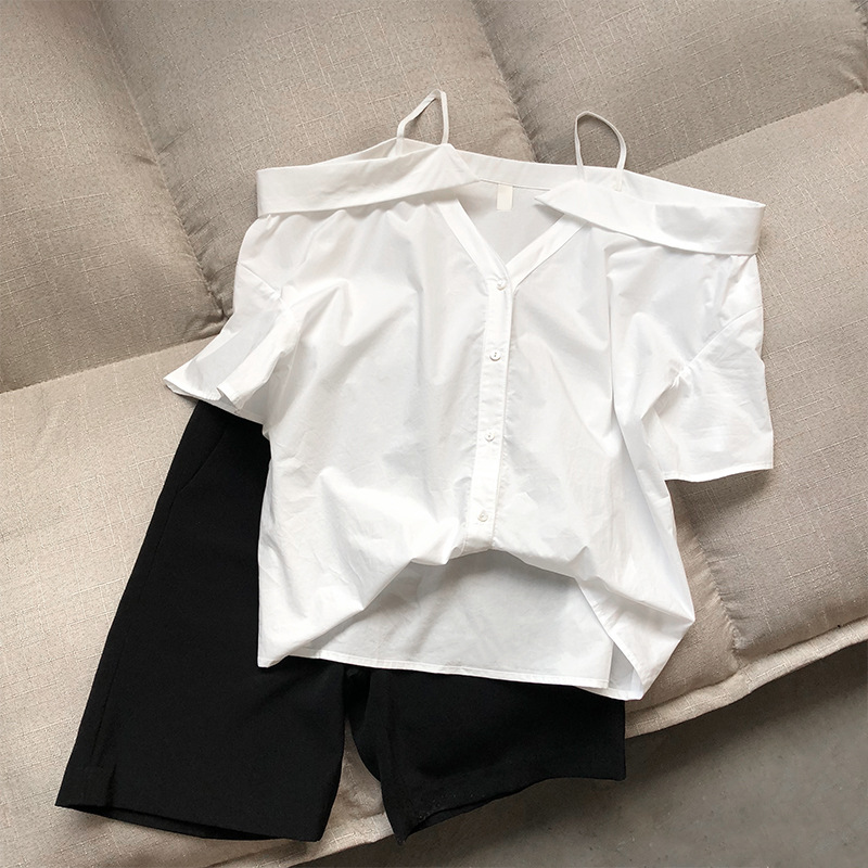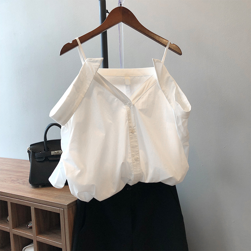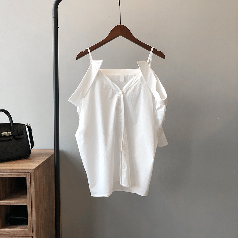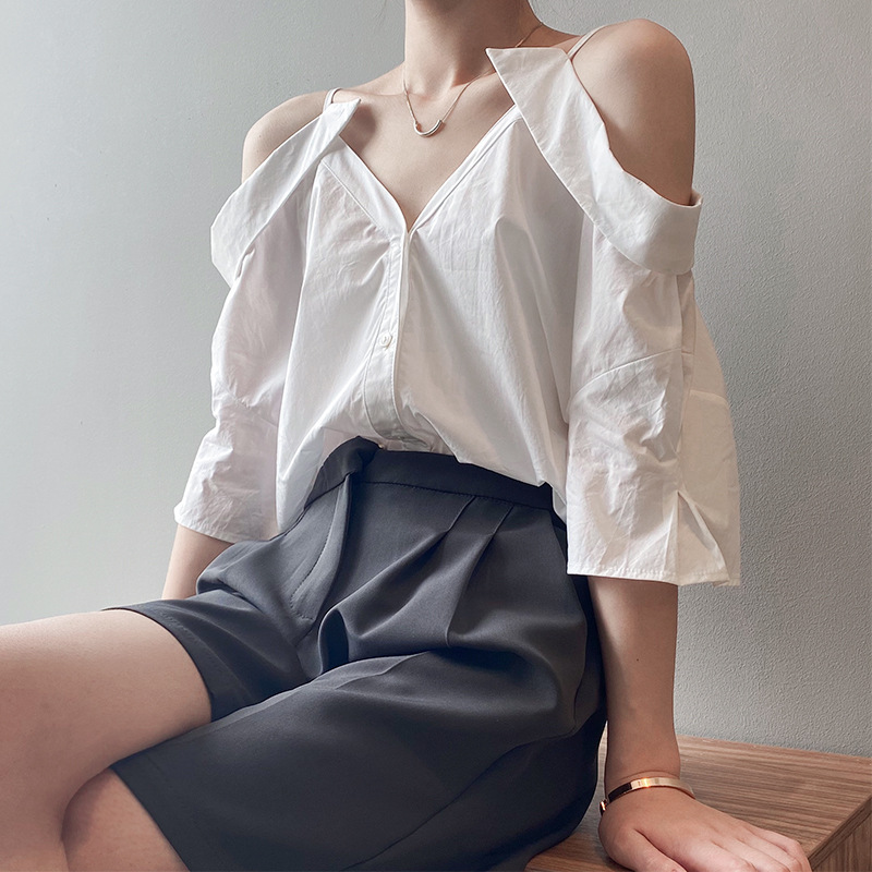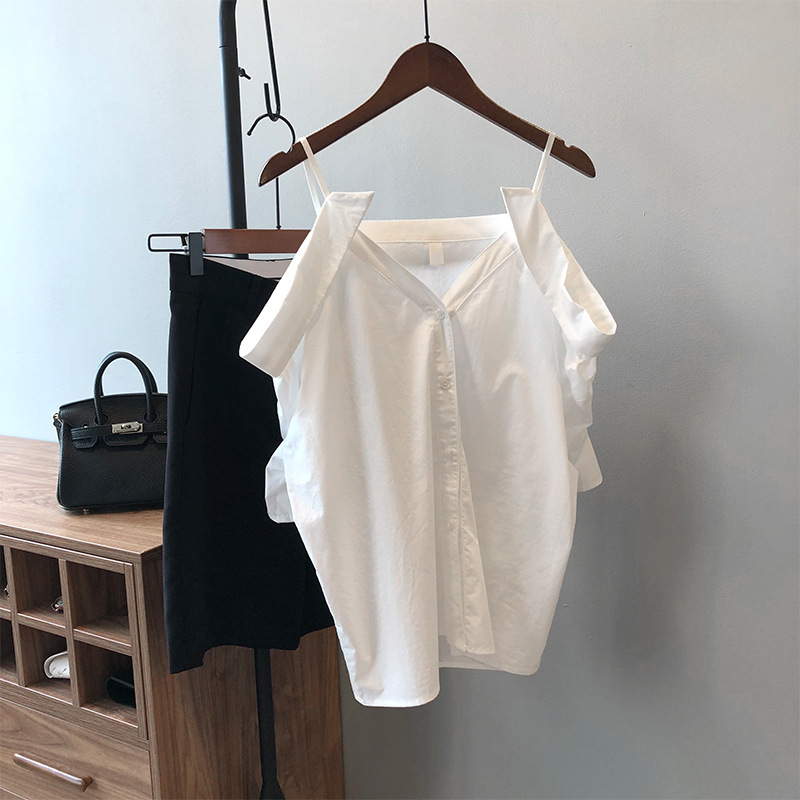 实拍~ 2021夏季新款一字肩吊带衬衫女设计感法式露肩心机上衣女