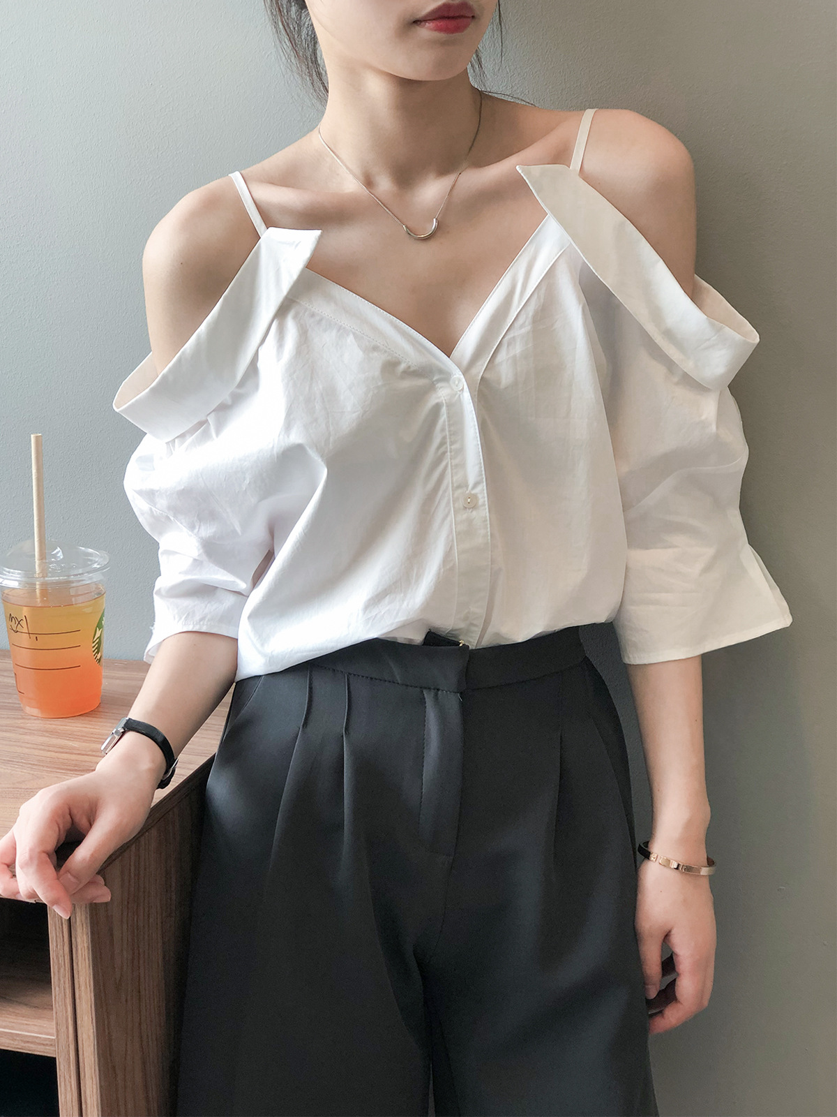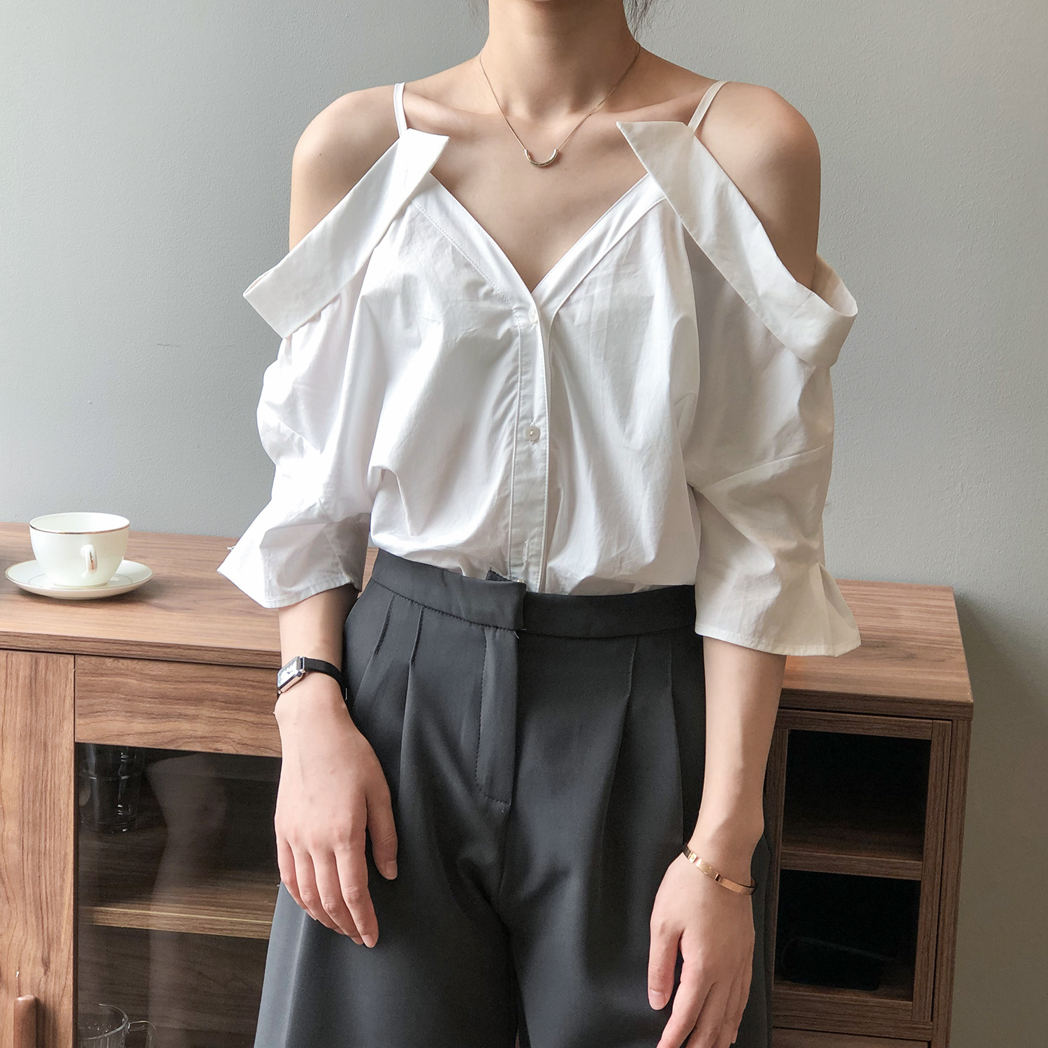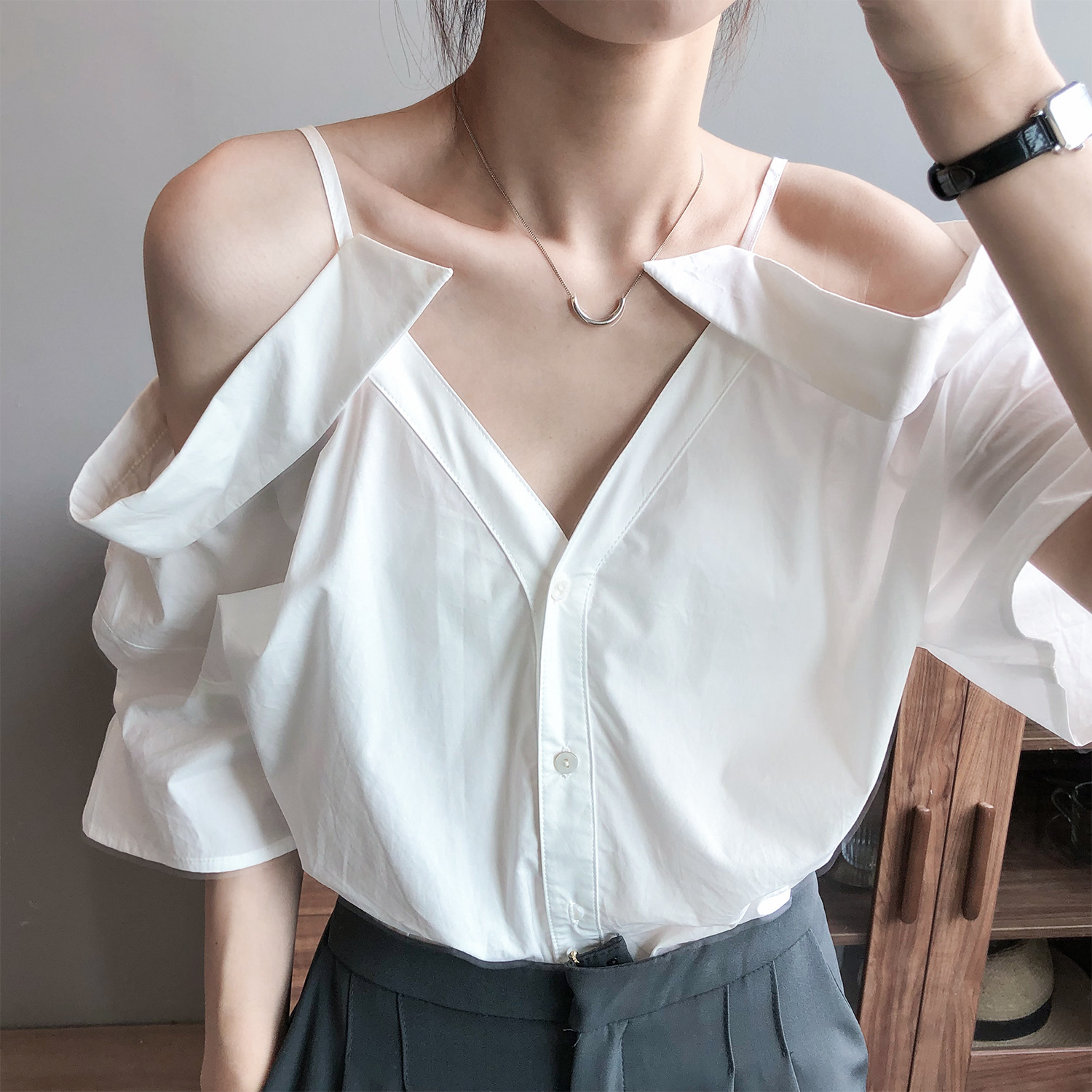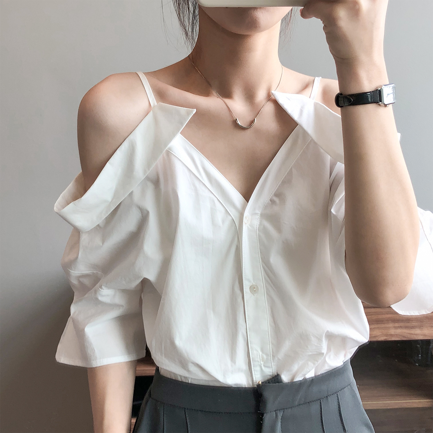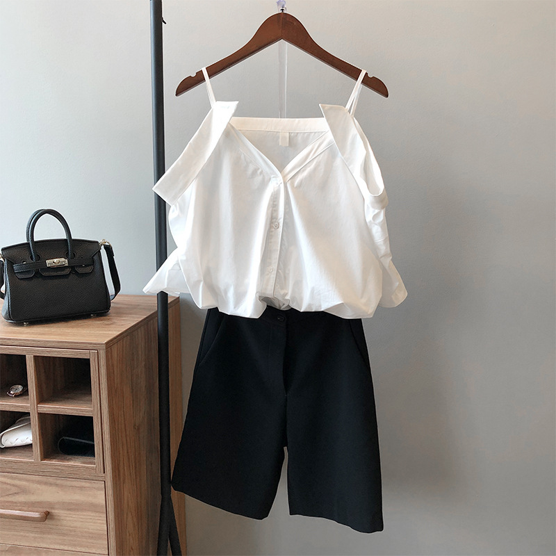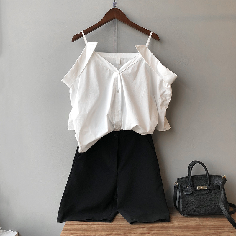 实拍~ 2021夏季新款一字肩吊带衬衫女设计感法式露肩心机上衣女
