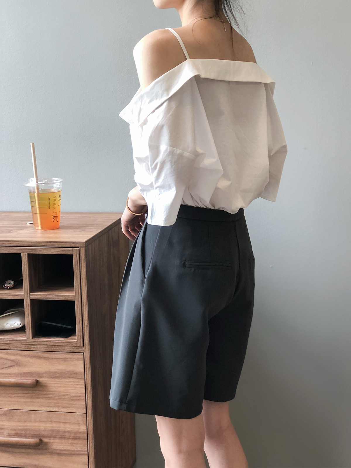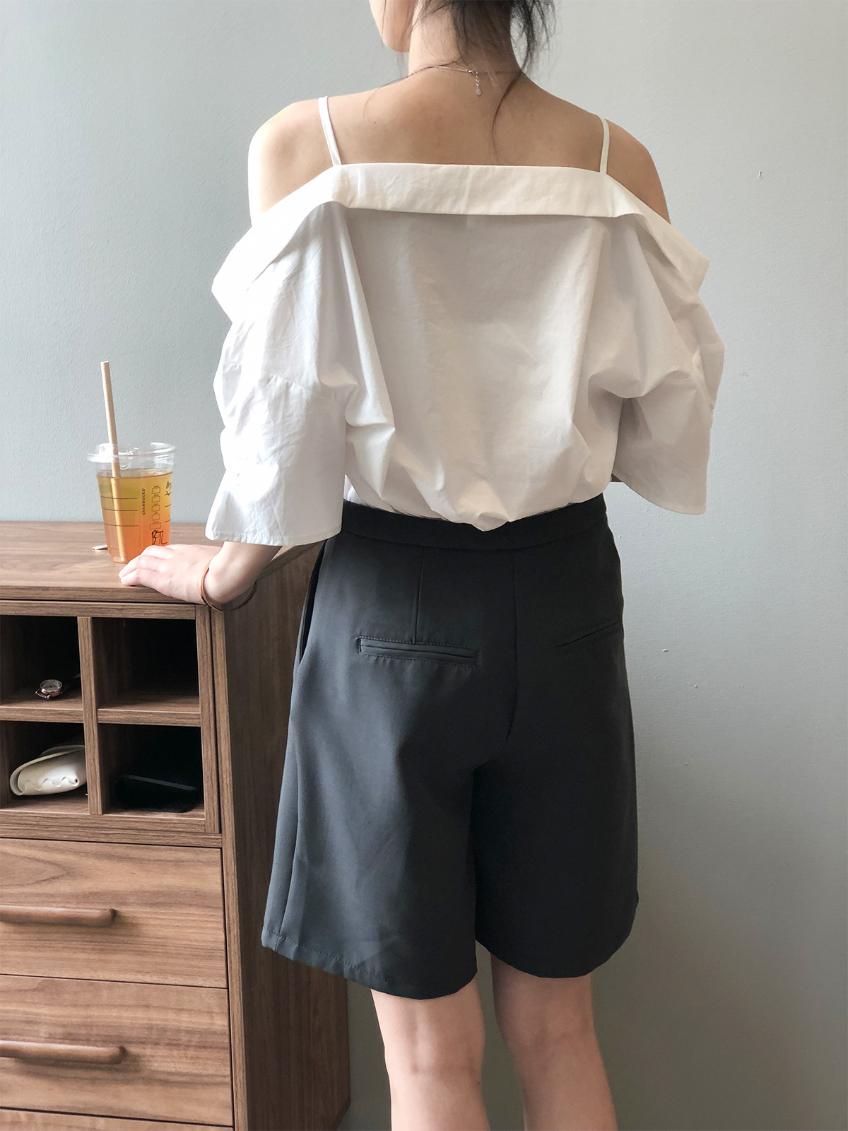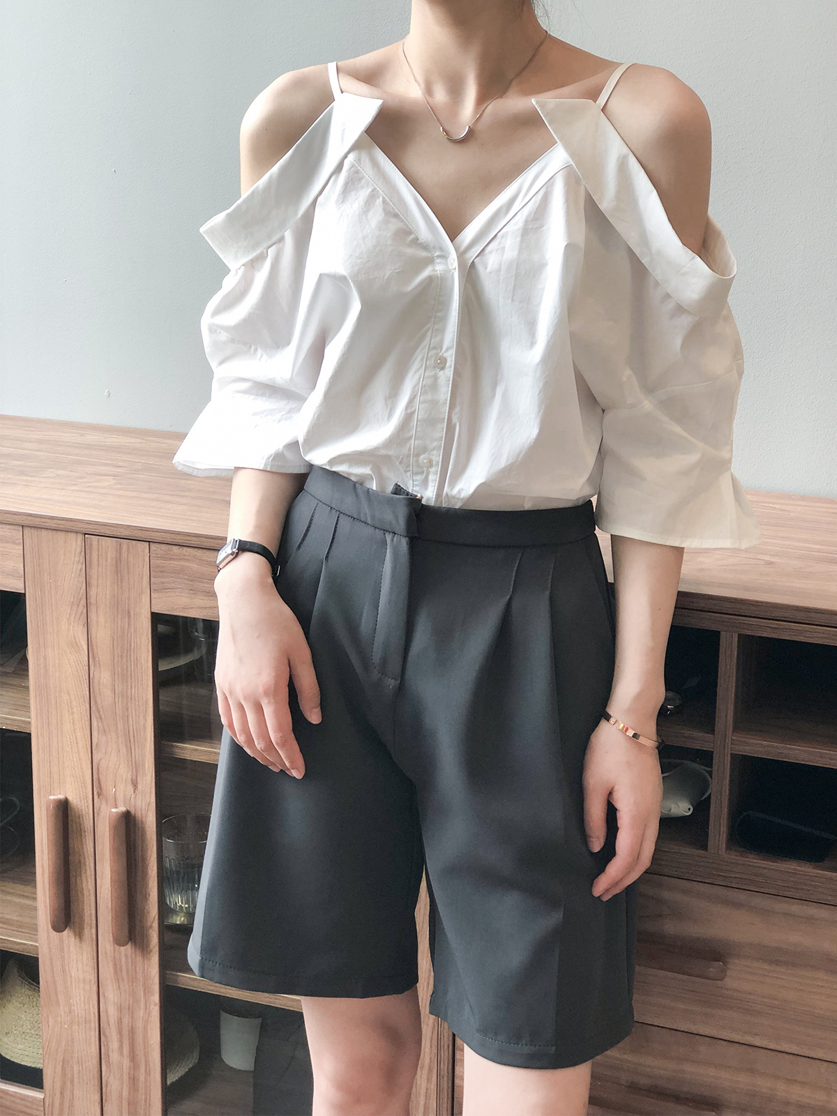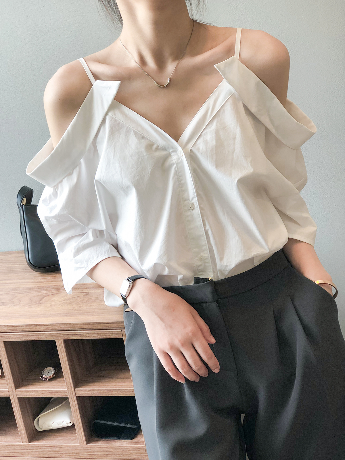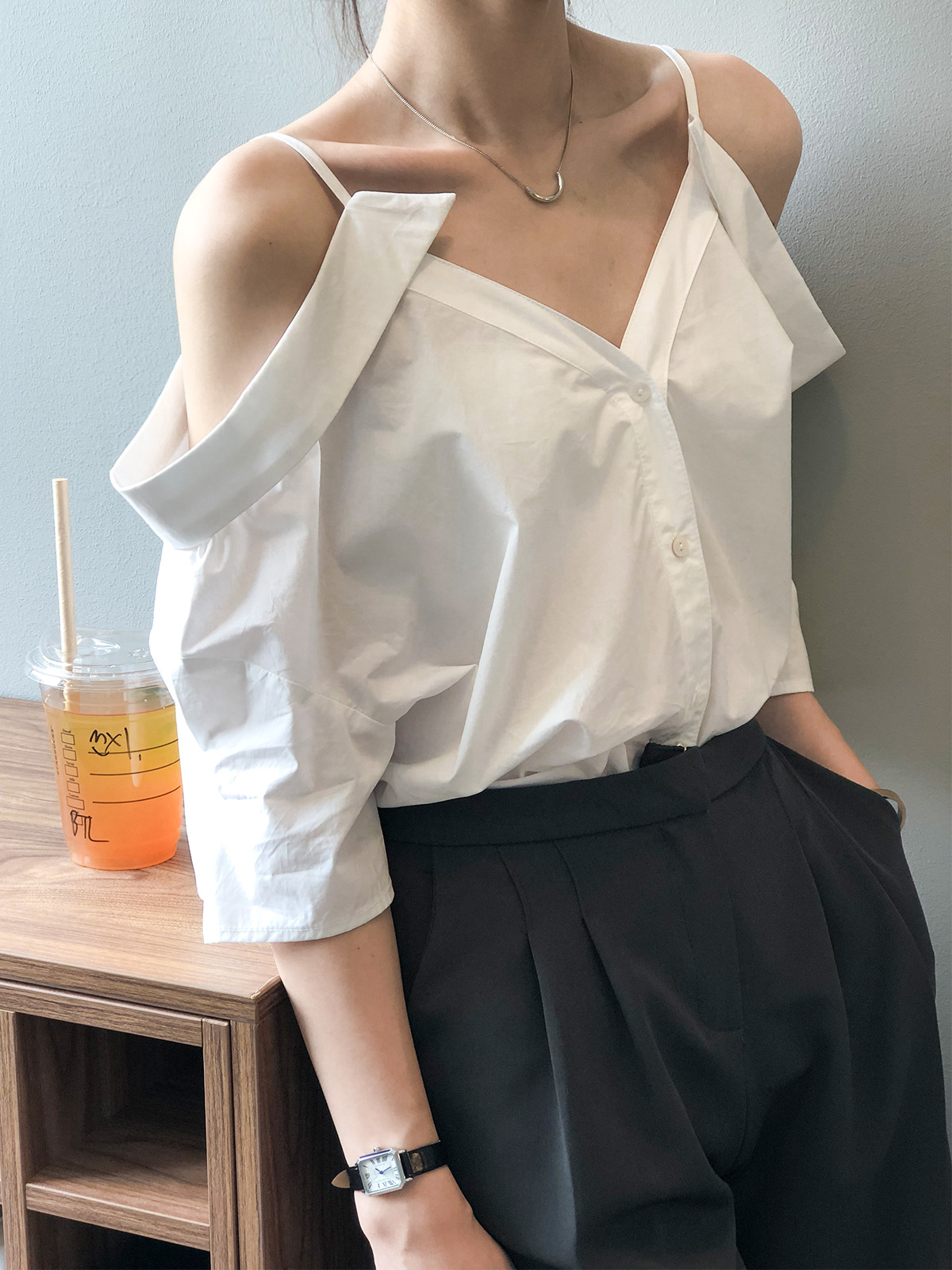 实拍~ 2021夏季新款一字肩吊带衬衫女设计感法式露肩心机上衣女