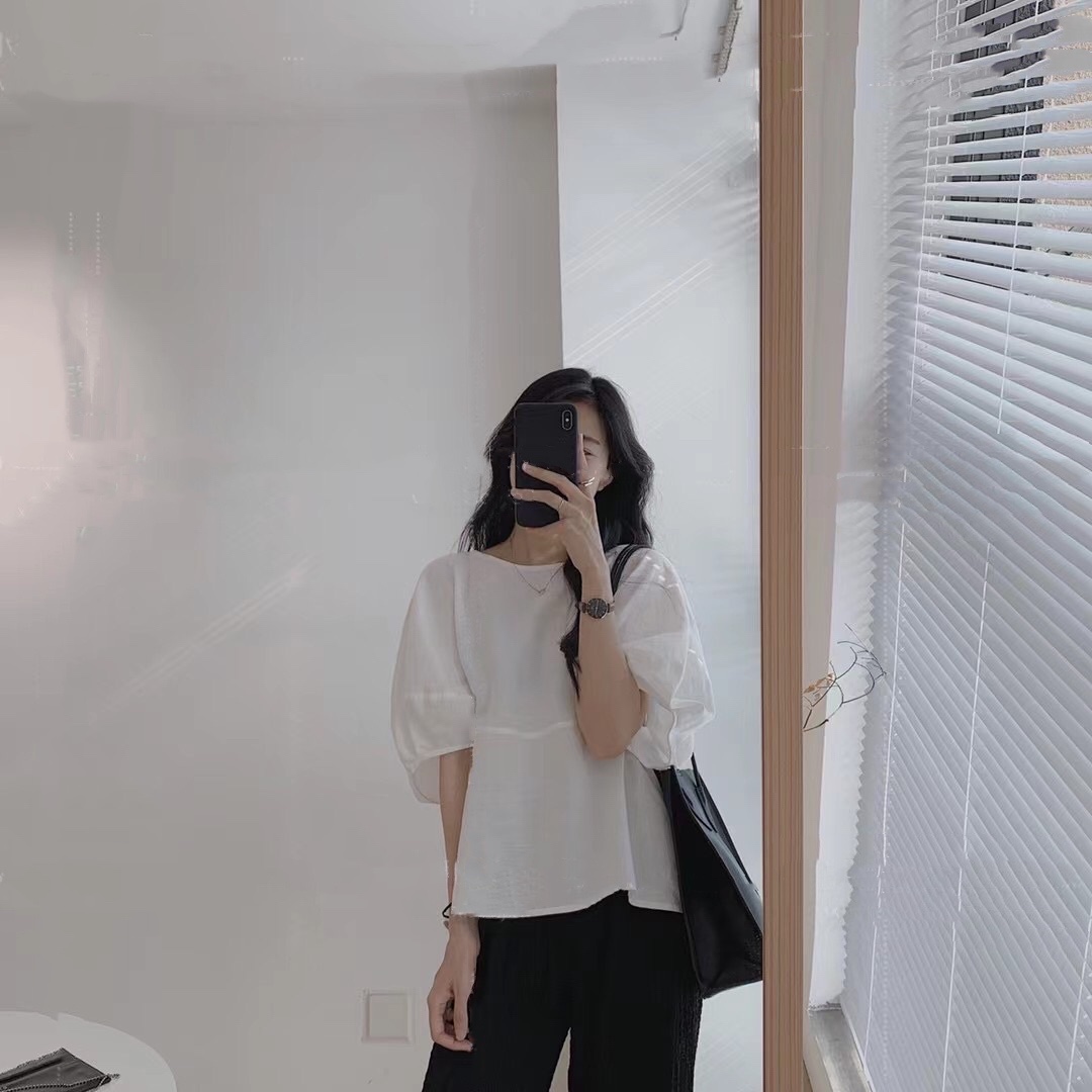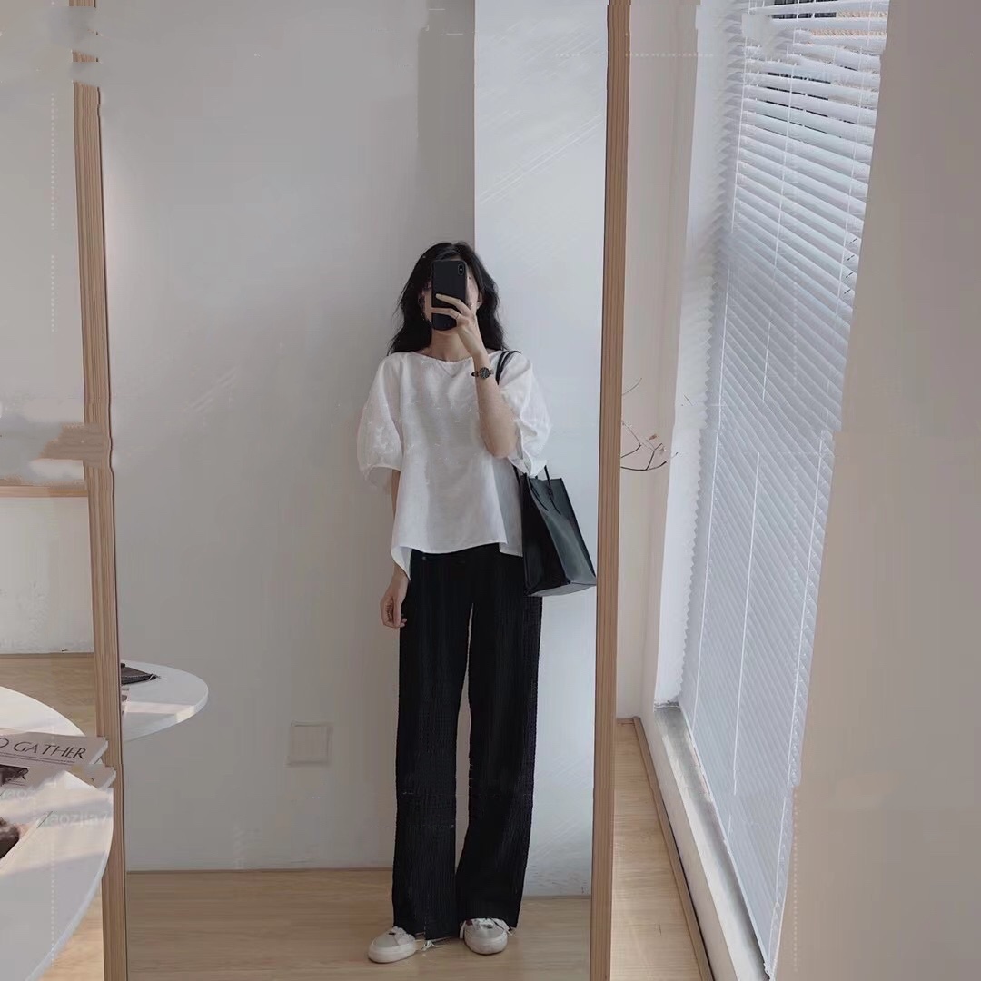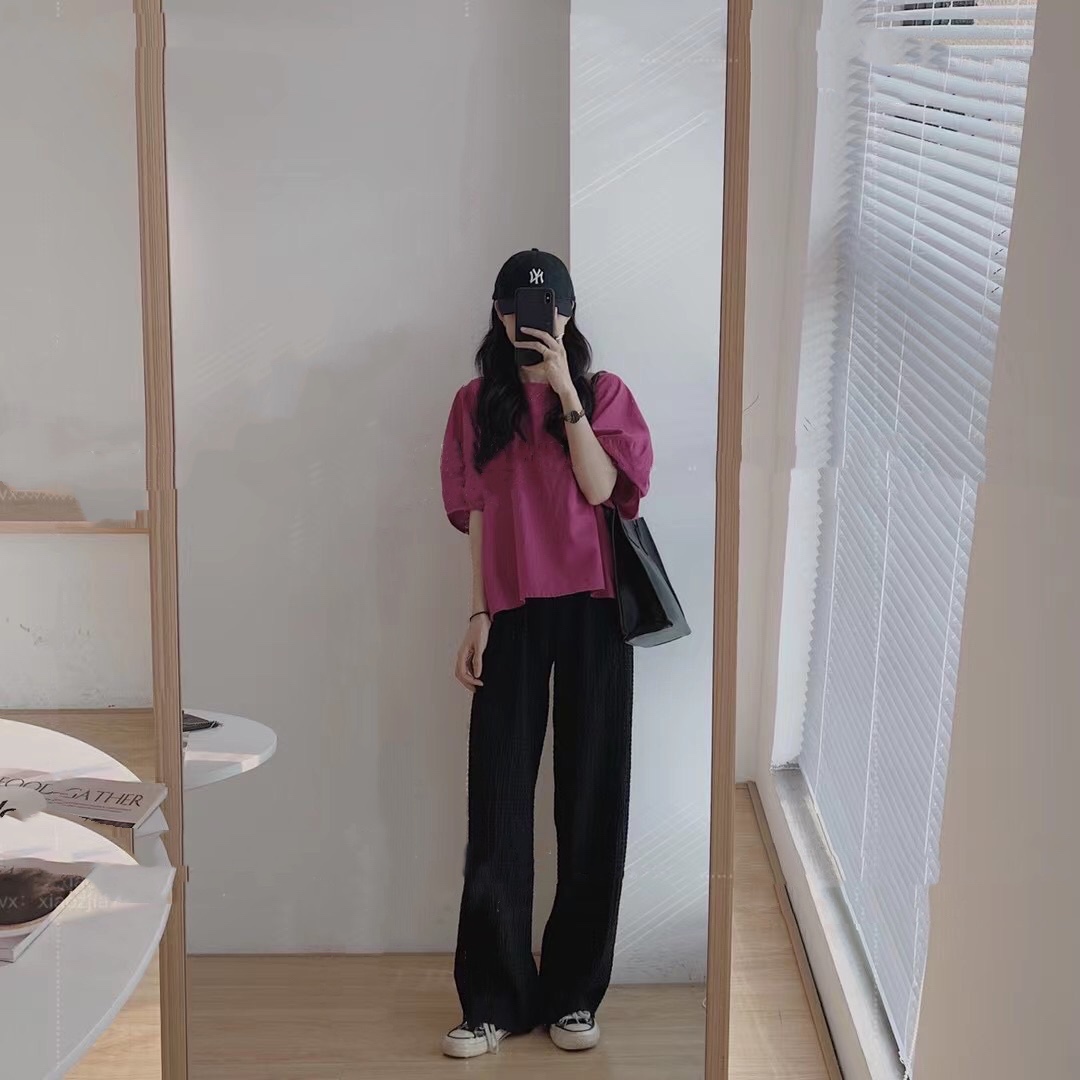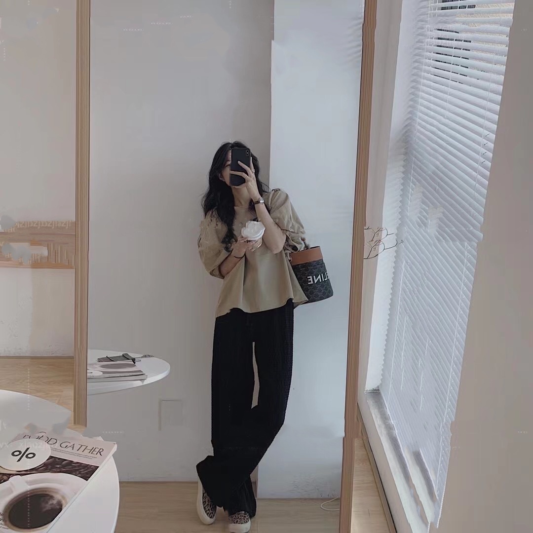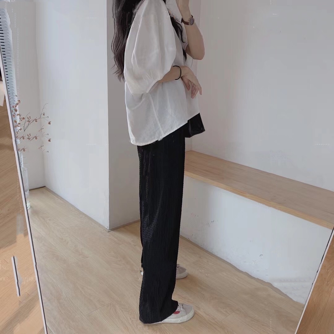 2021夏季新款韩版chic学院风百搭泡泡蝙蝠袖上衣+阔腿裤两件套