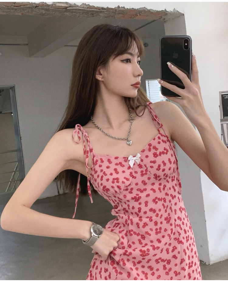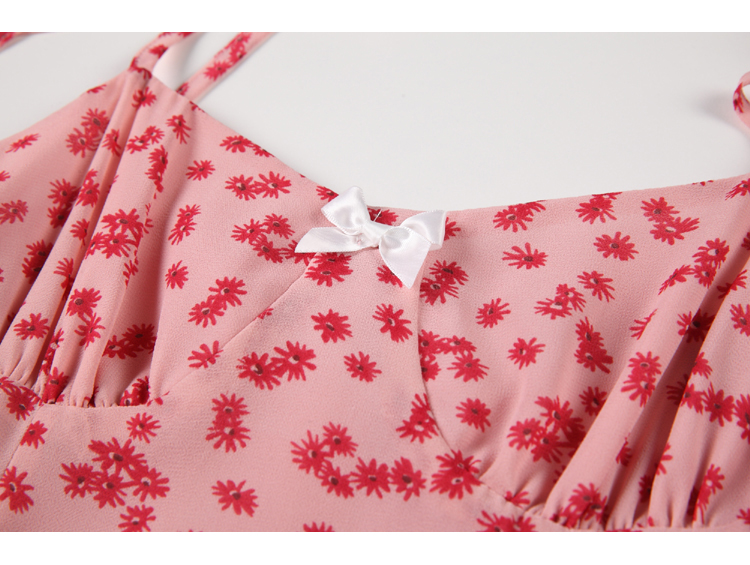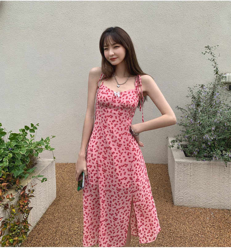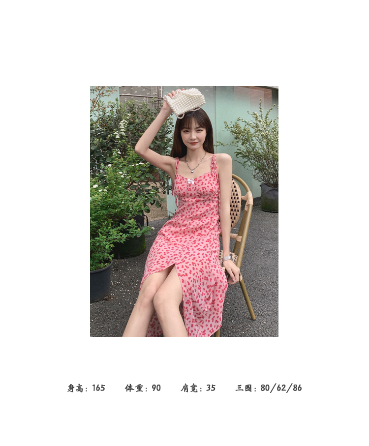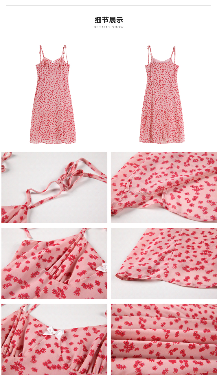 实拍 法式少女浪漫吊带裙碎花裙复古收腰修身显瘦长裙度假连衣裙