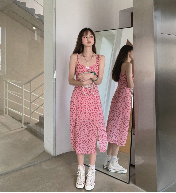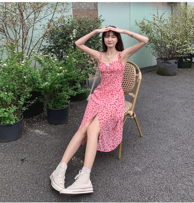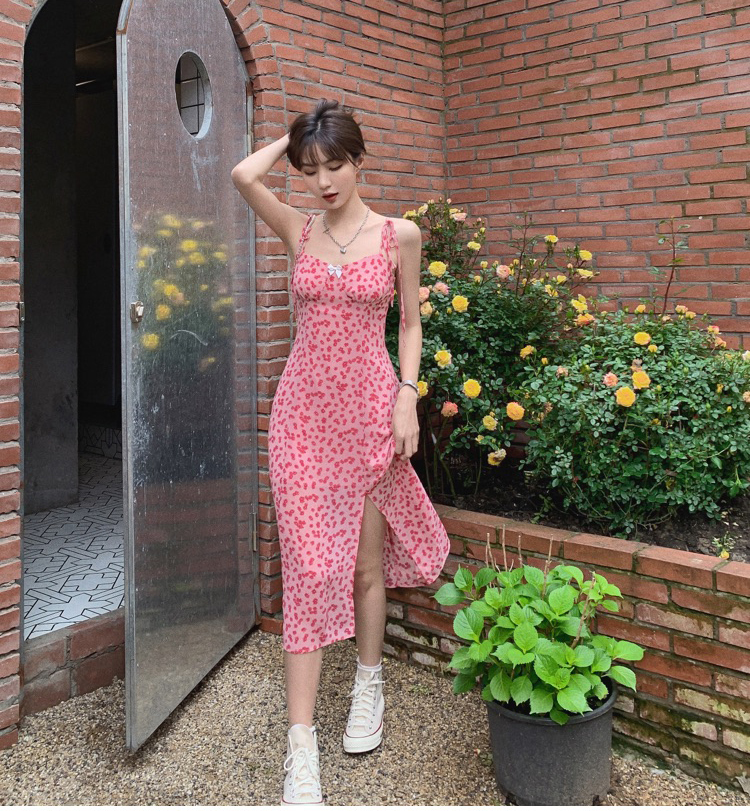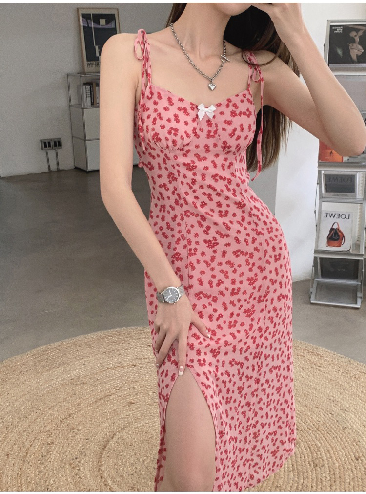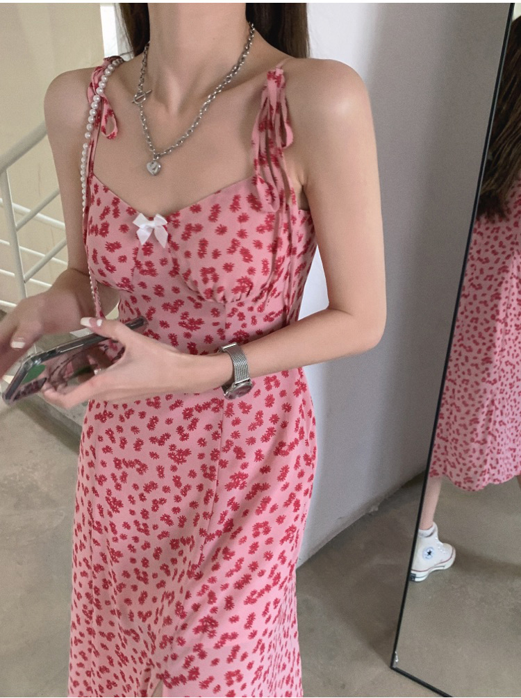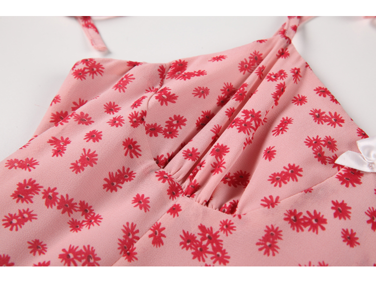 实拍 法式少女浪漫吊带裙碎花裙复古收腰修身显瘦长裙度假连衣裙