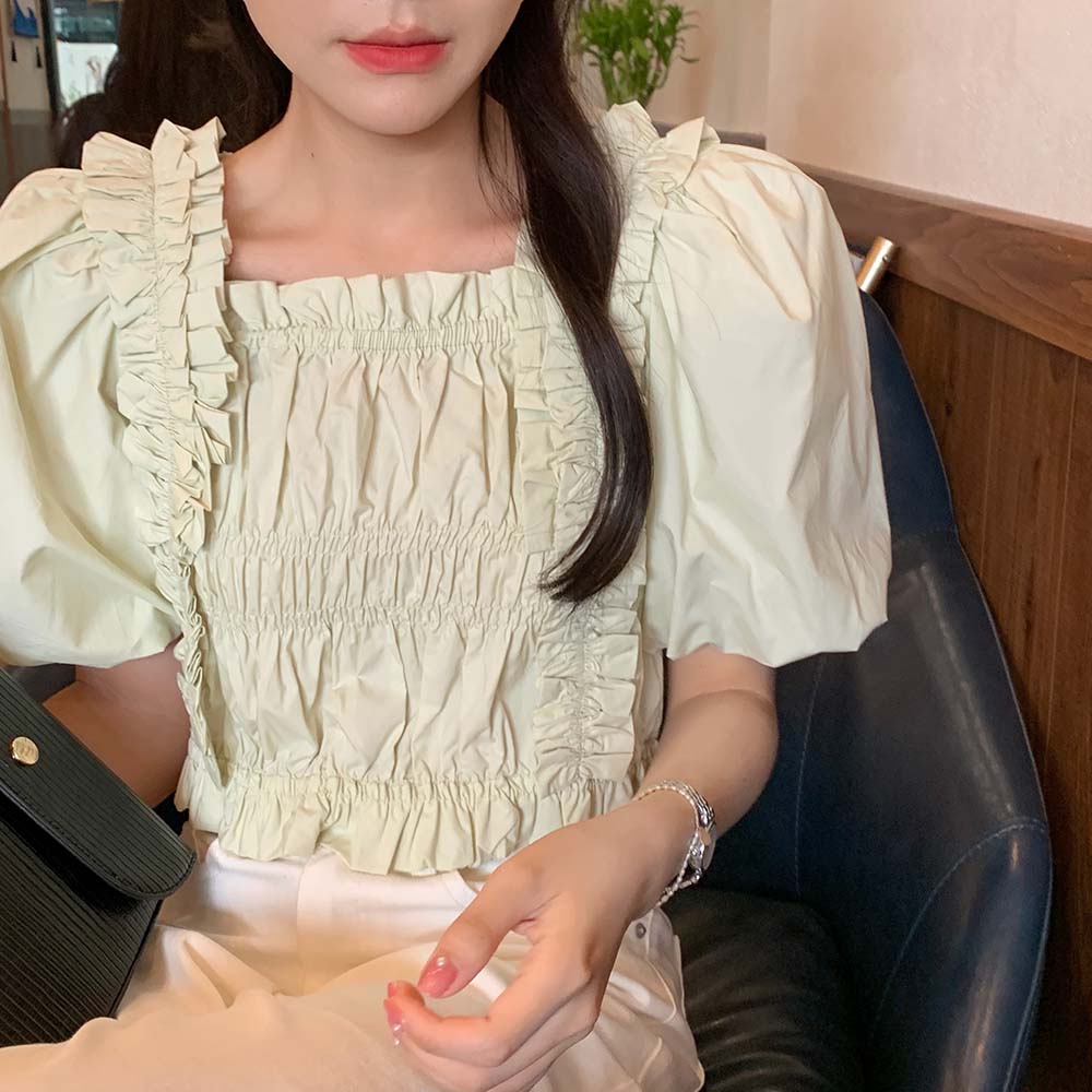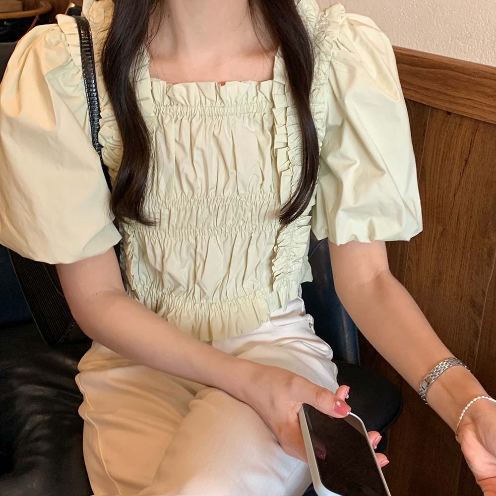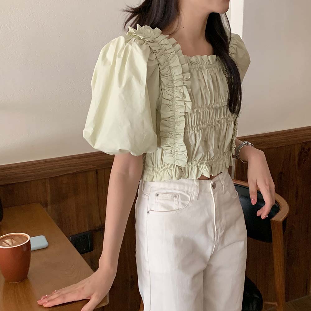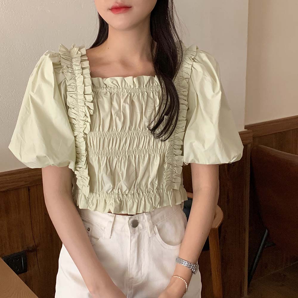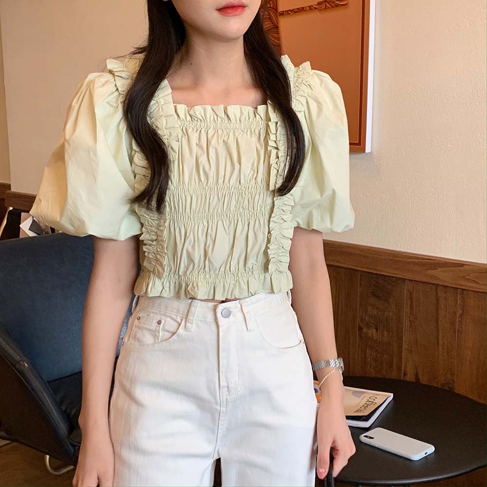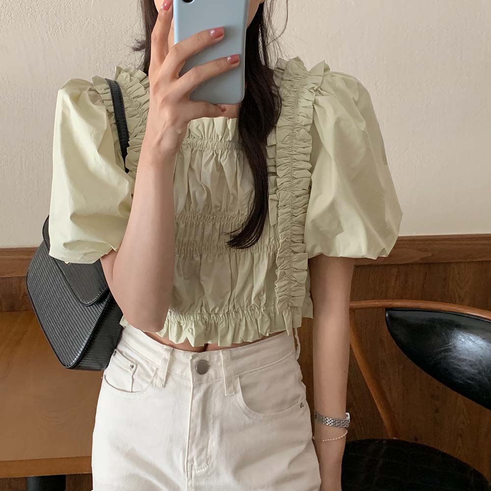实拍 复古小众设计方领泡泡袖短版小件衬衫