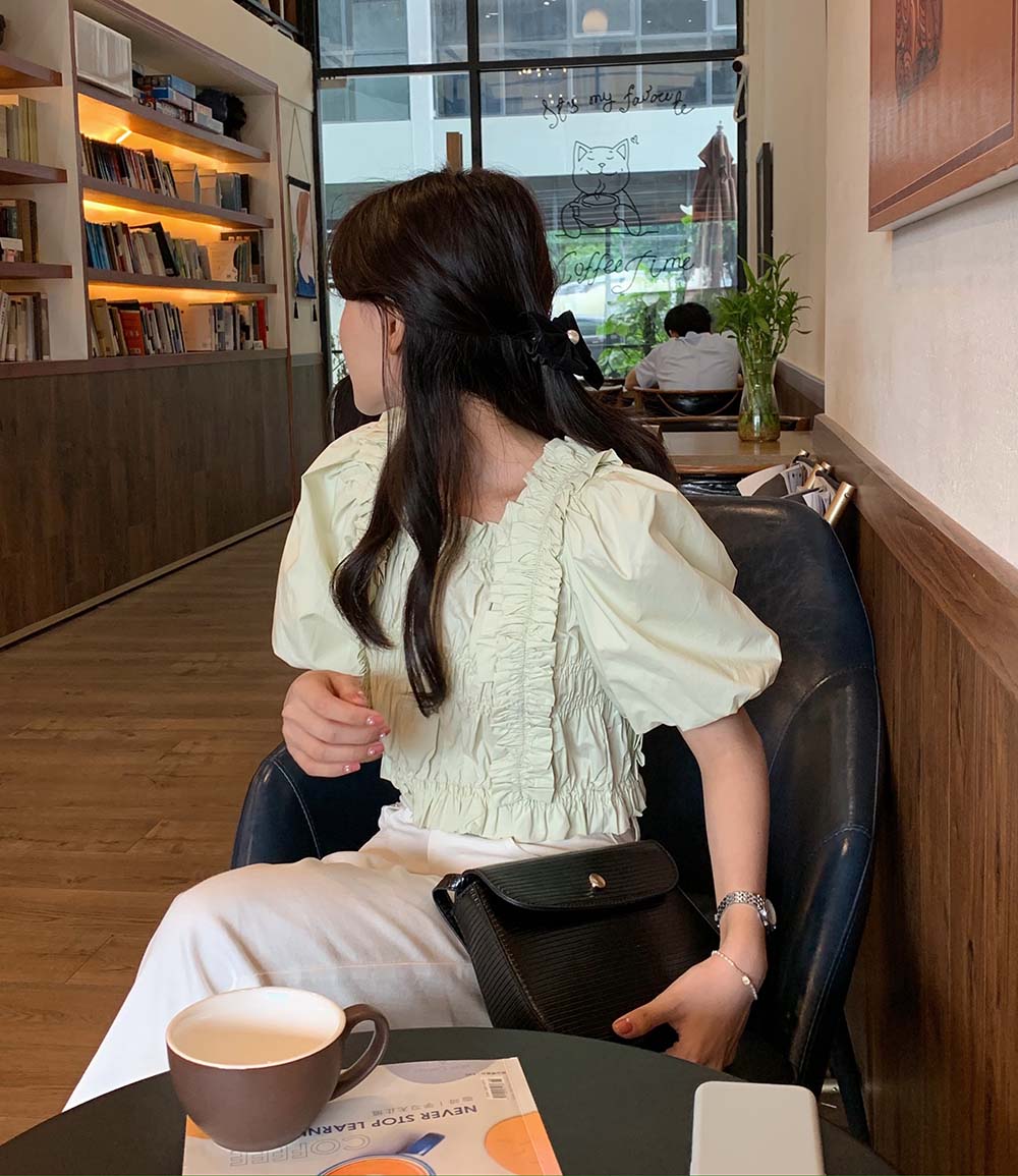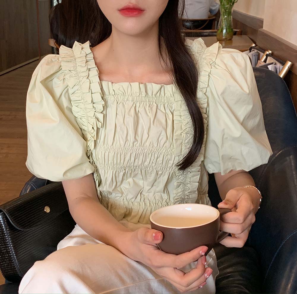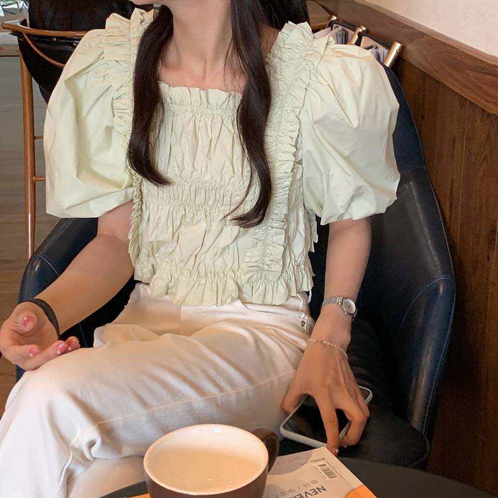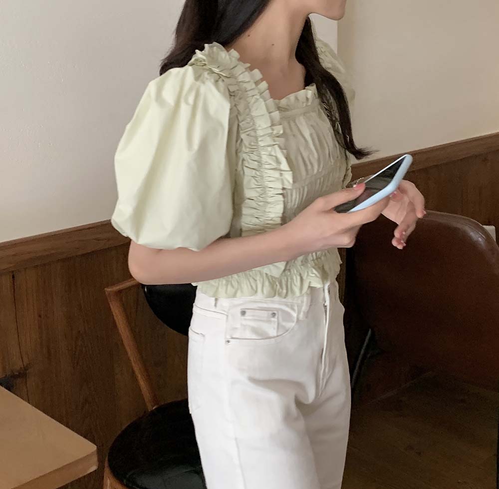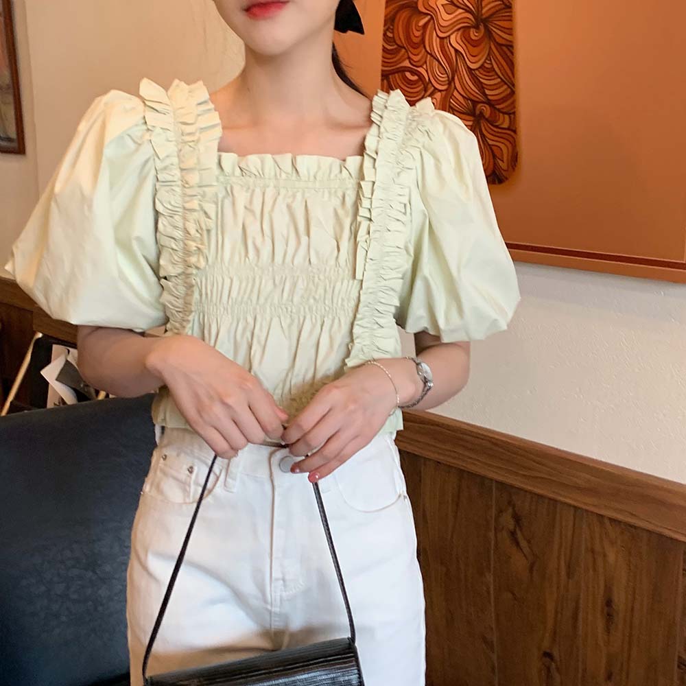 实拍 复古小众设计方领泡泡袖短版小件衬衫