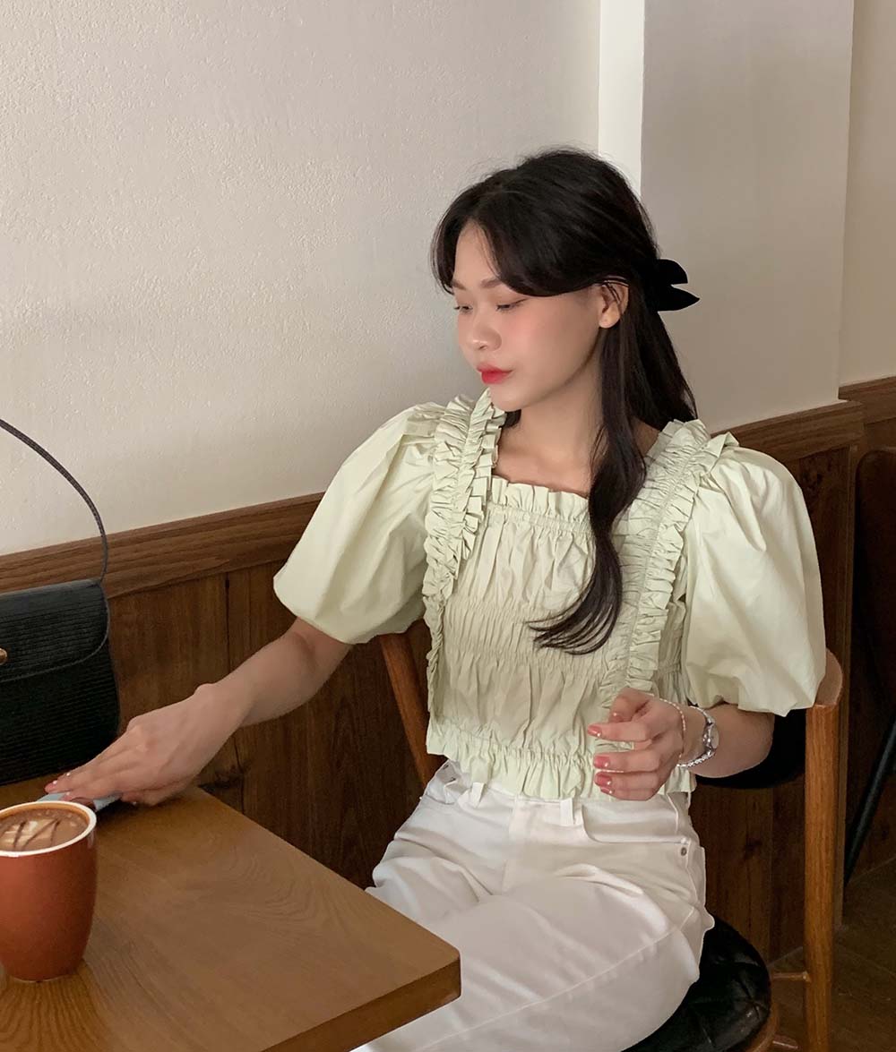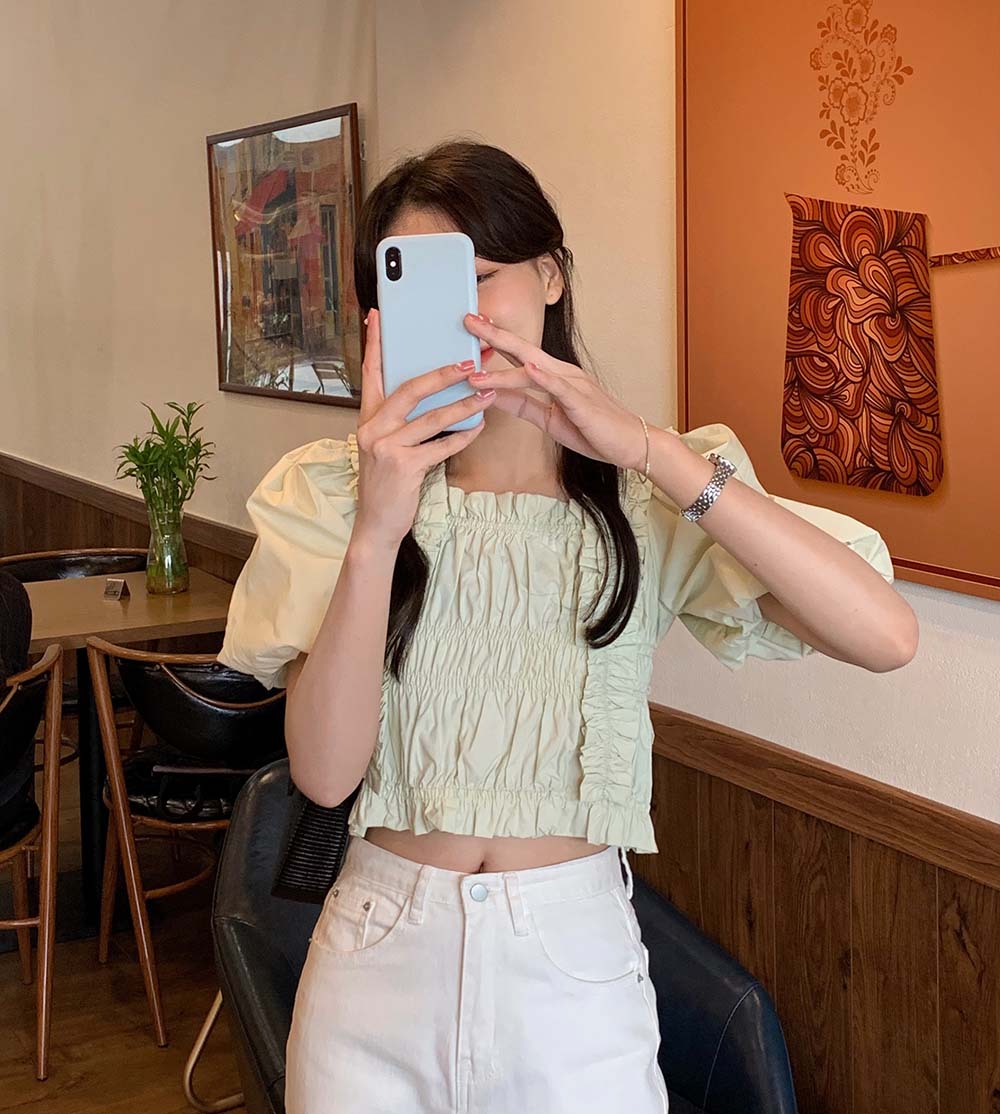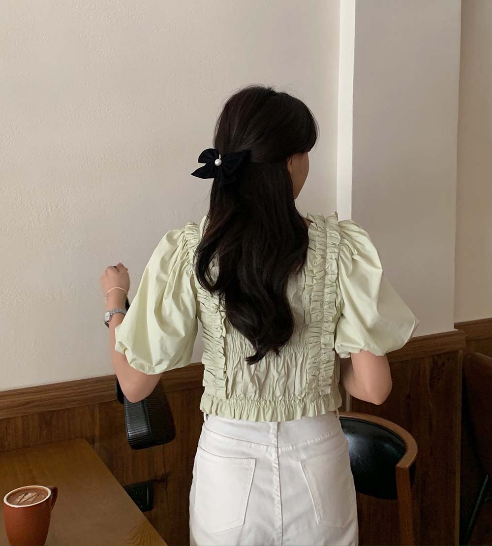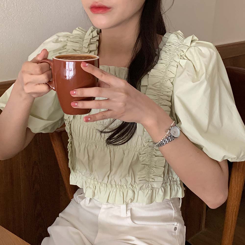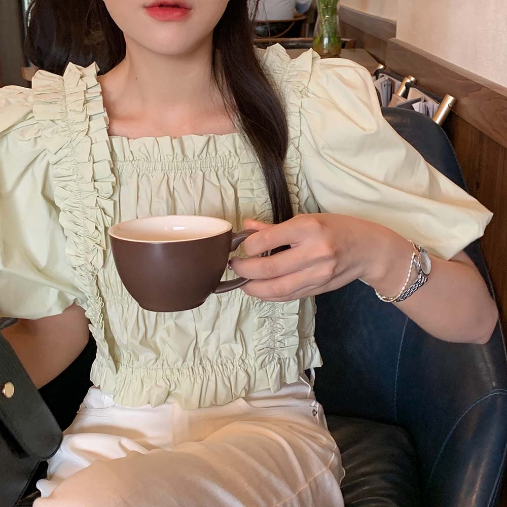 实拍 复古小众设计方领泡泡袖短版小件衬衫