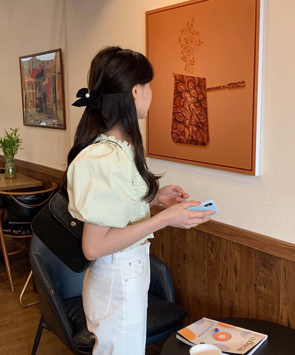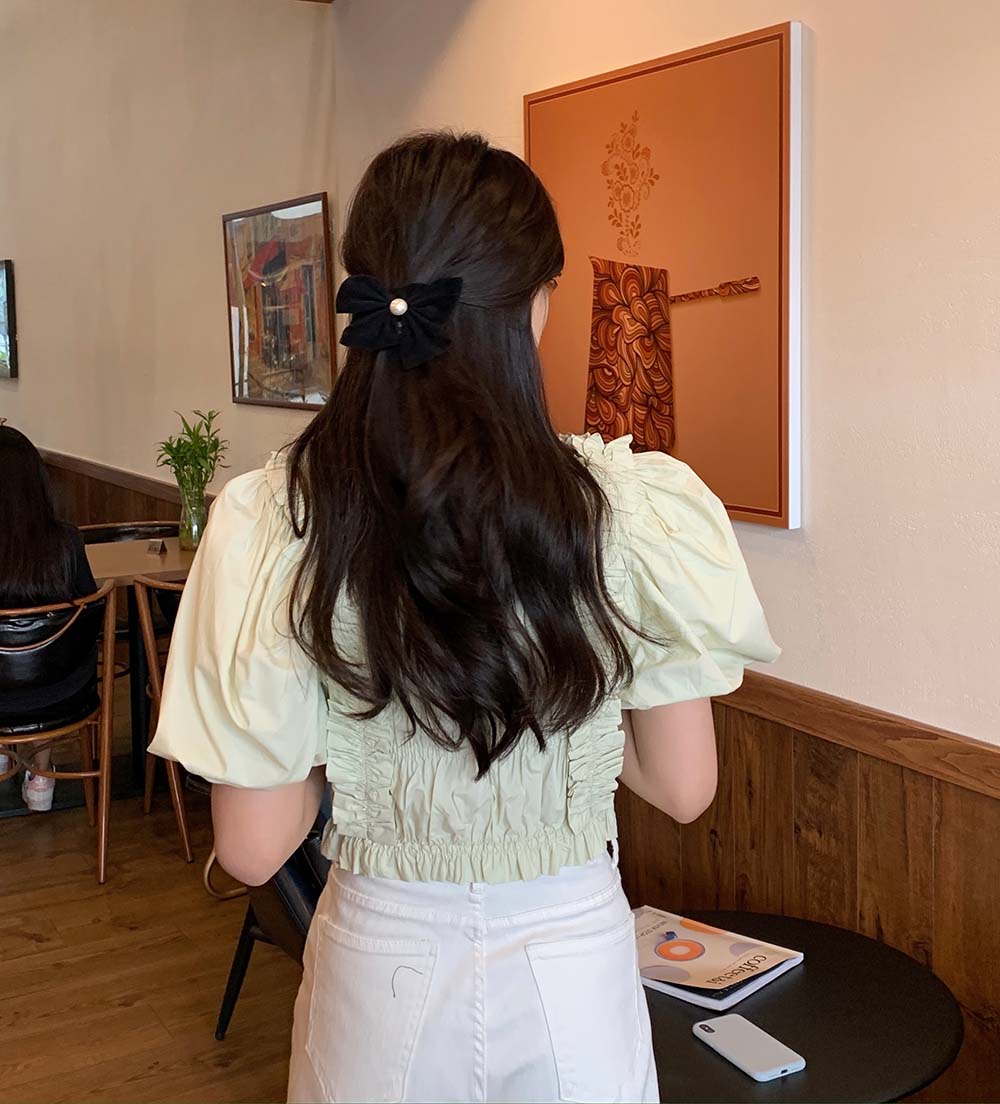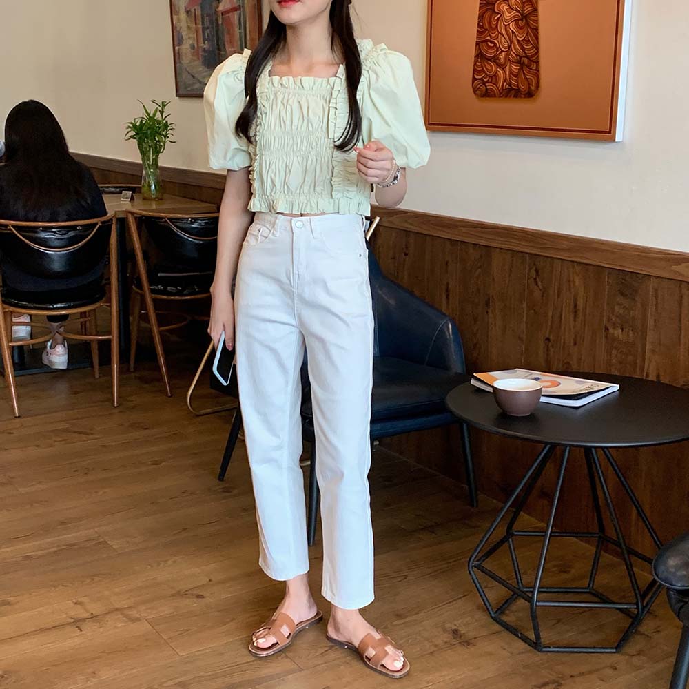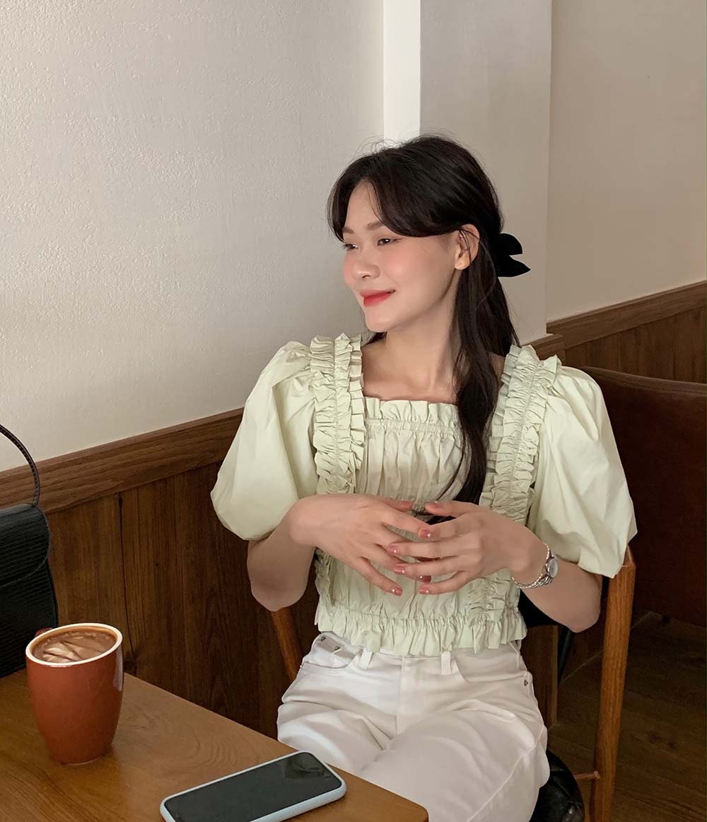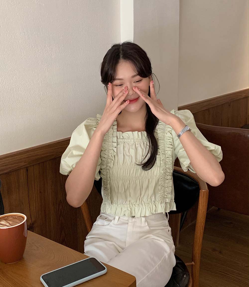 实拍 复古小众设计方领泡泡袖短版小件衬衫