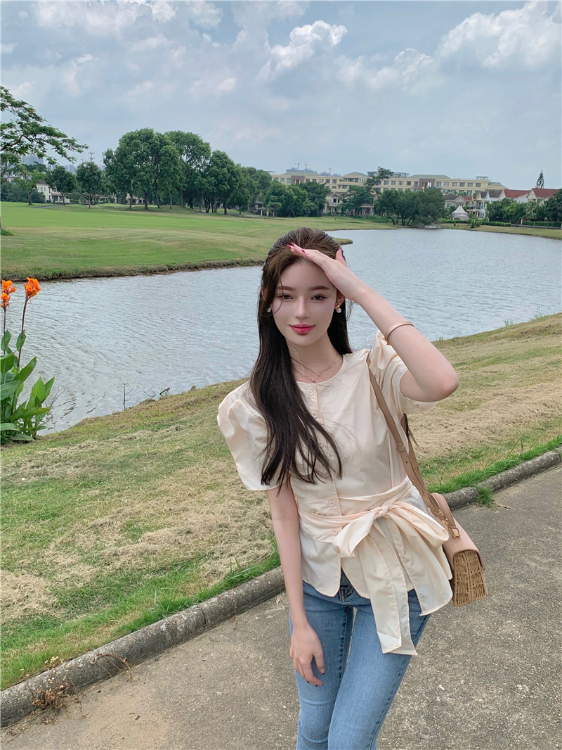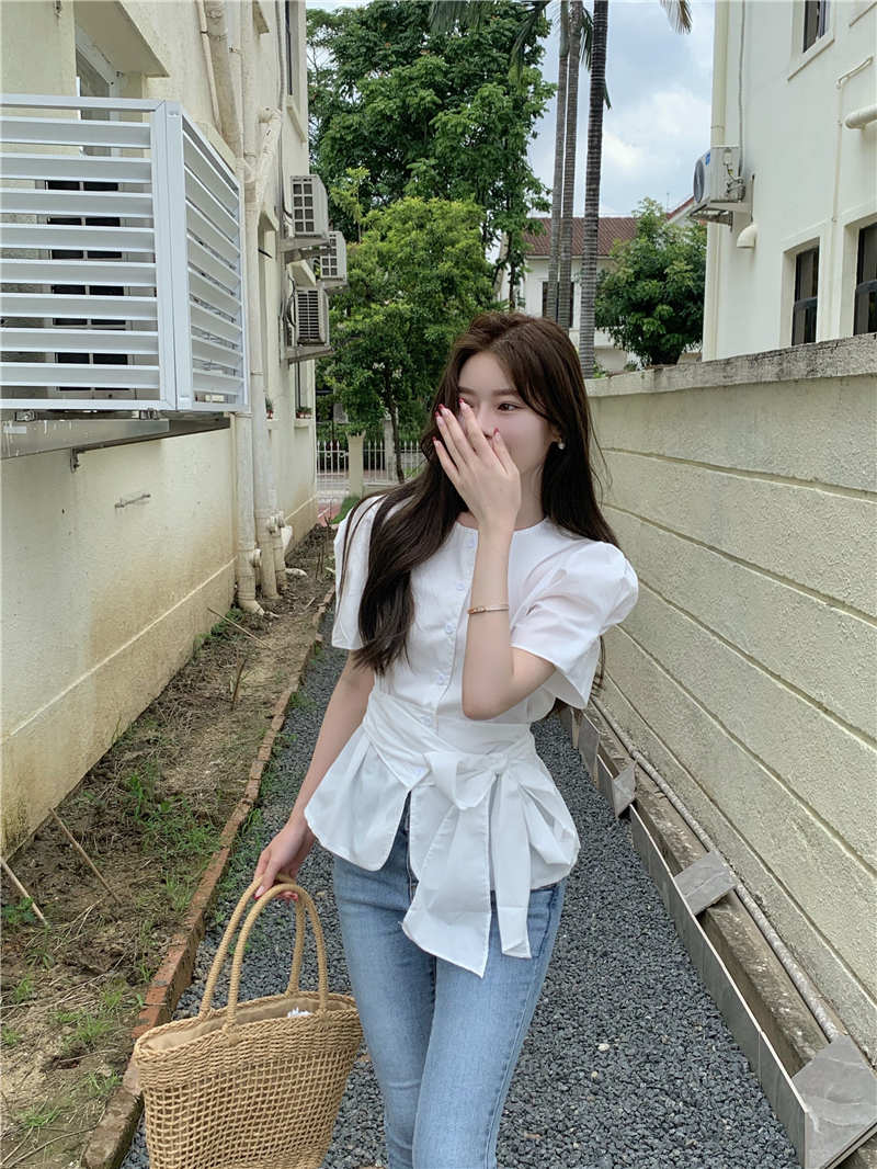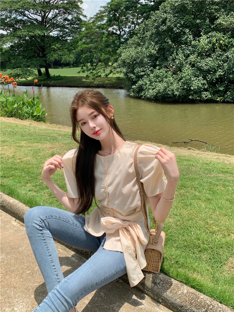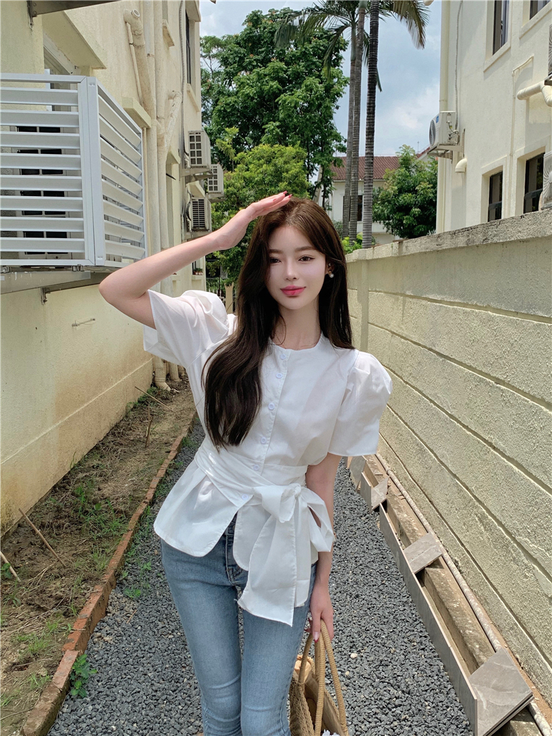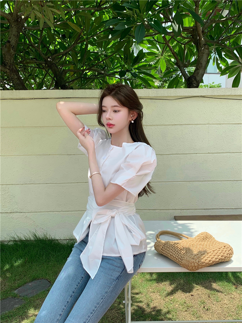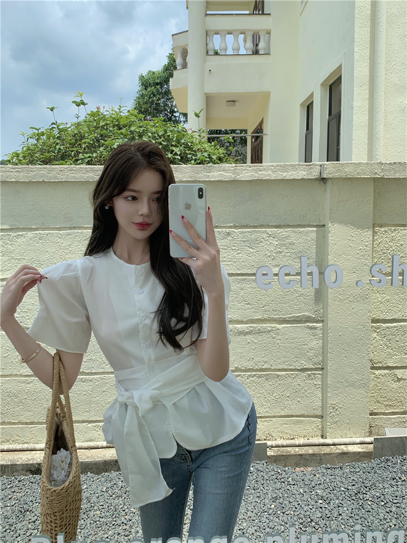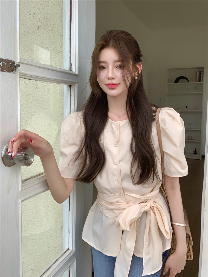 实拍实价 气质排扣圆领系带收腰显瘦泡泡袖衬衫