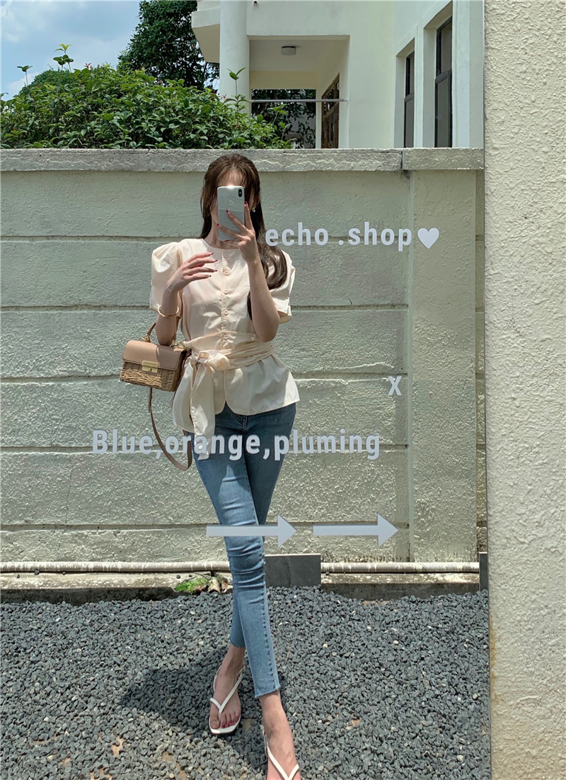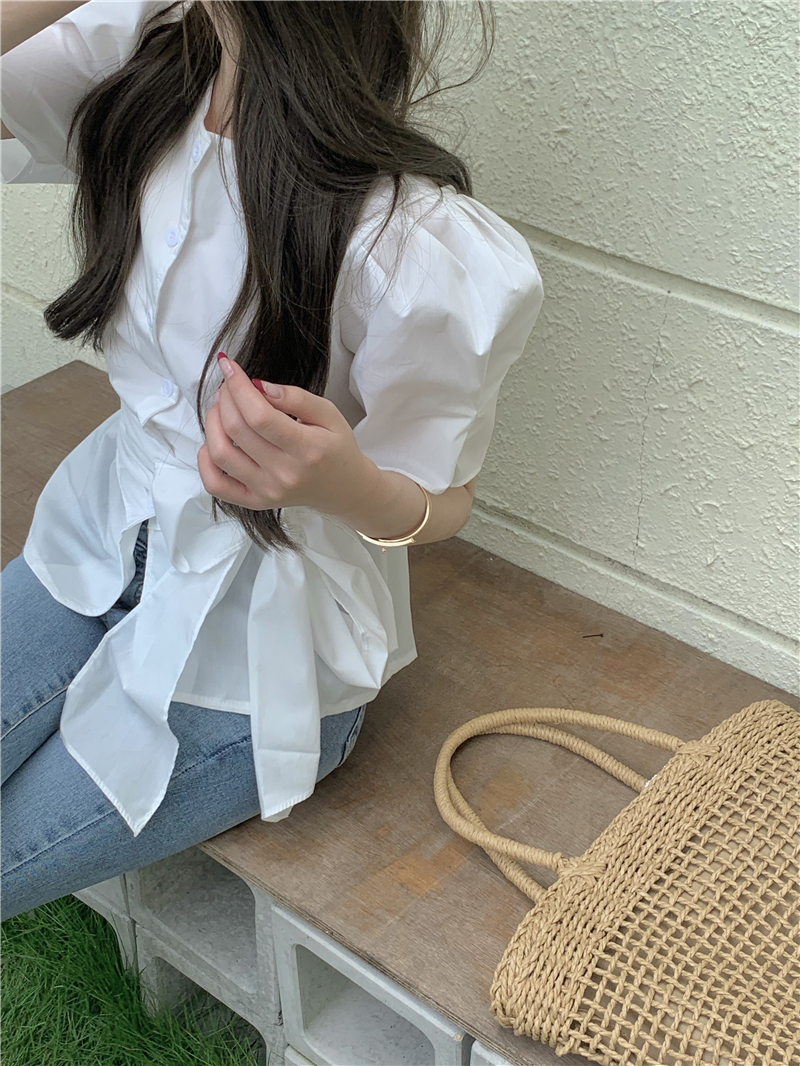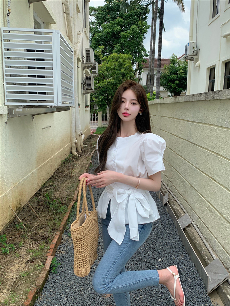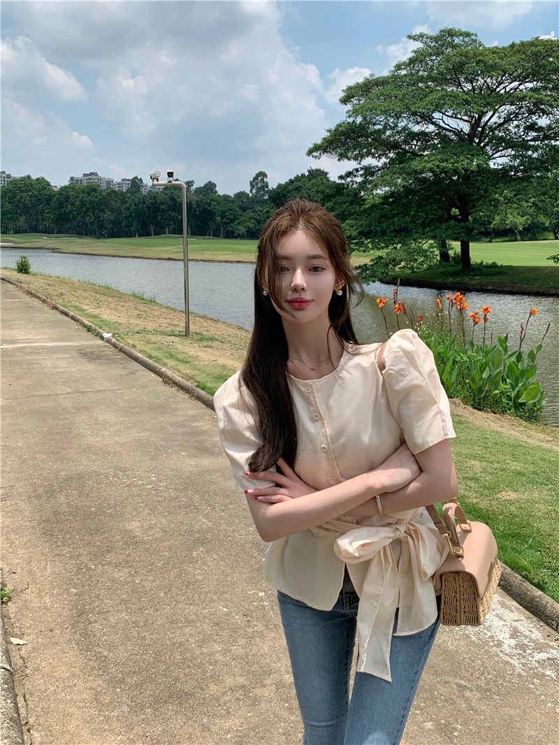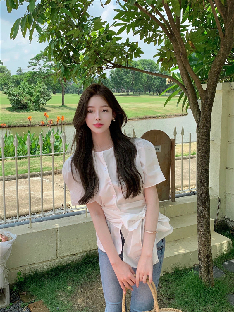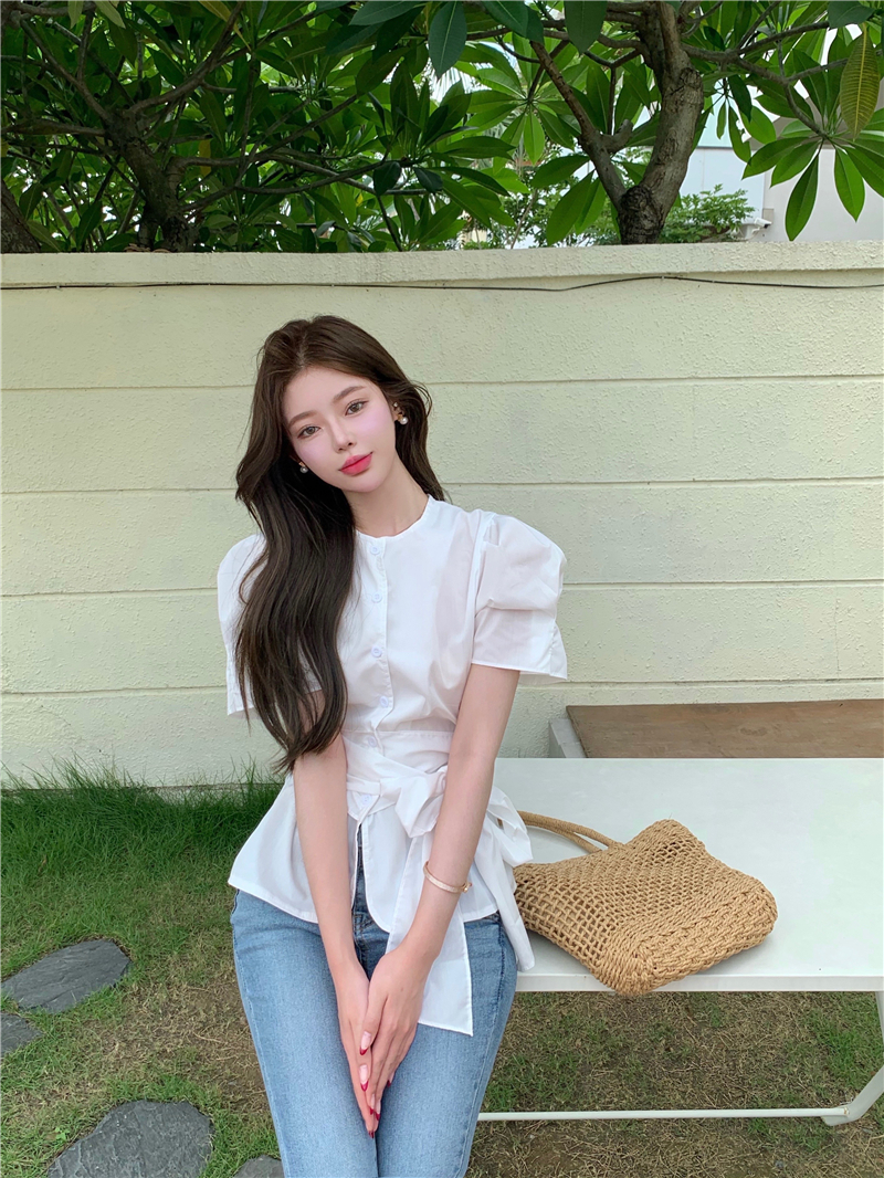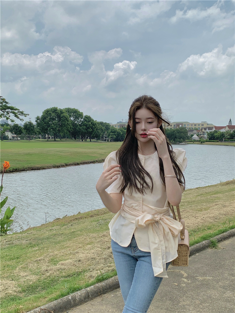 实拍实价 气质排扣圆领系带收腰显瘦泡泡袖衬衫