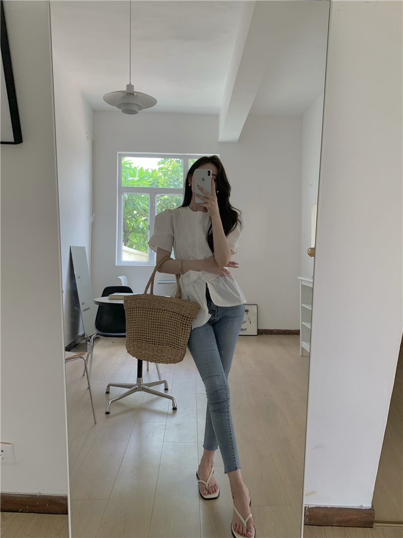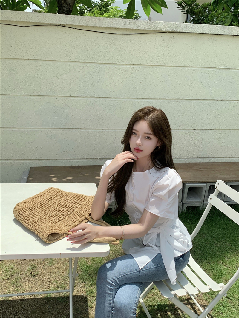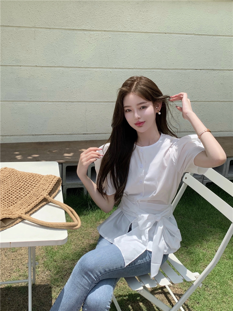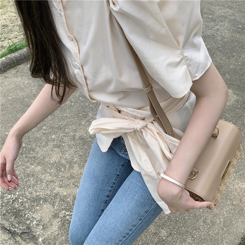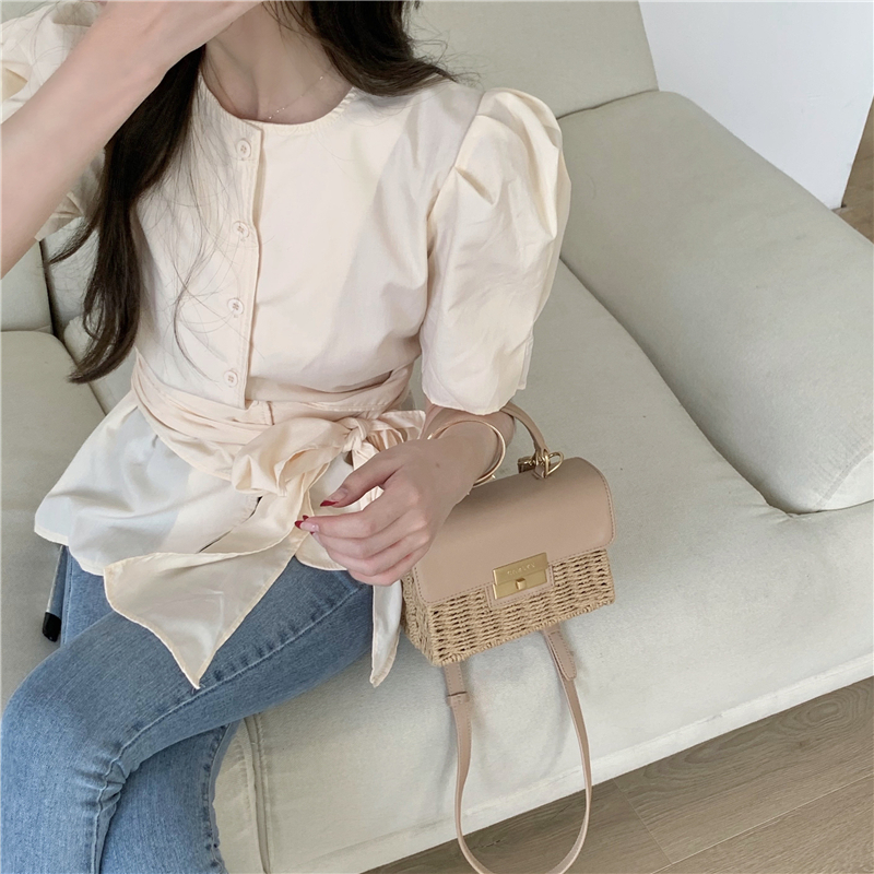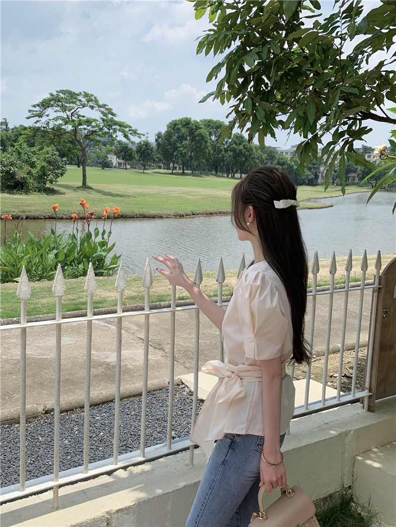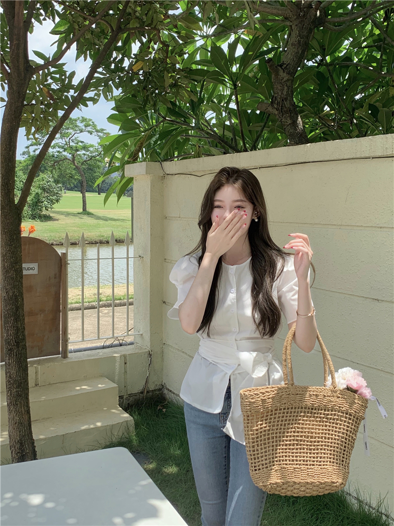 实拍实价 气质排扣圆领系带收腰显瘦泡泡袖衬衫