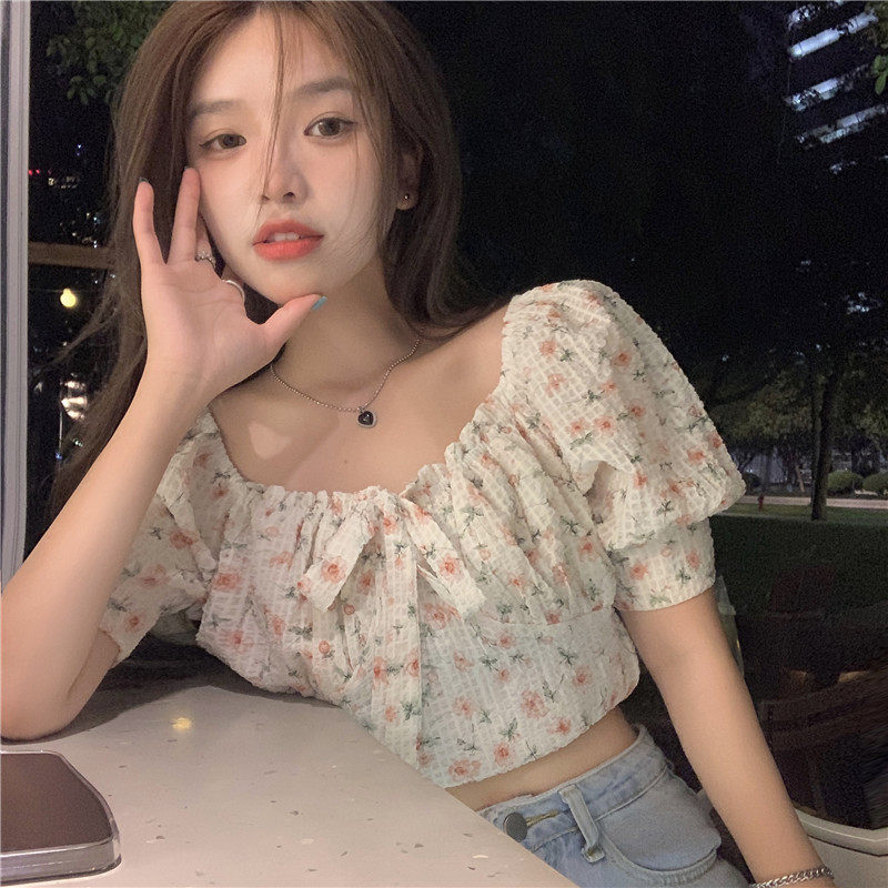 实拍实价碎花一字领拿辣妹风设计感小众碎花上衣