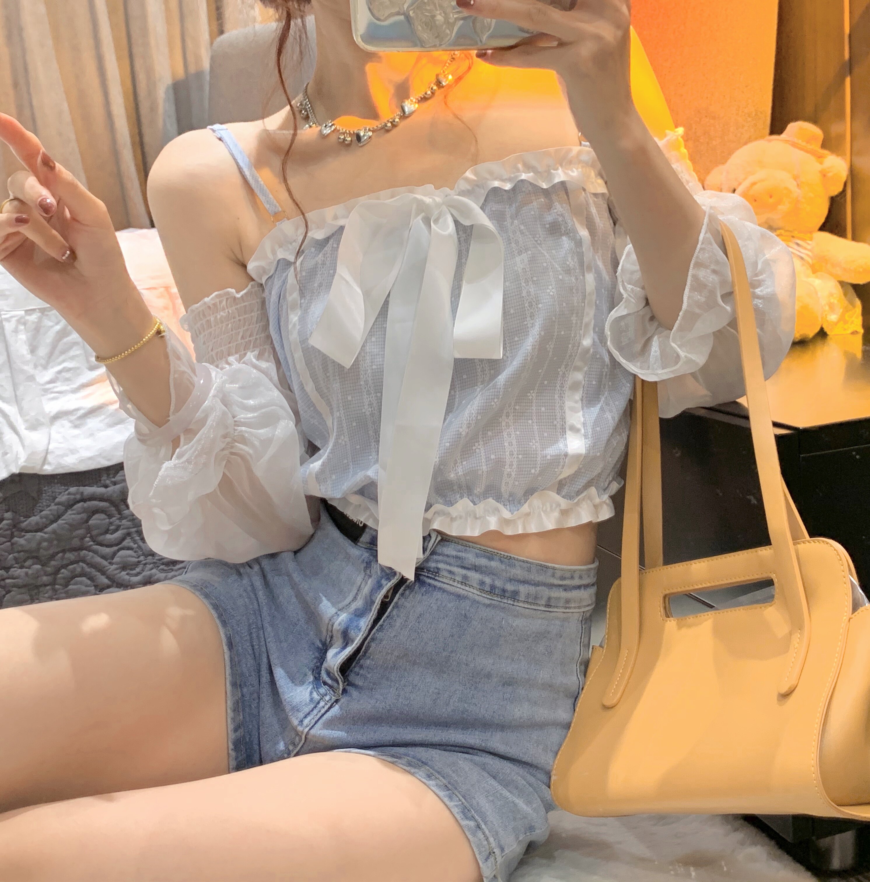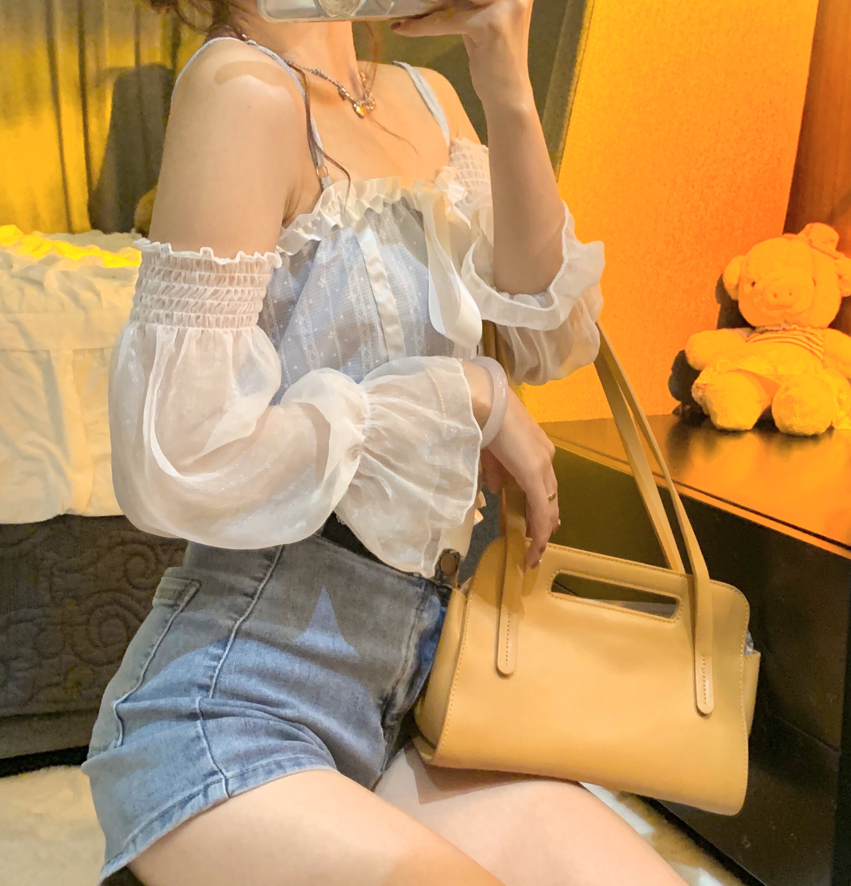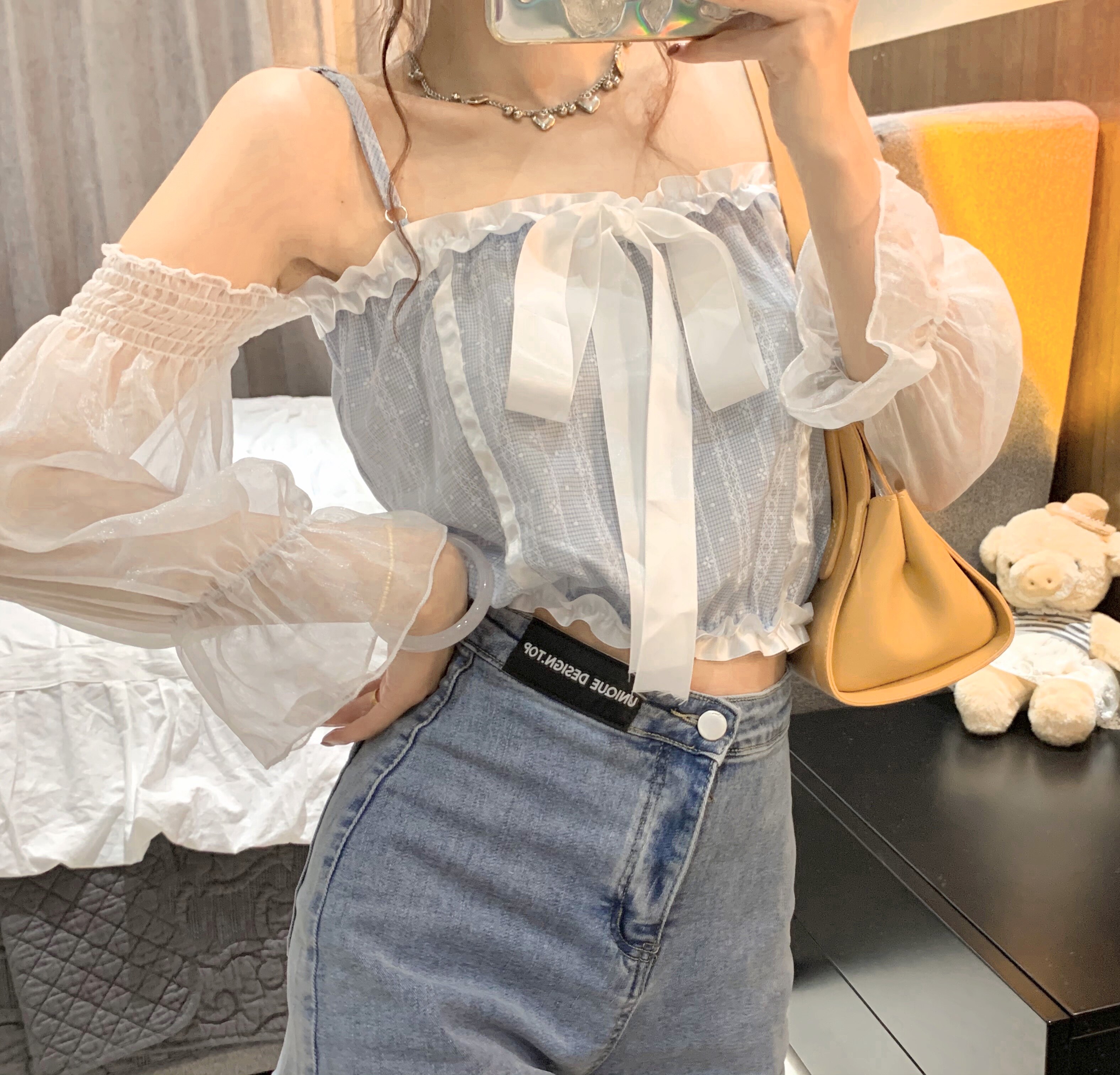 时尚衣都实拍实价~一字肩吊带设计网纱上衣